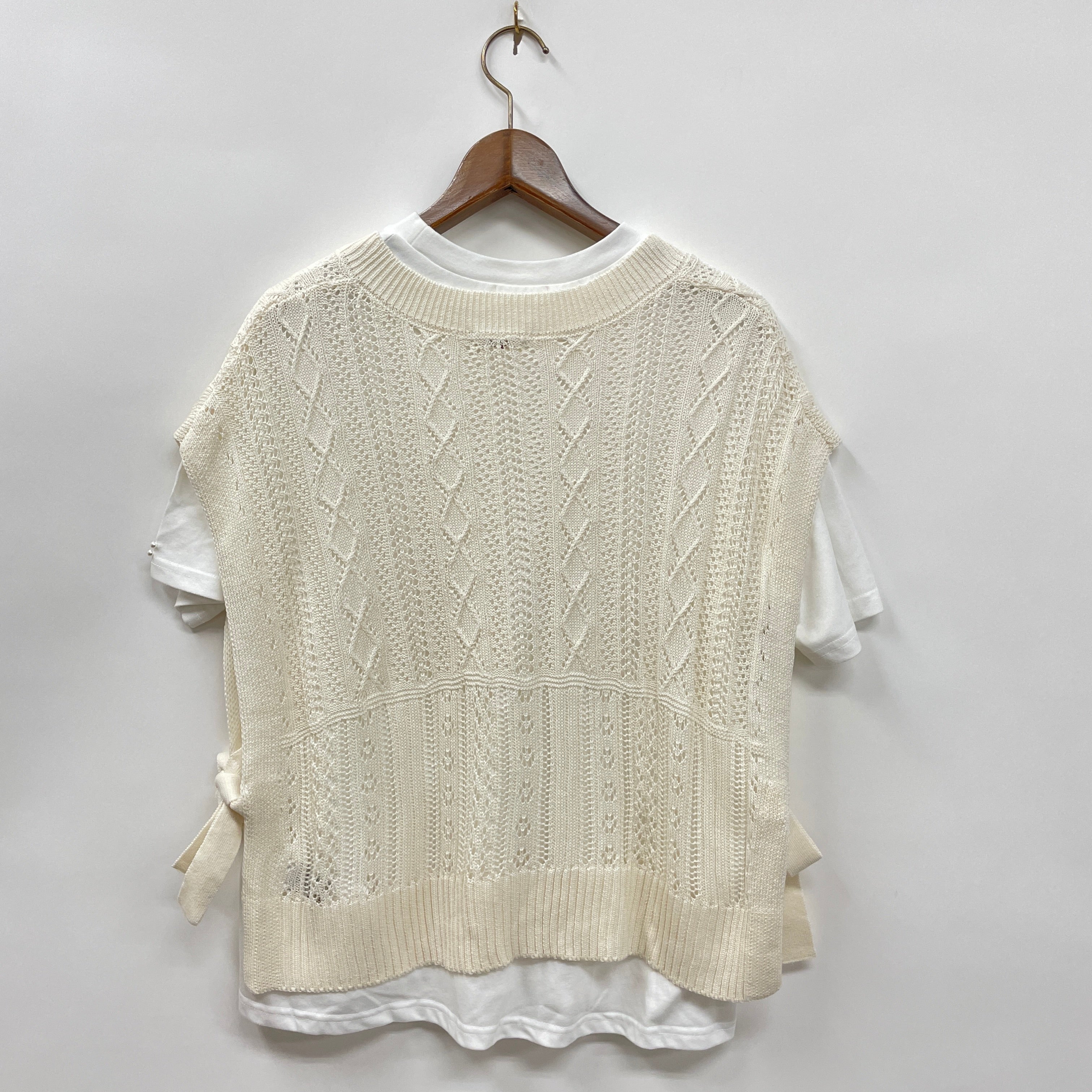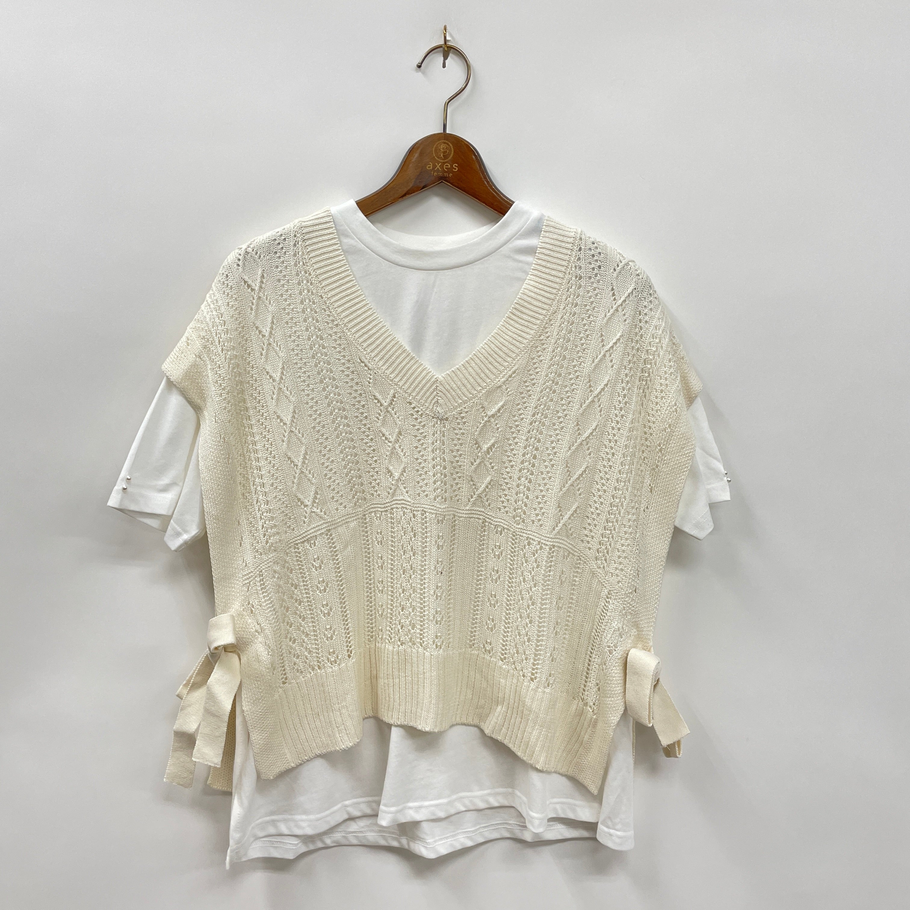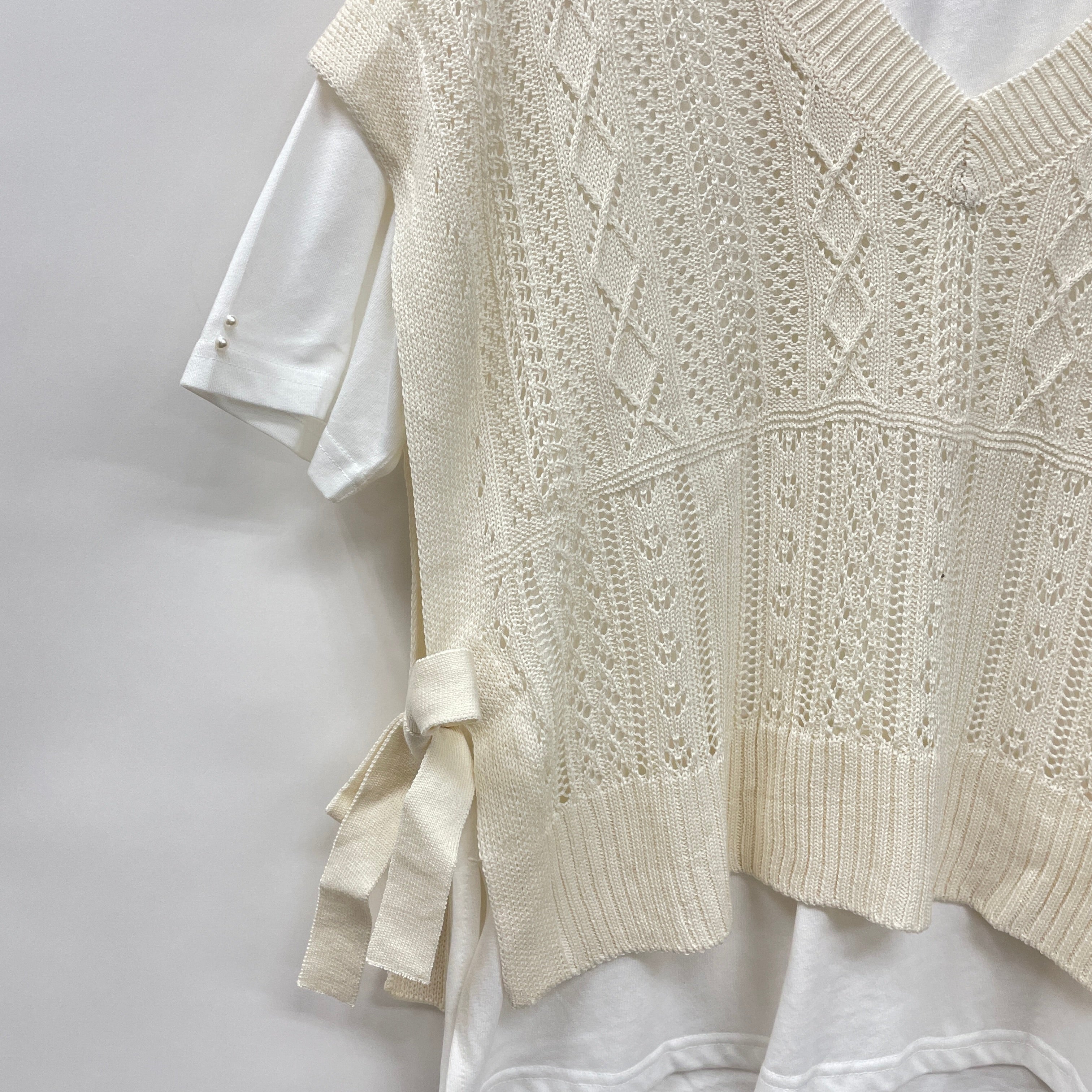 透かし編みのニットベストとカットPOのアンサンブルです。