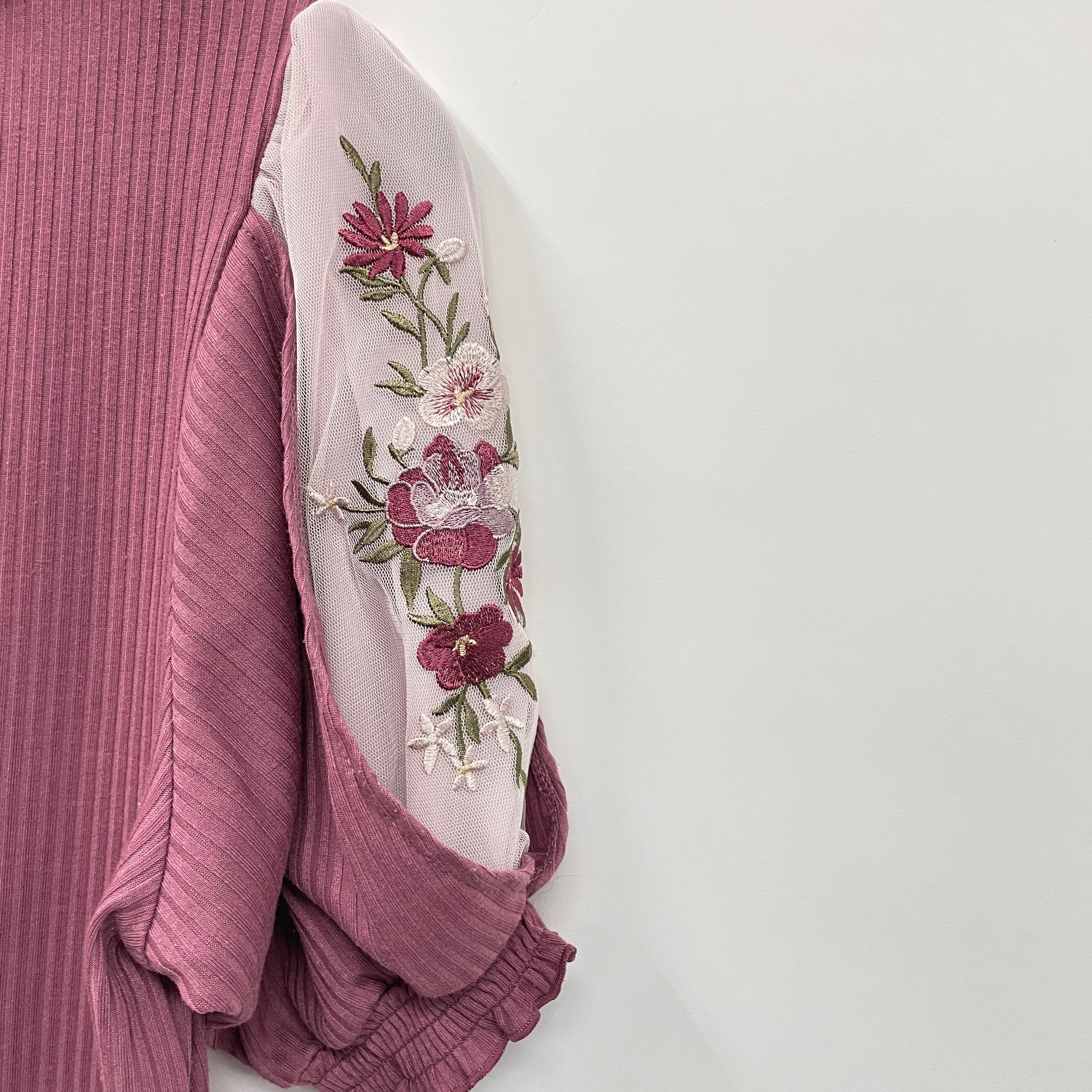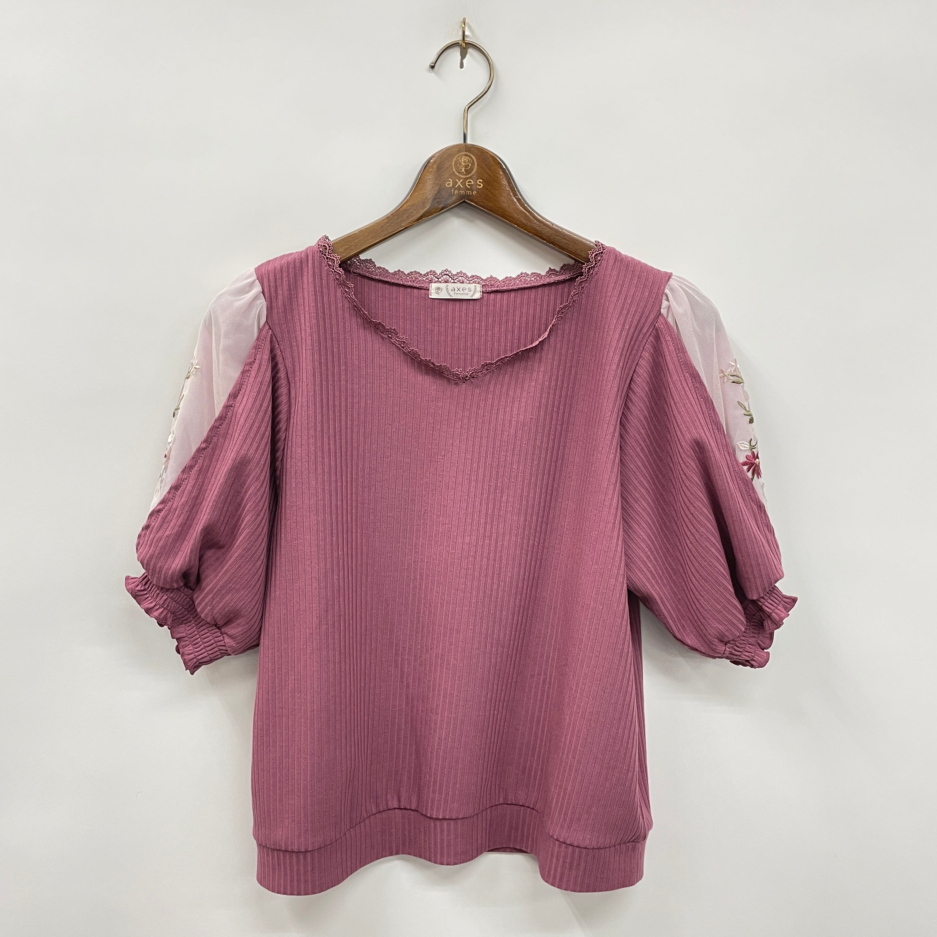 チュールとシフォンの重なったデザインと華やかな刺繍デザインの袖がポイントのトップスです。リブ素材で伸縮性が良く、袖もシャーリングで着心地の良いアイテム。