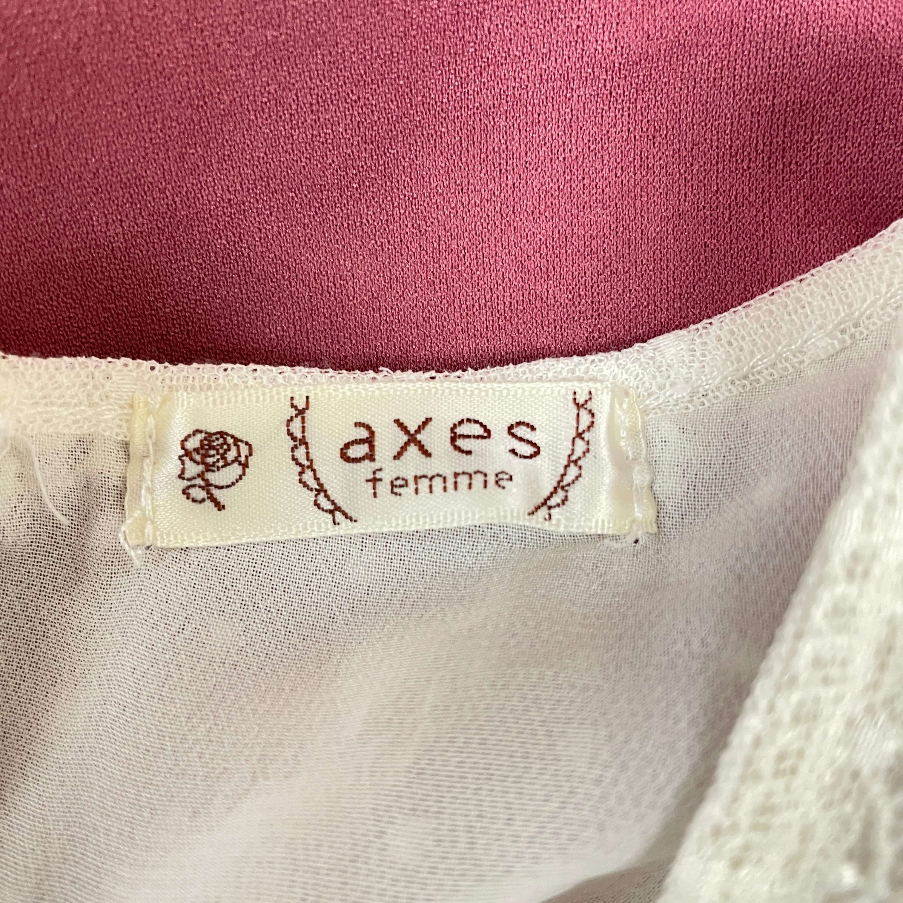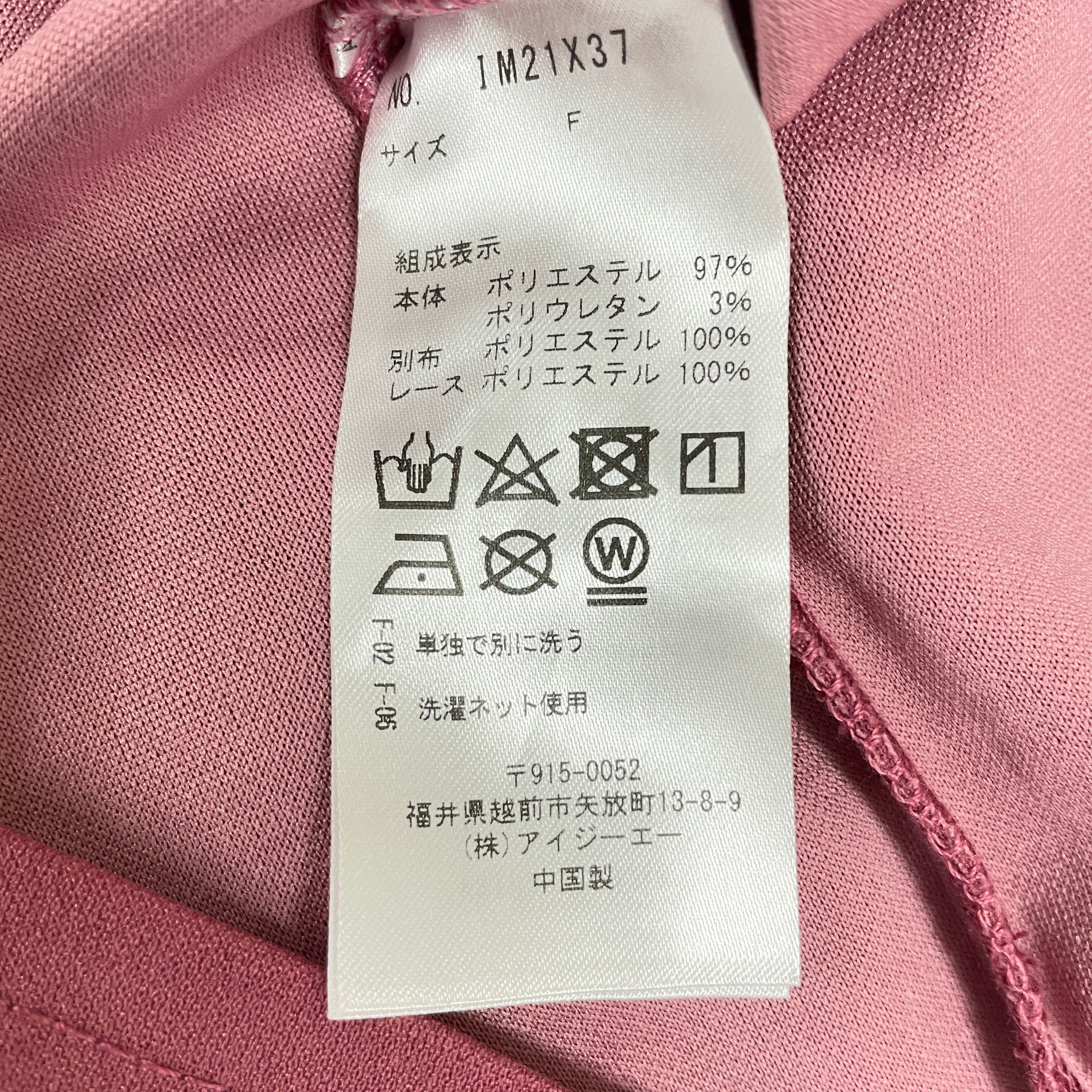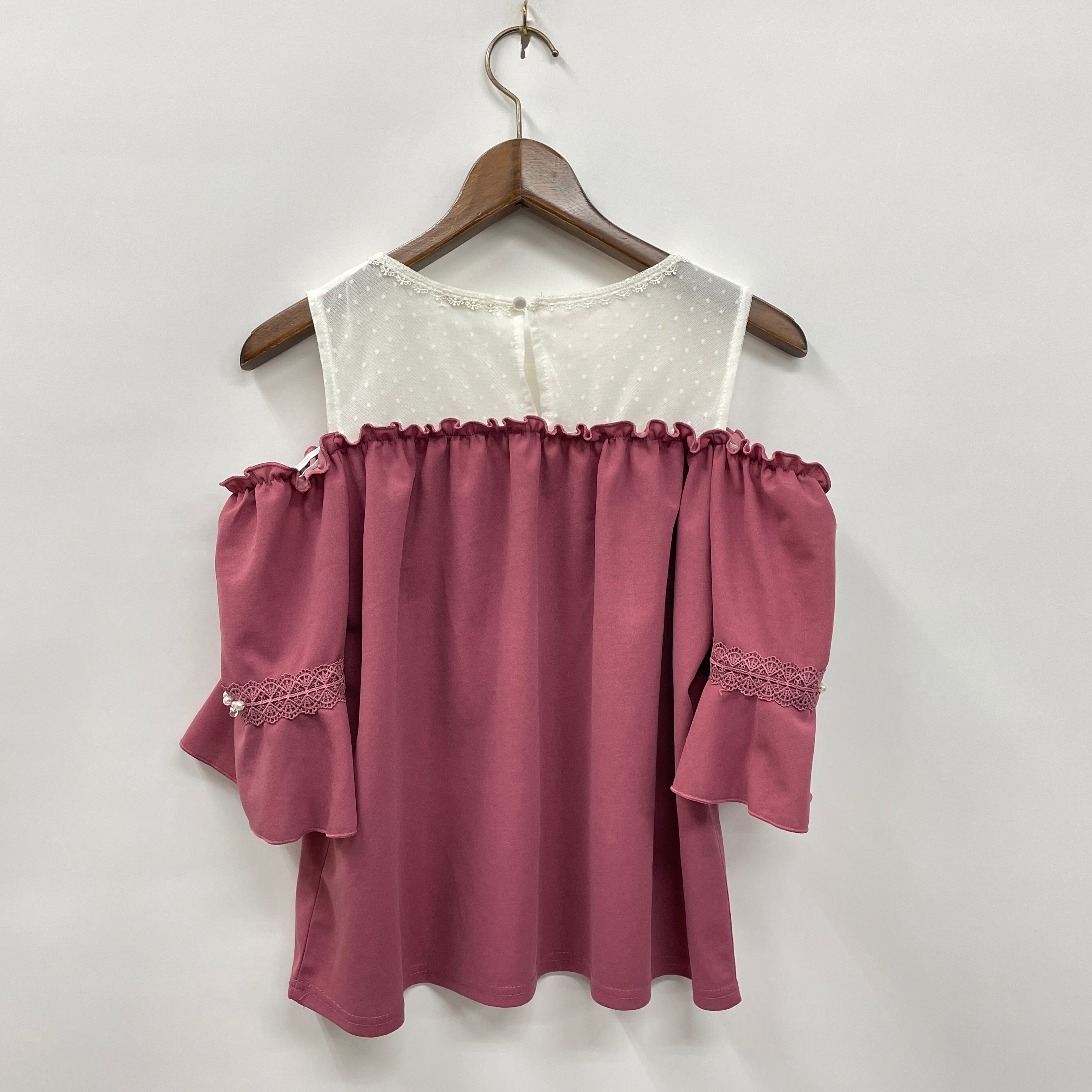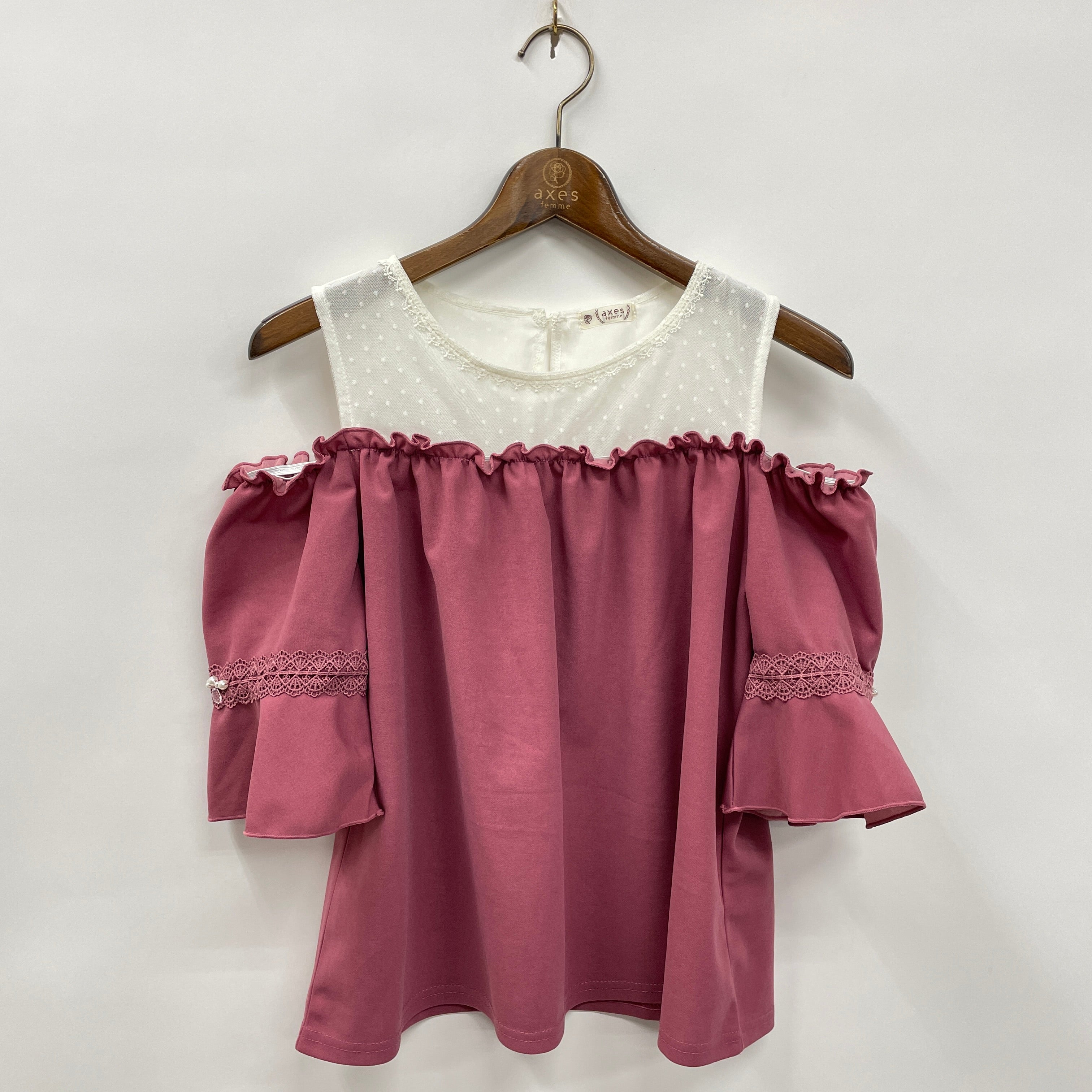 襟ぐりにはナイロンレースをさりげなく挟み込み、袖には存在感のあるケミカルレースを重ね、フェミニン感をプラス。