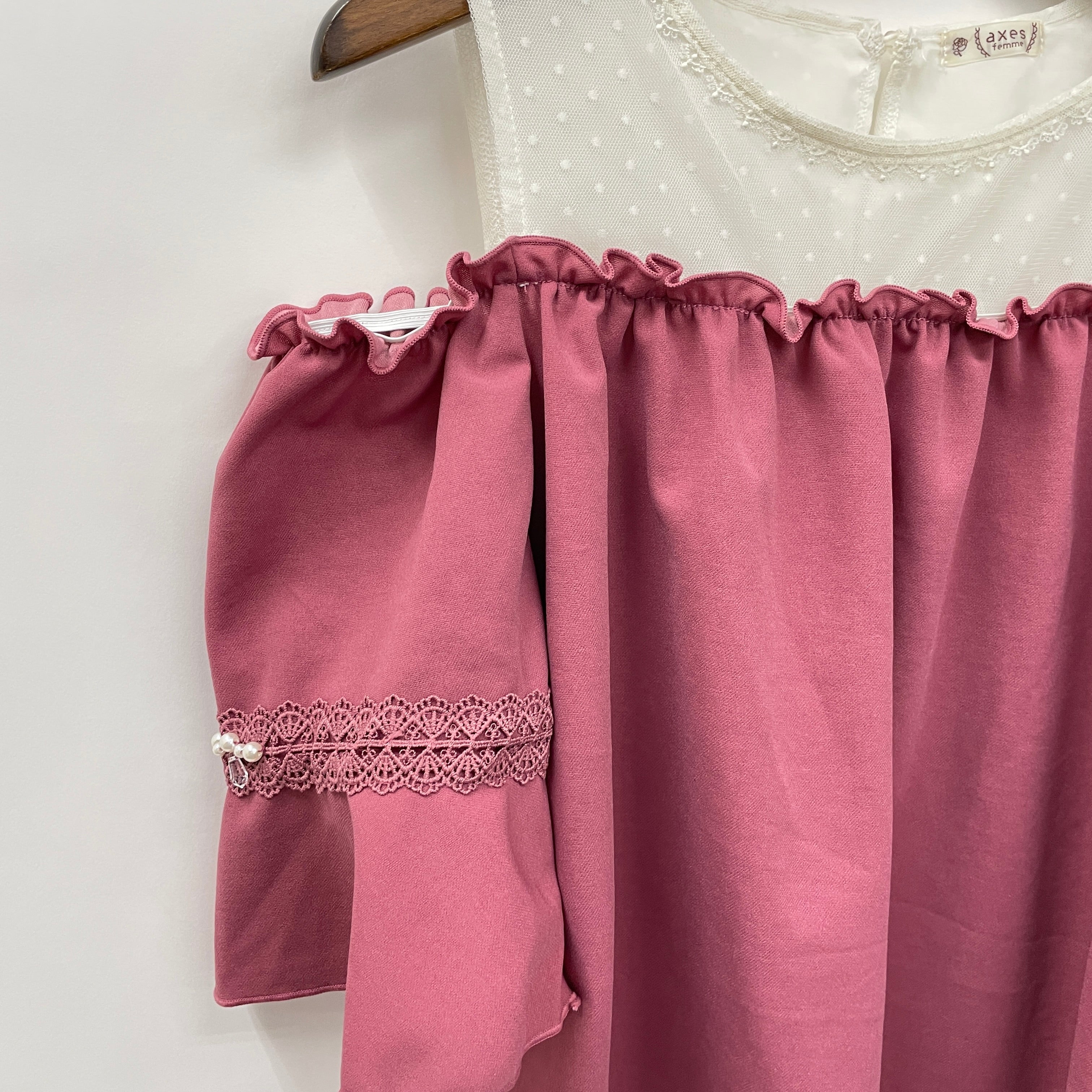 肩はシアー感のあるドットチュールとシフォンを重ね、身頃は伸縮性の良いカットジョーゼットを使用。