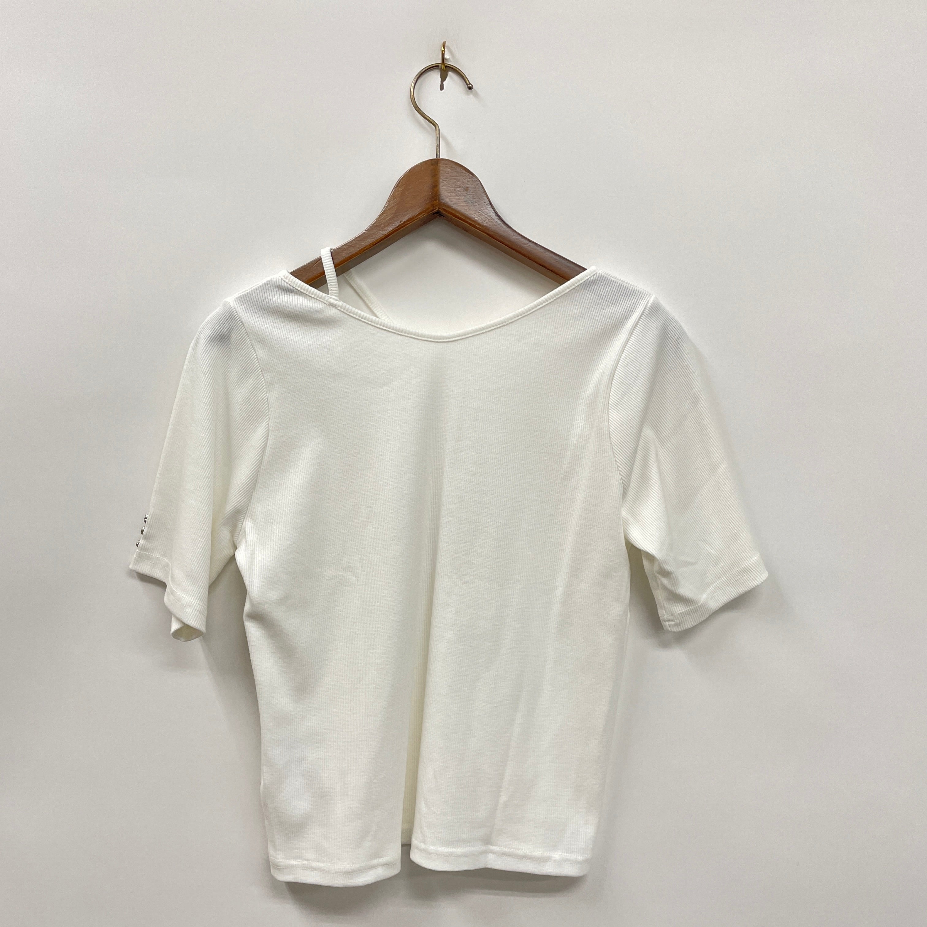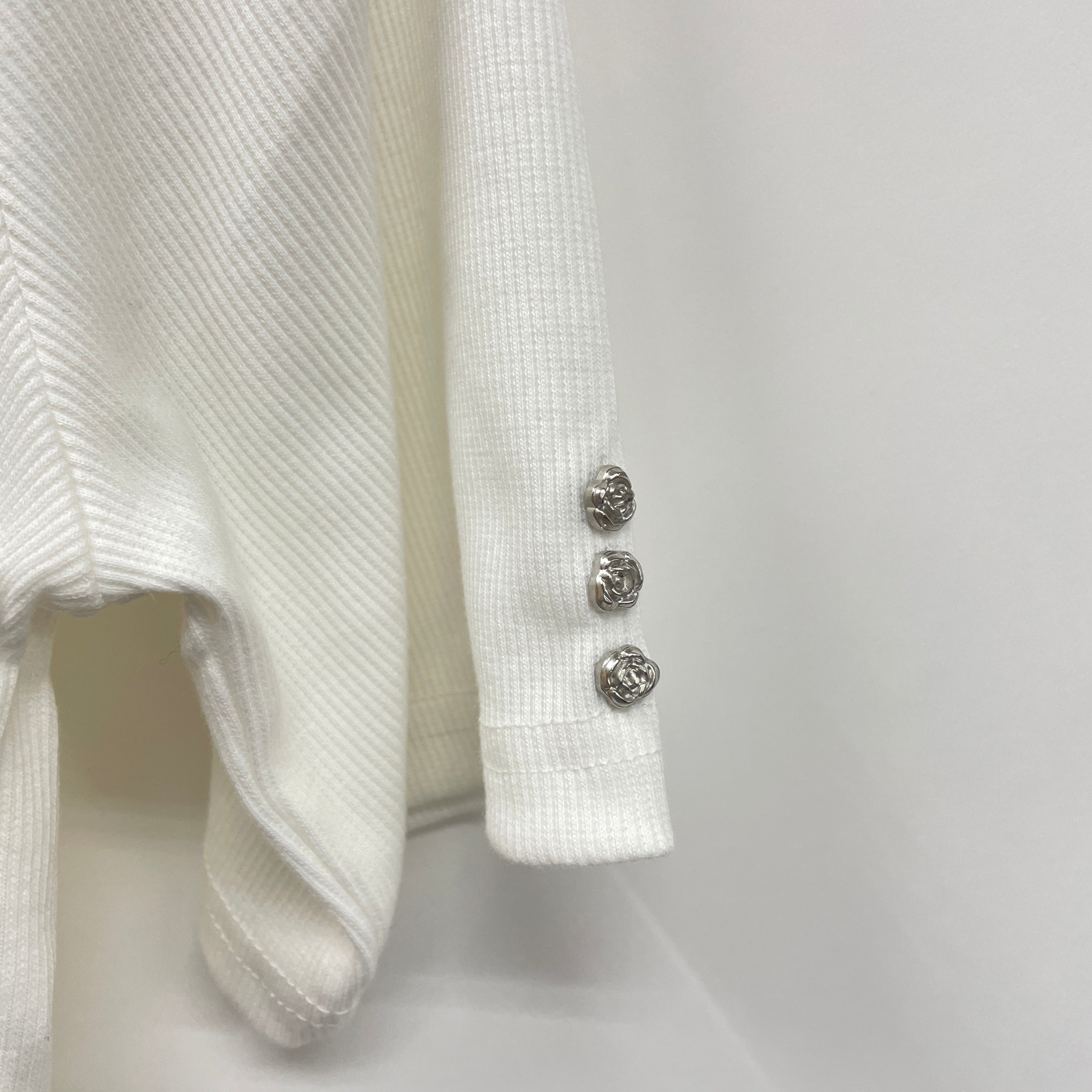 伸縮性のあるリブ素材を使用したトップス。上半身をすっきりと魅せるシルエットが◎。
