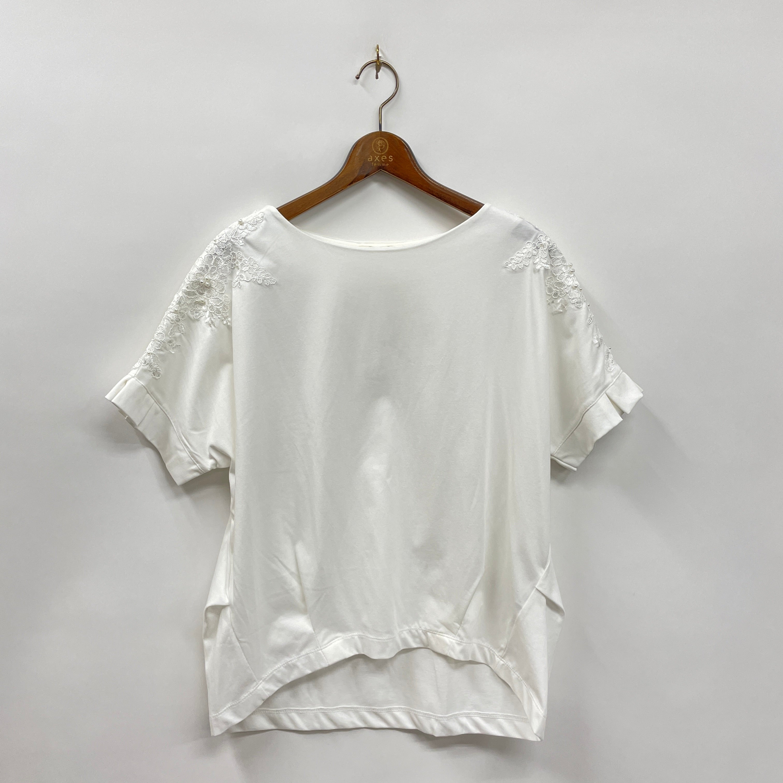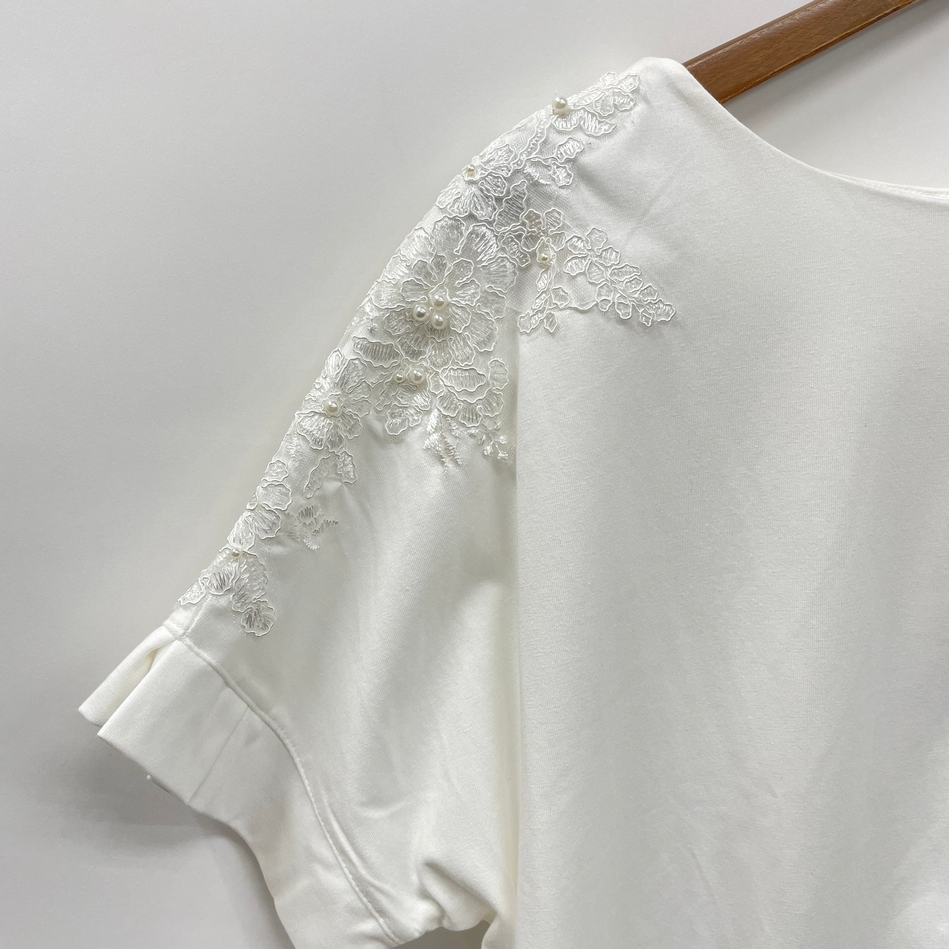 肩にあしらわれた存在感のある華やかなフラワーレースがポイントのドルマンプルオーバーです。