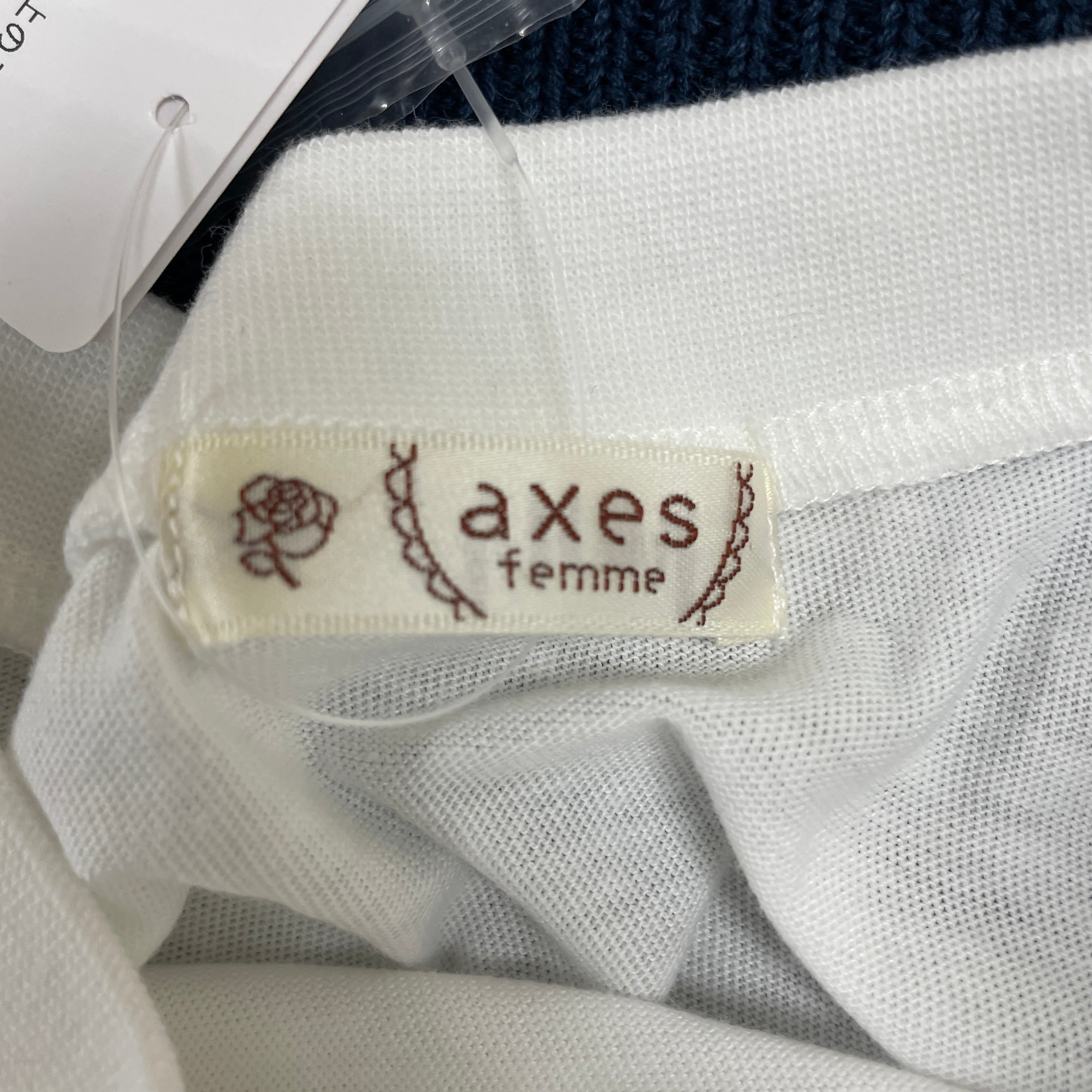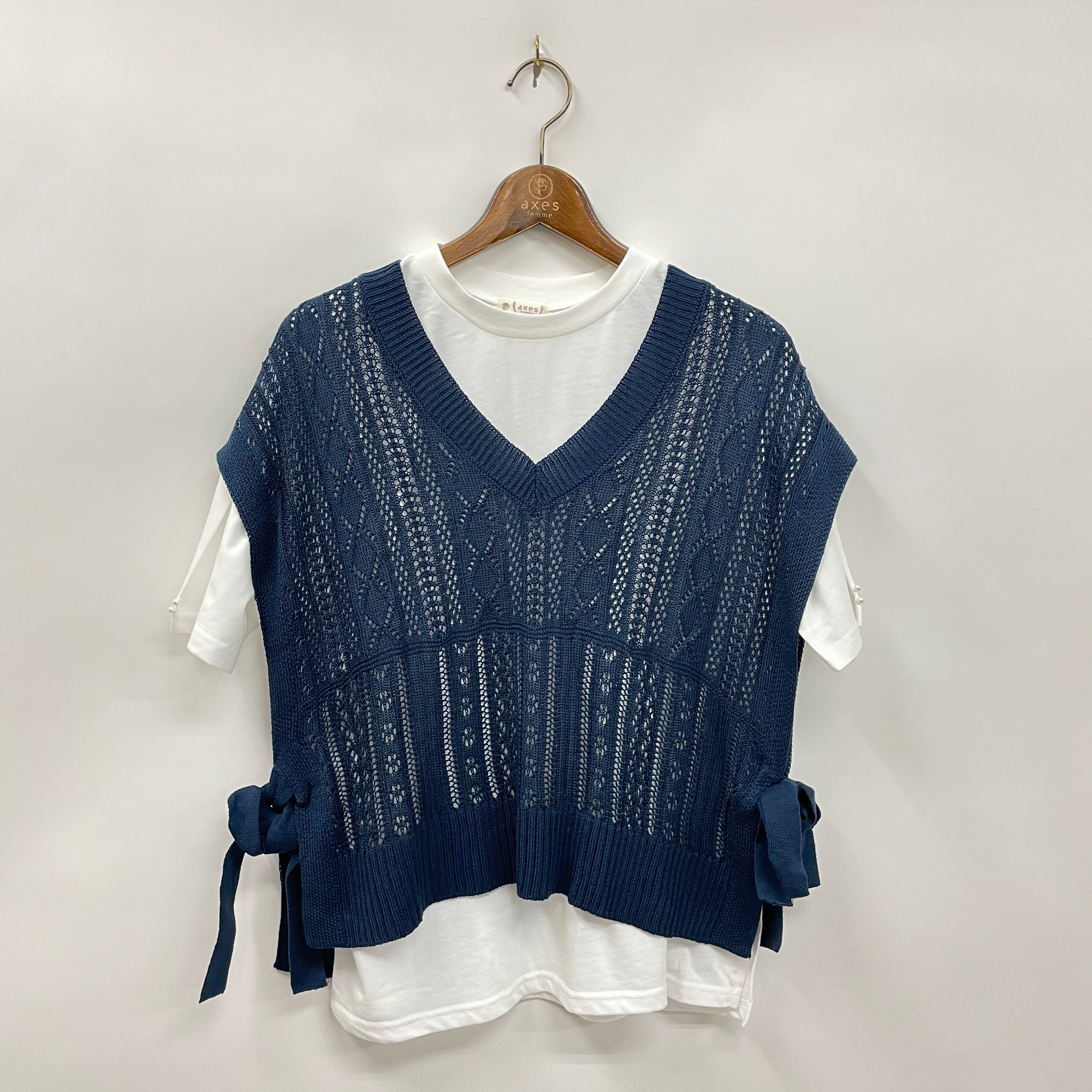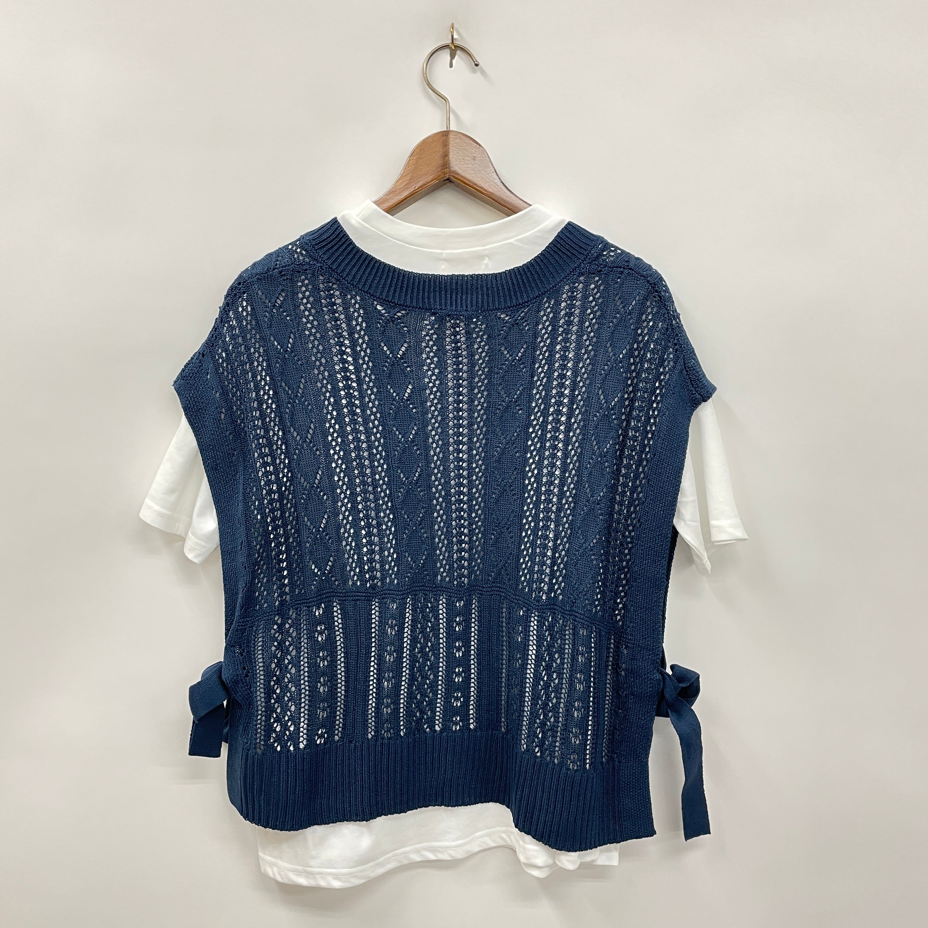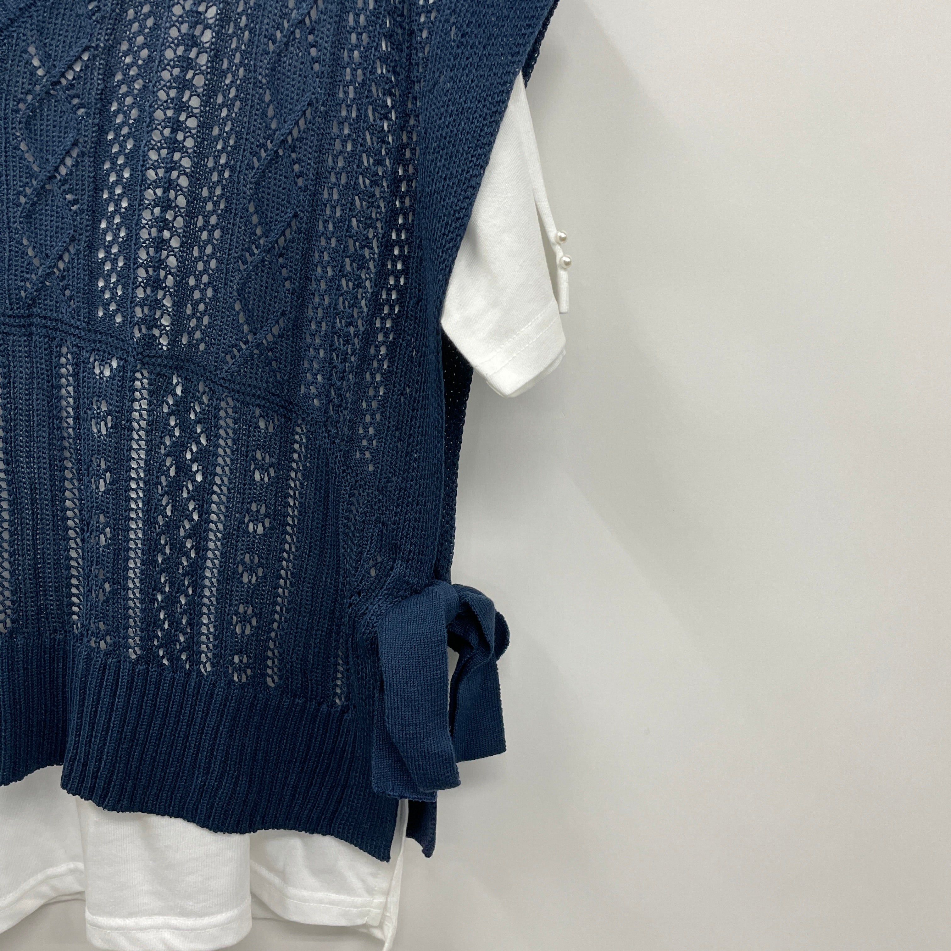 透かし編みのニットベストとカットPOのアンサンブルです。