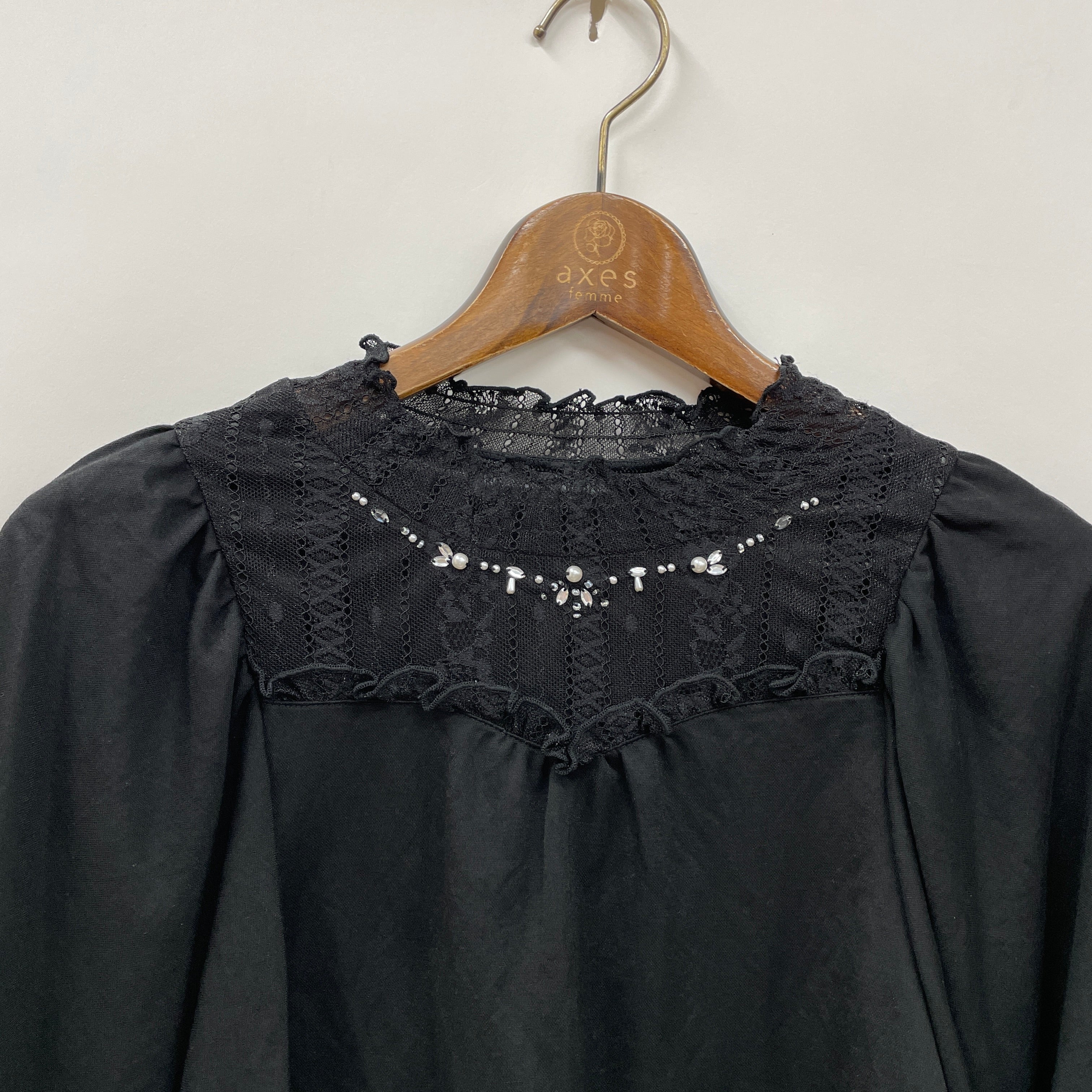 ビスチェ風切替にフリル使い、繊細なレース生地のヨークデザインがエレガント。