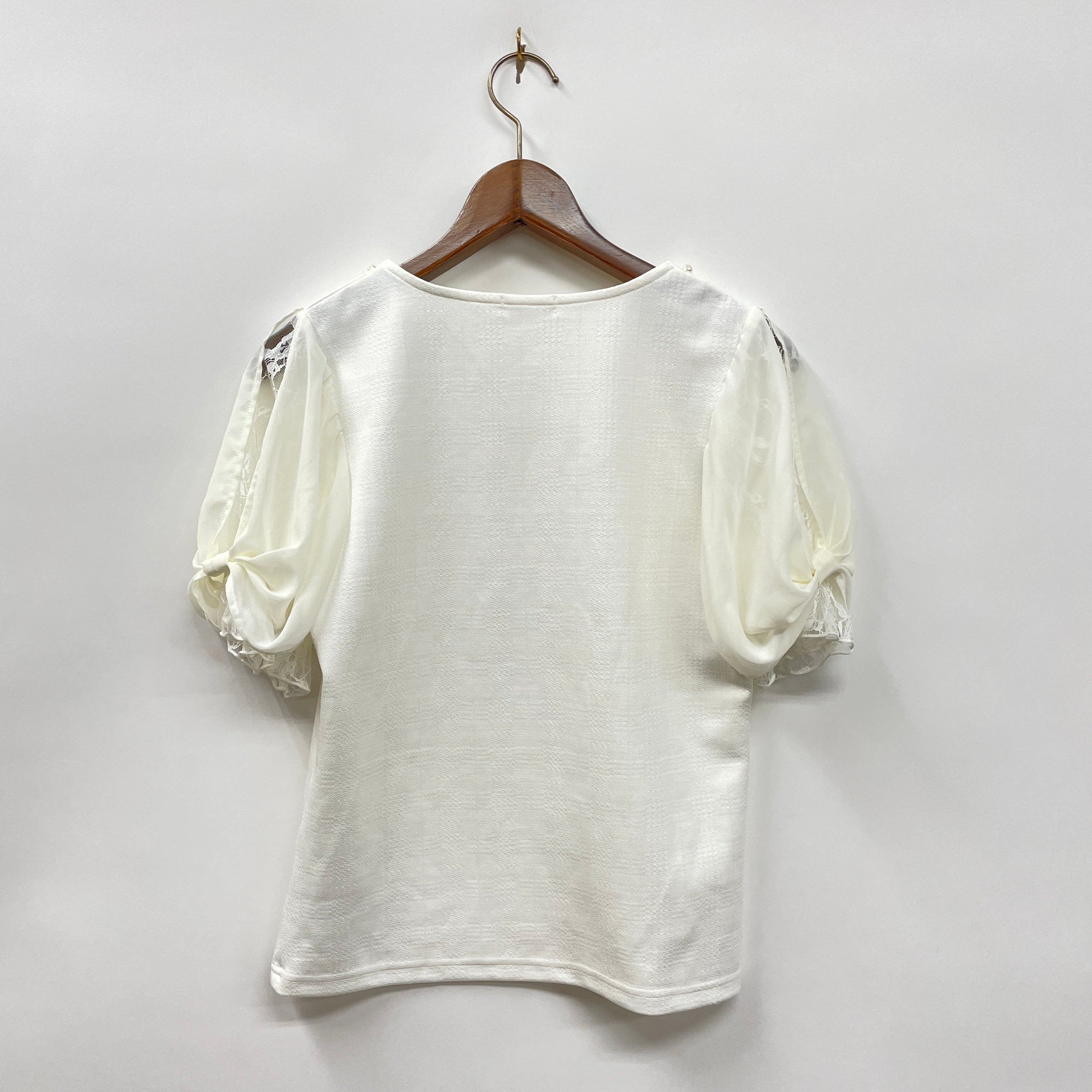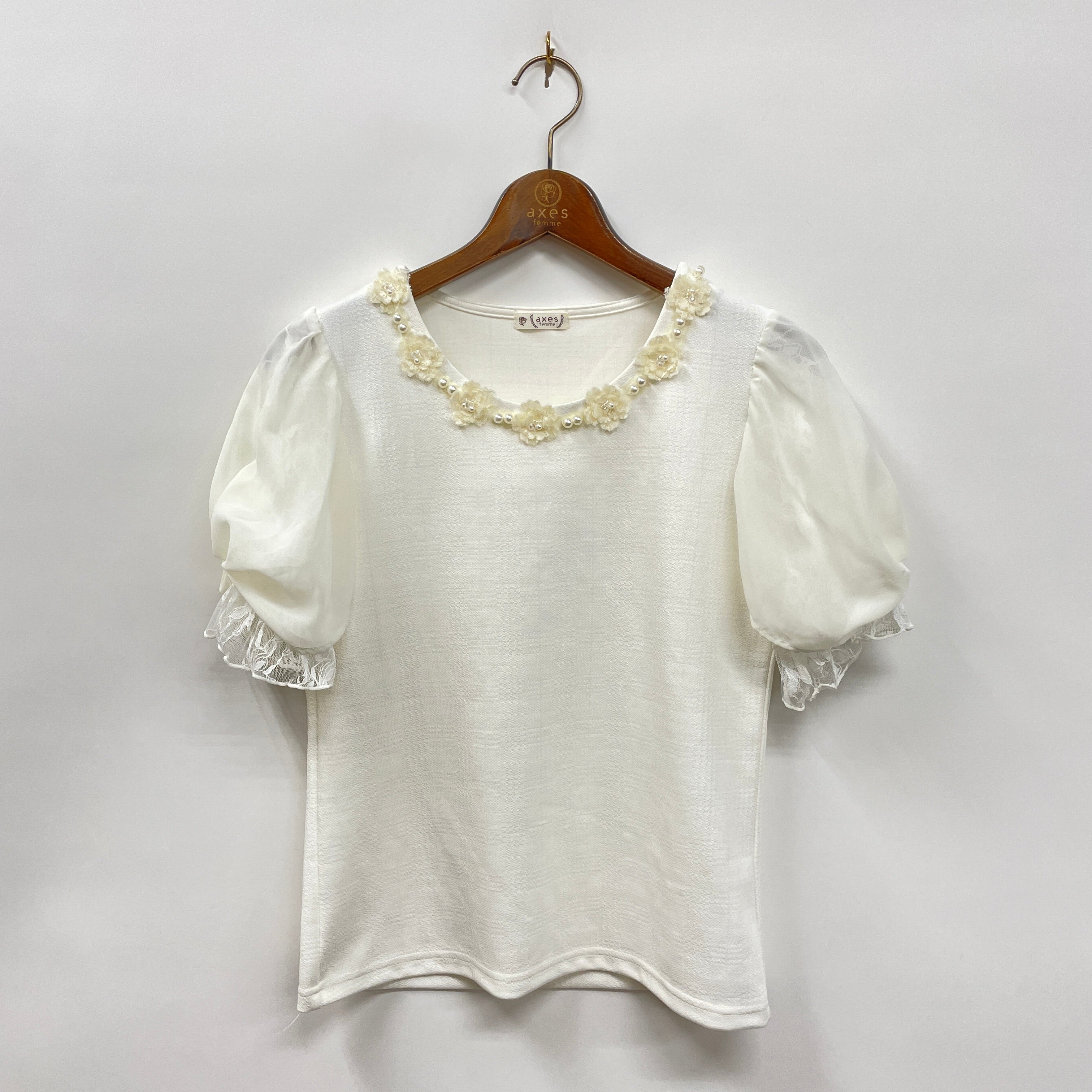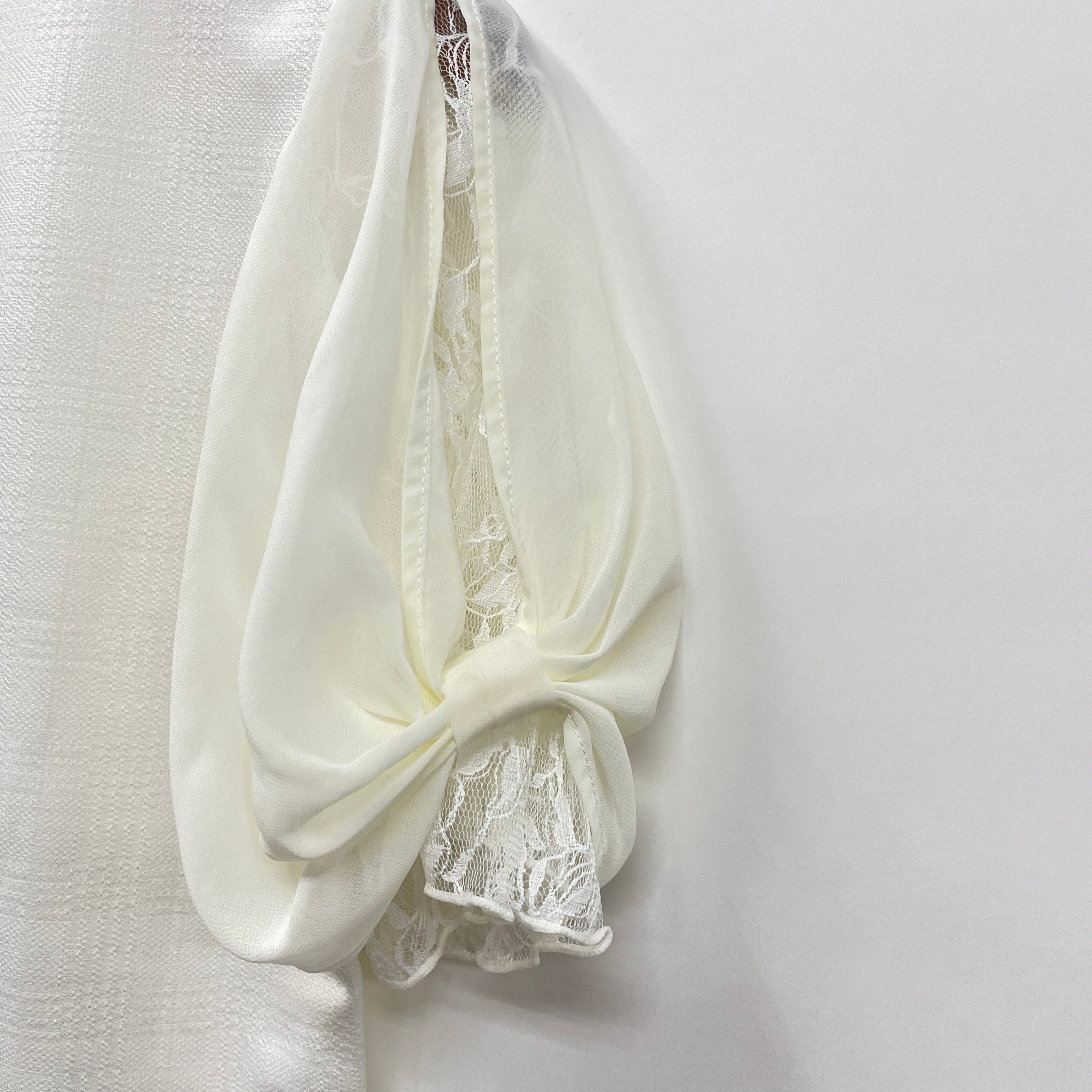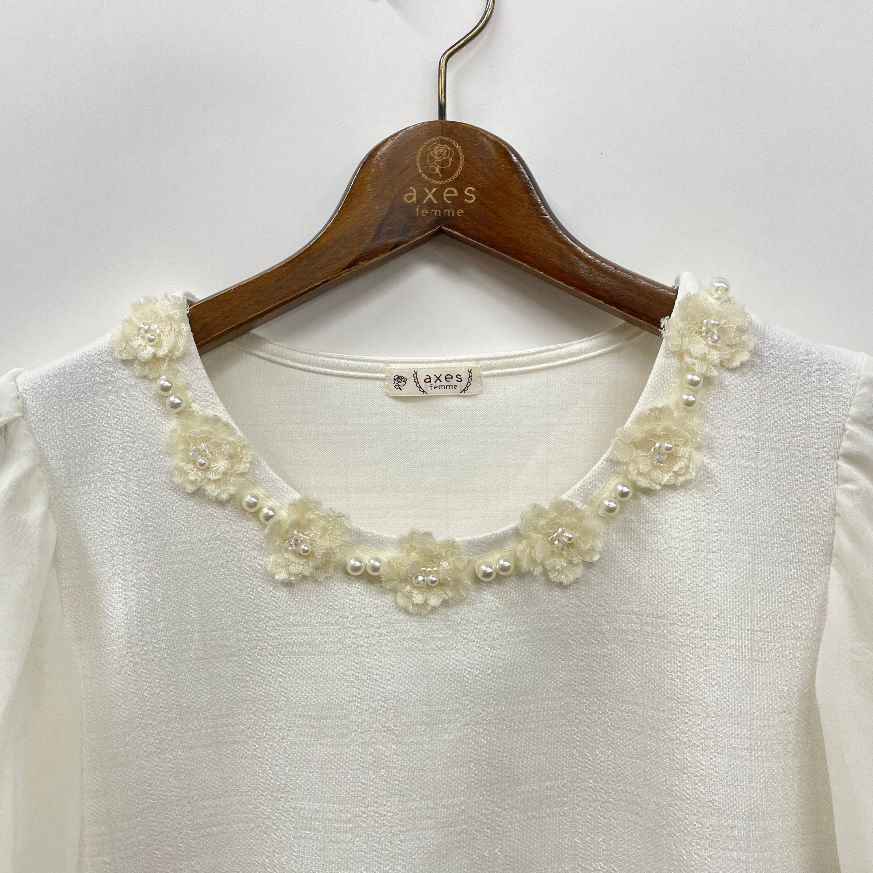 オリジナルのチェック柄のカットジャガード生地を使ったプルオーバーです。リボンデザインの袖で可愛らしい印象に、透け感がありさりげない肌見せ具合が◎。ネックラインのパールやお花モチーフがエレガントな雰囲気を作りだします。