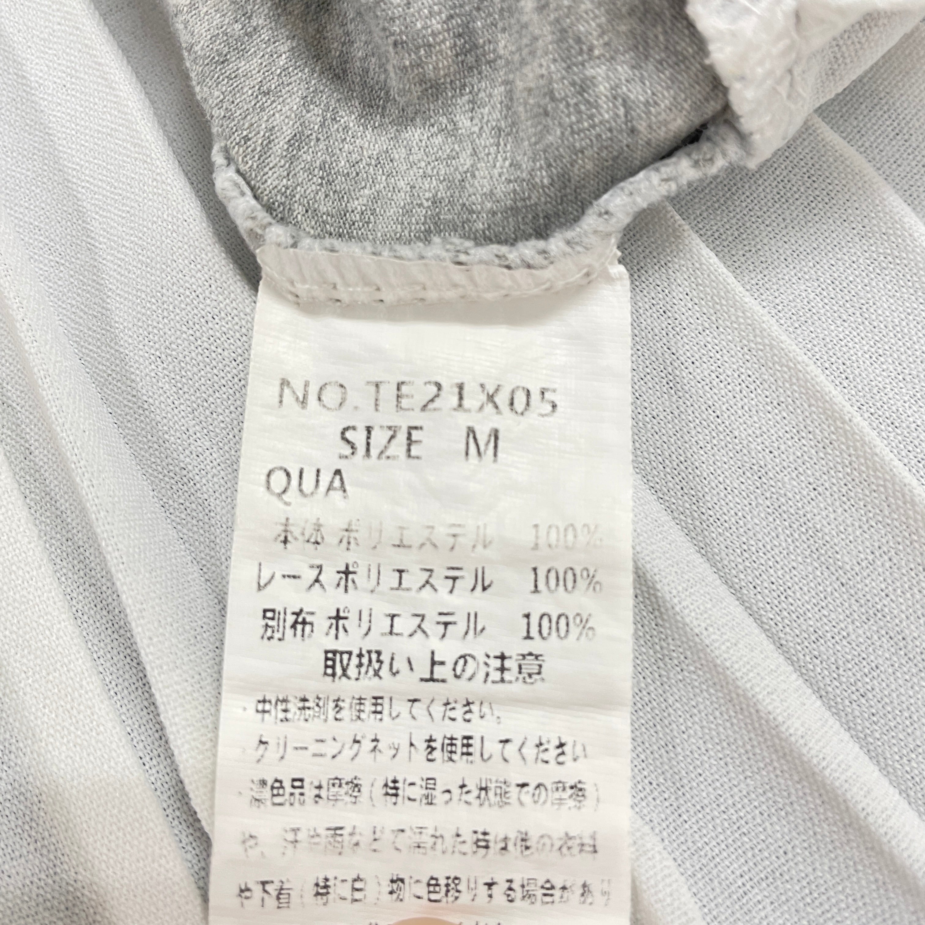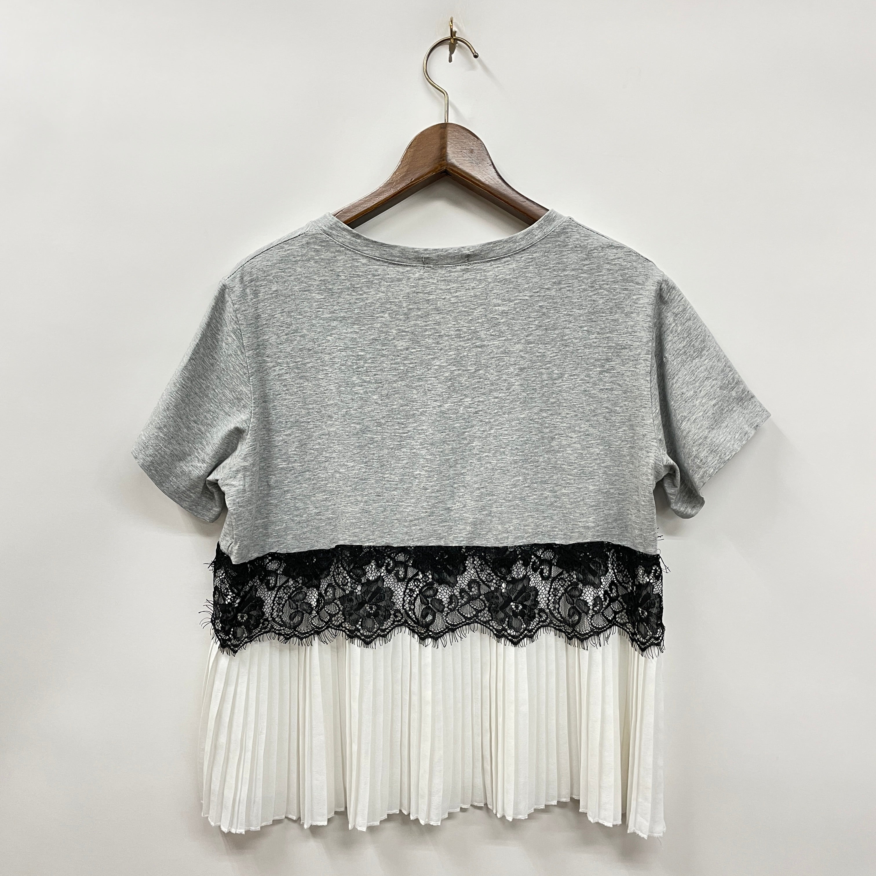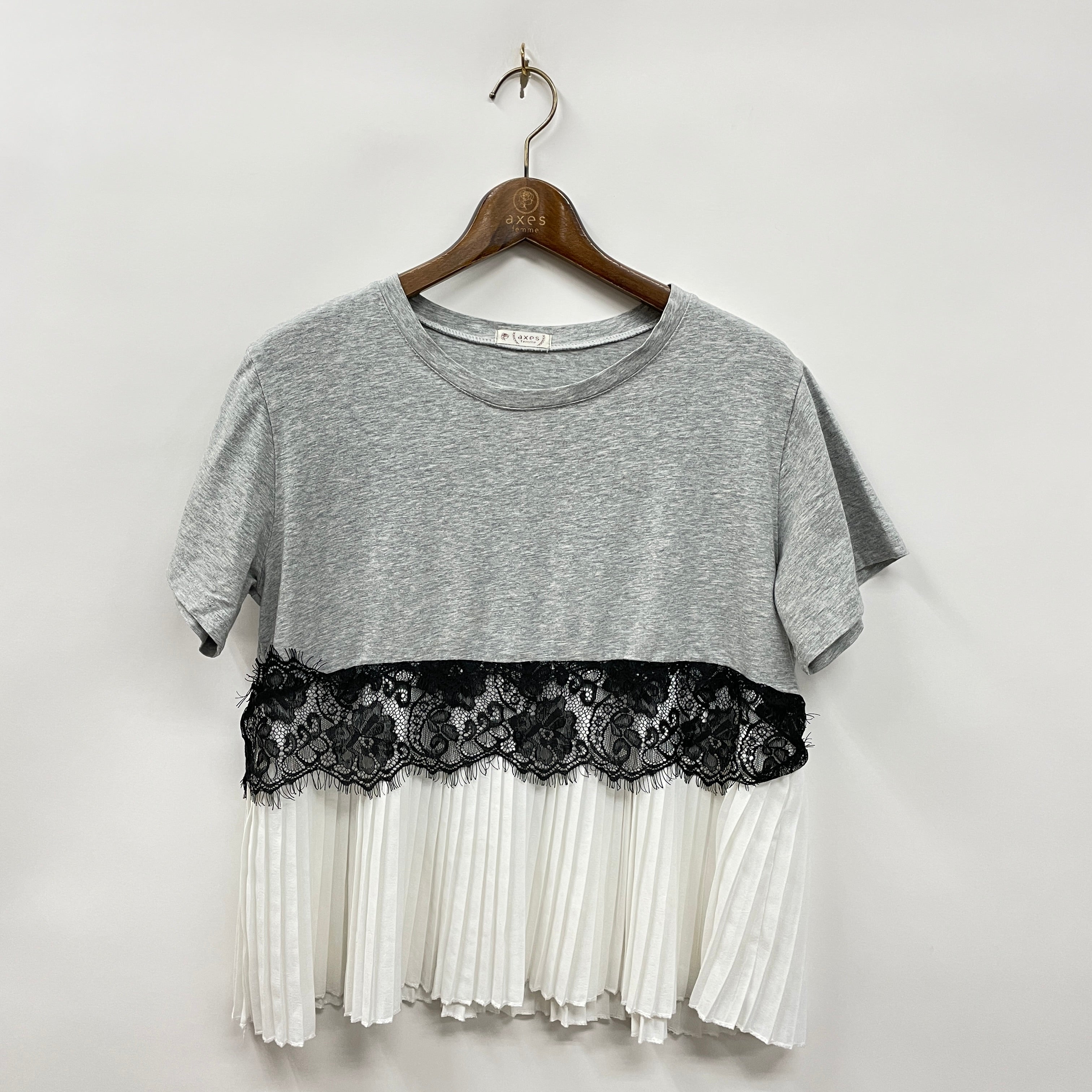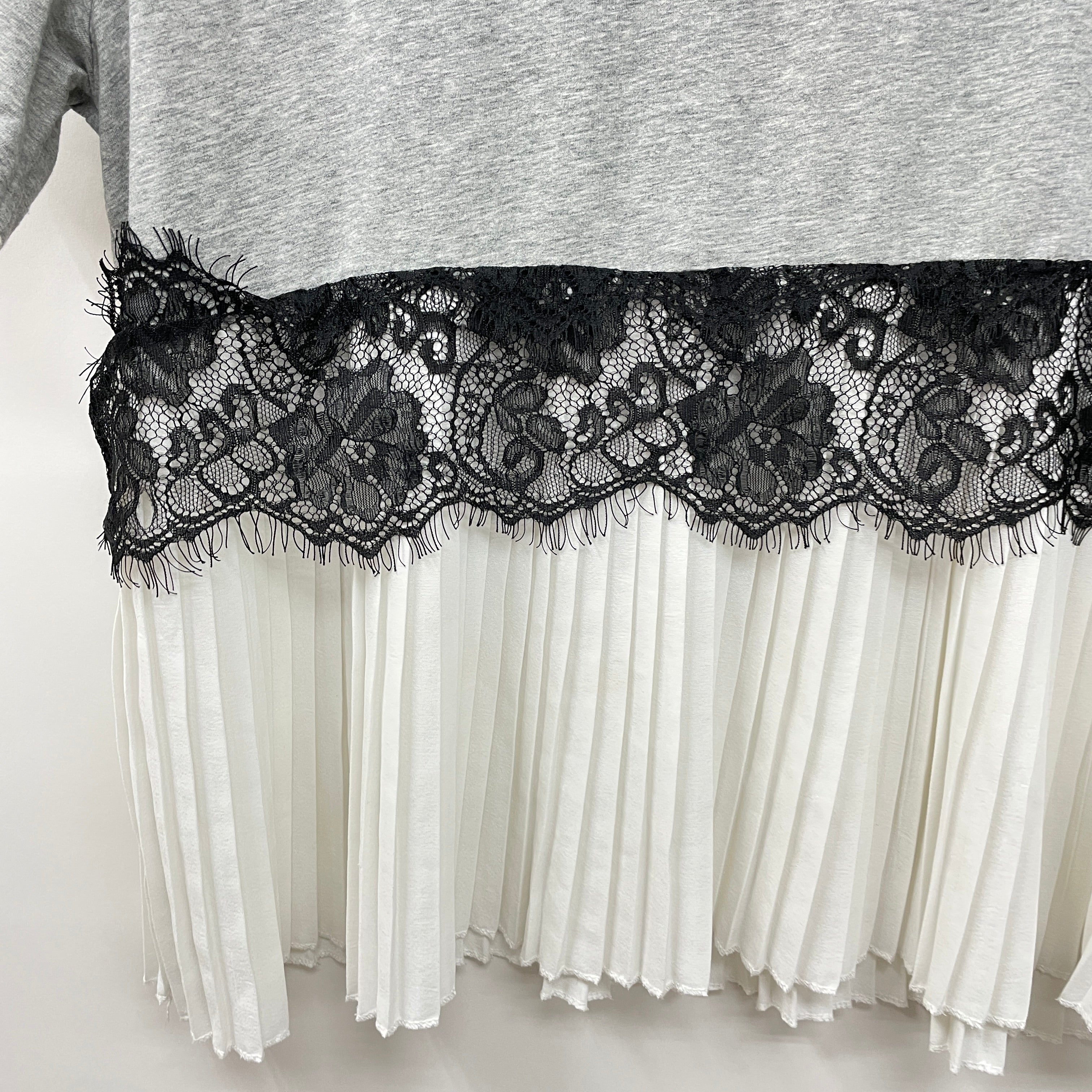 上品なデザインのレースが大きくドッキング風に見えるTシャツです。レースの下部分は縫い付けておらず、動くたびに揺れるシルエットが女性らしさをUP。