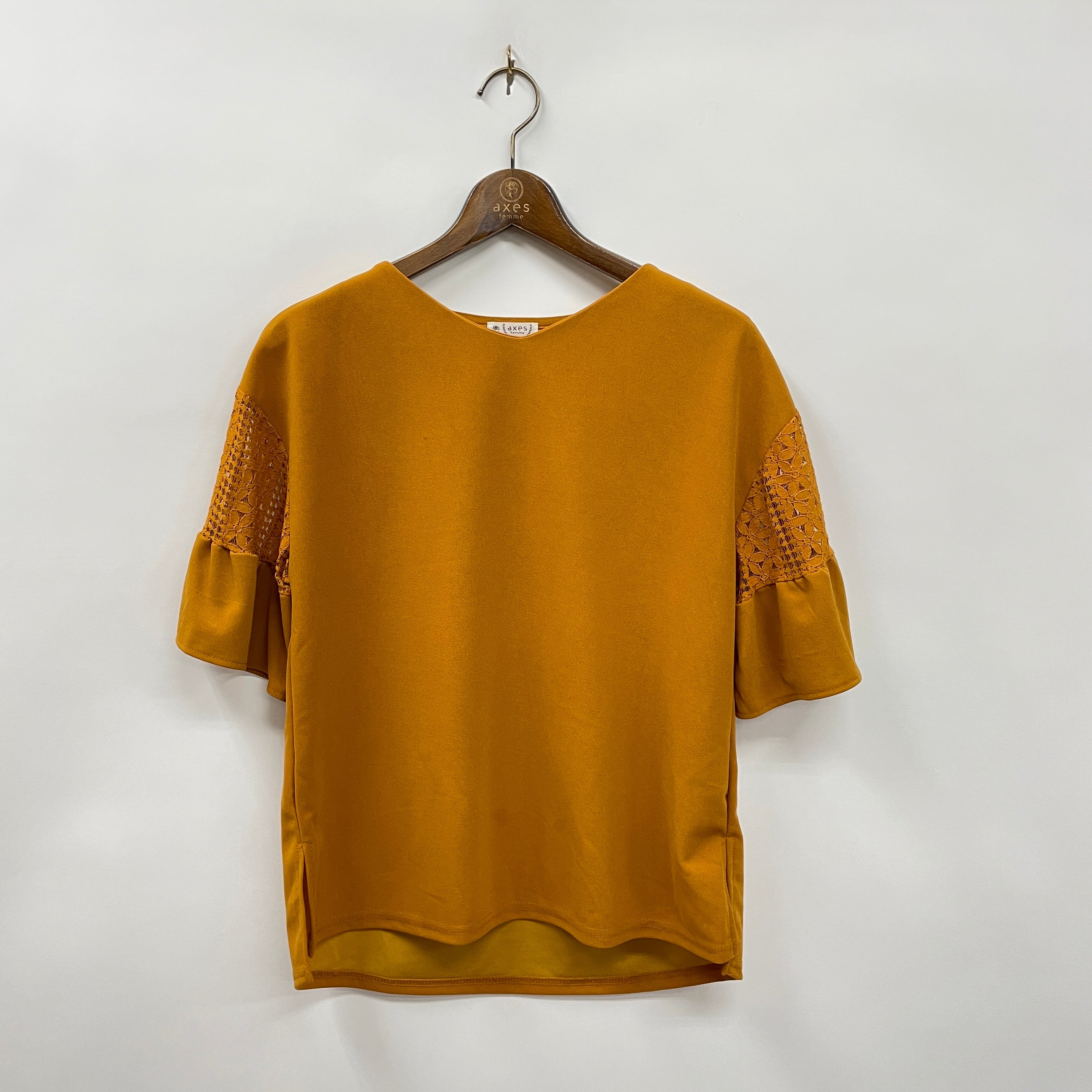 袖のレース生地切替がポイントのカットトップスです。