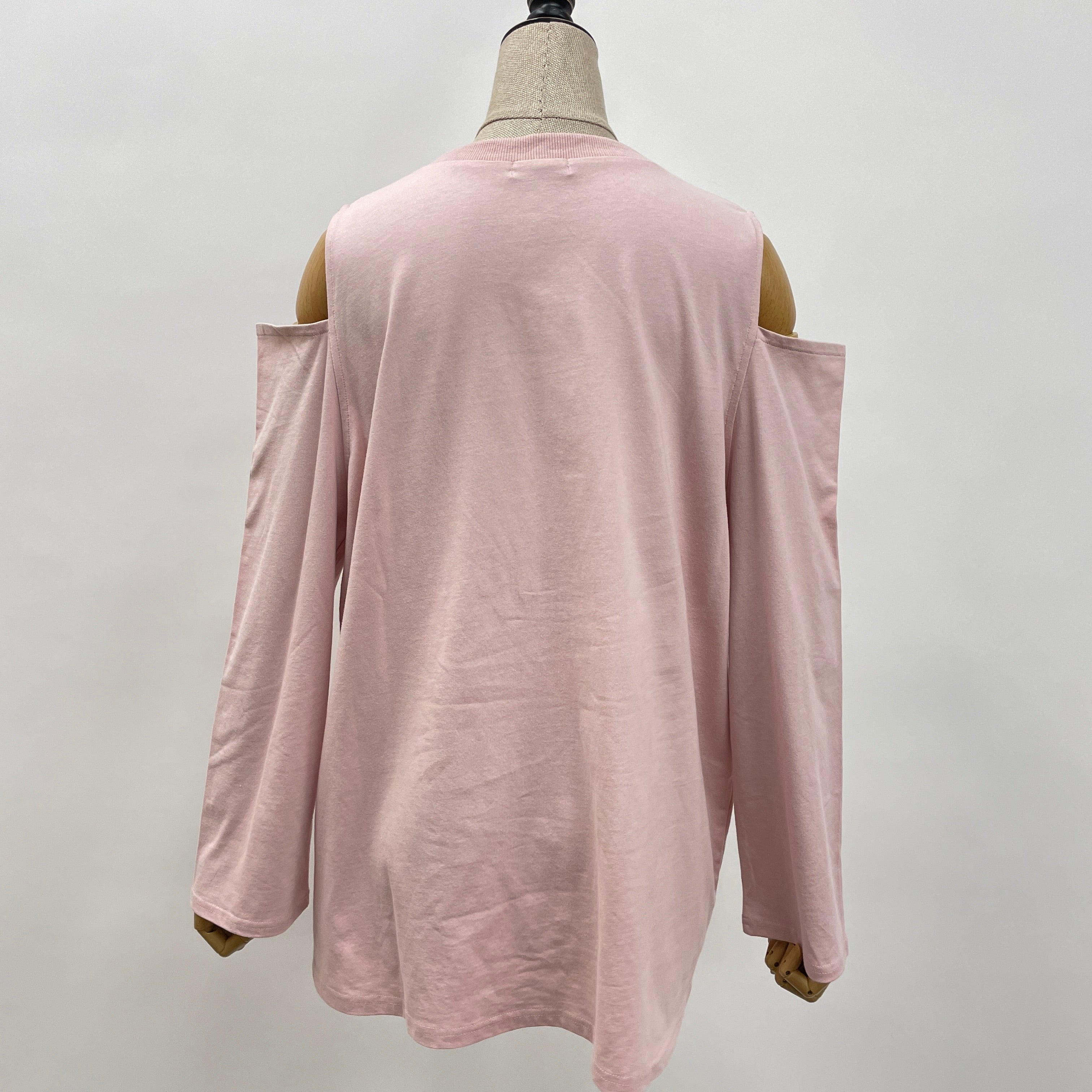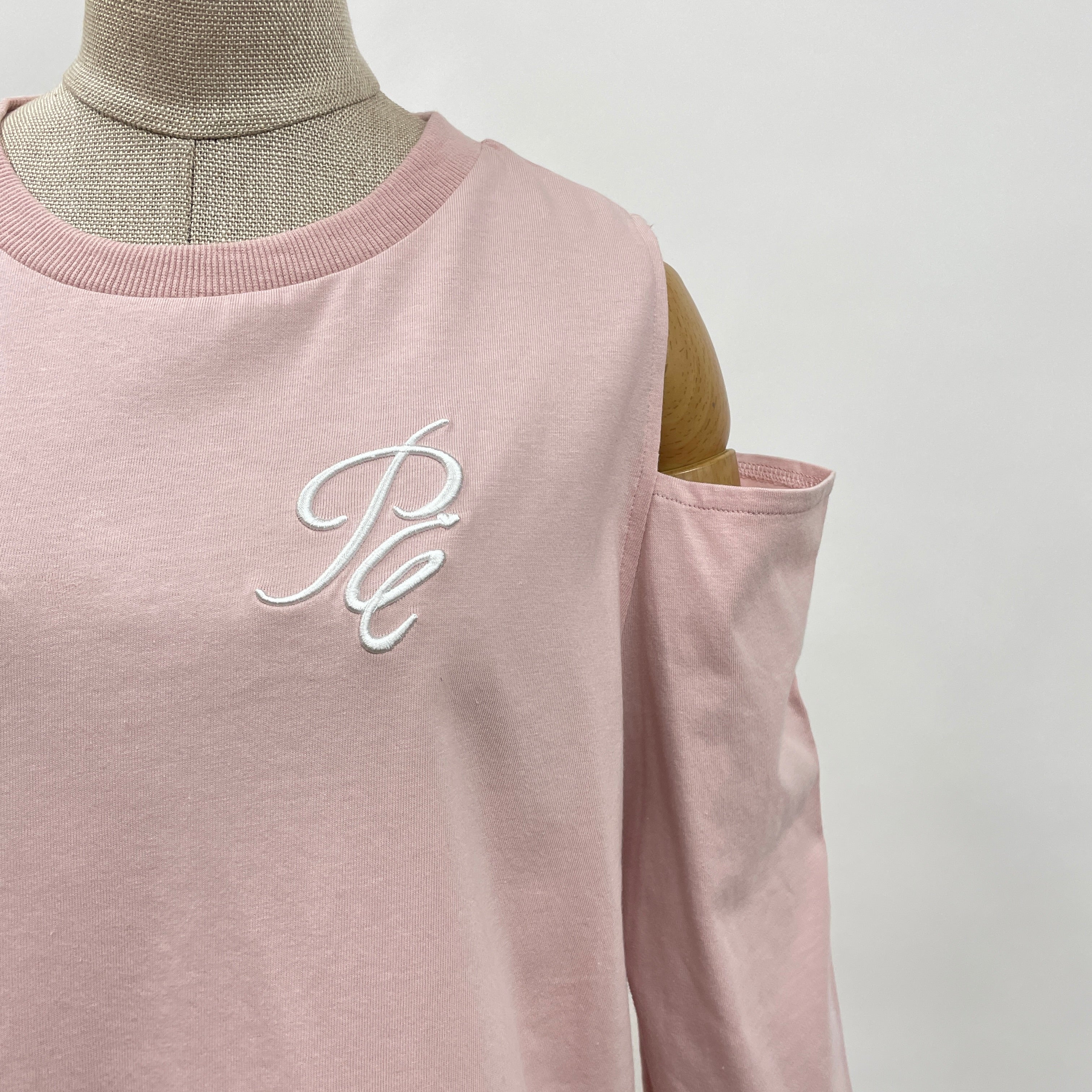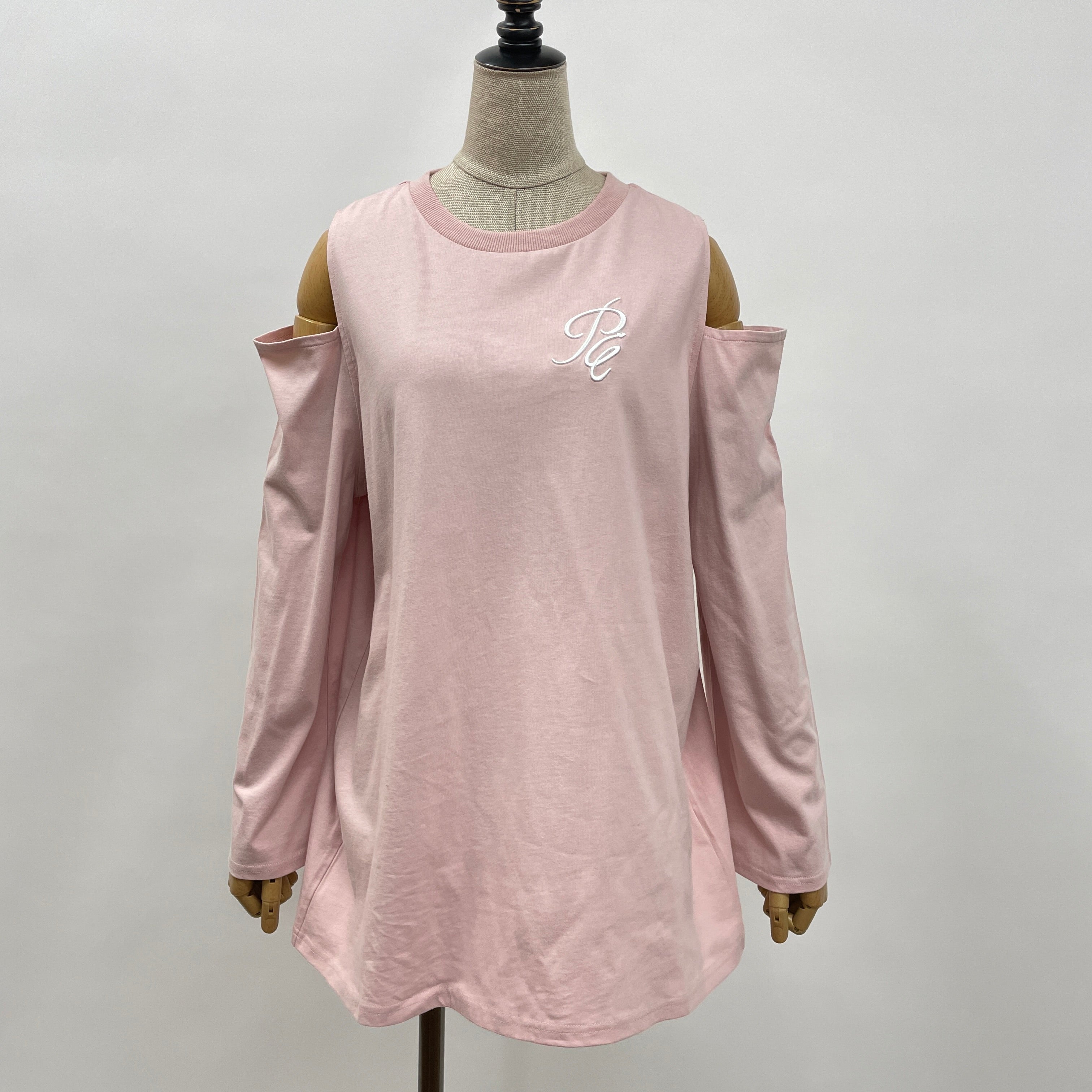 オフショルデザインのカットソーはヒップが隠れる丈感なのでショートボトムスを合わせてワンピース風にガーリーに着こなすのはもちろん、ロングボトムスに合わせてウエストマークするのもおすすめです。