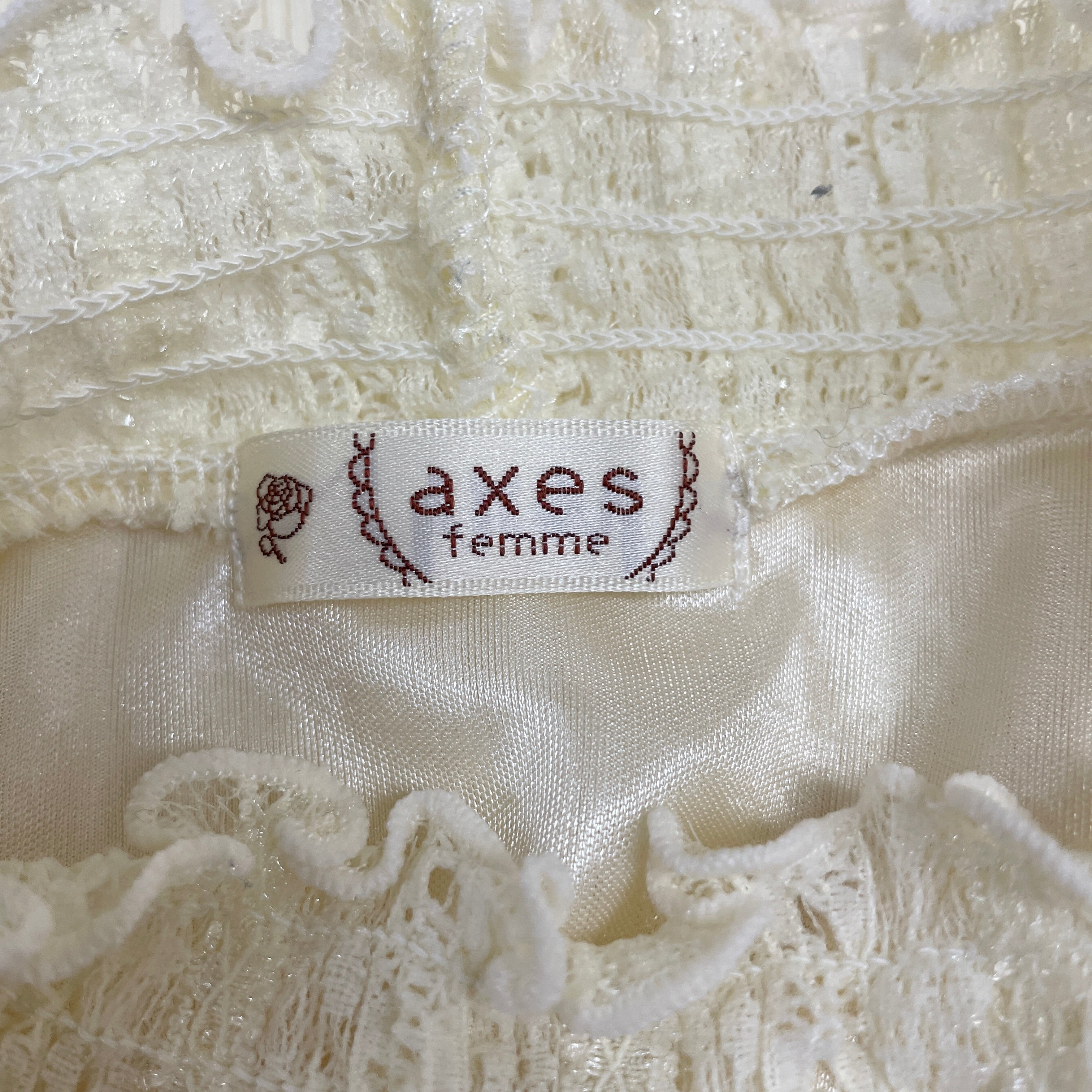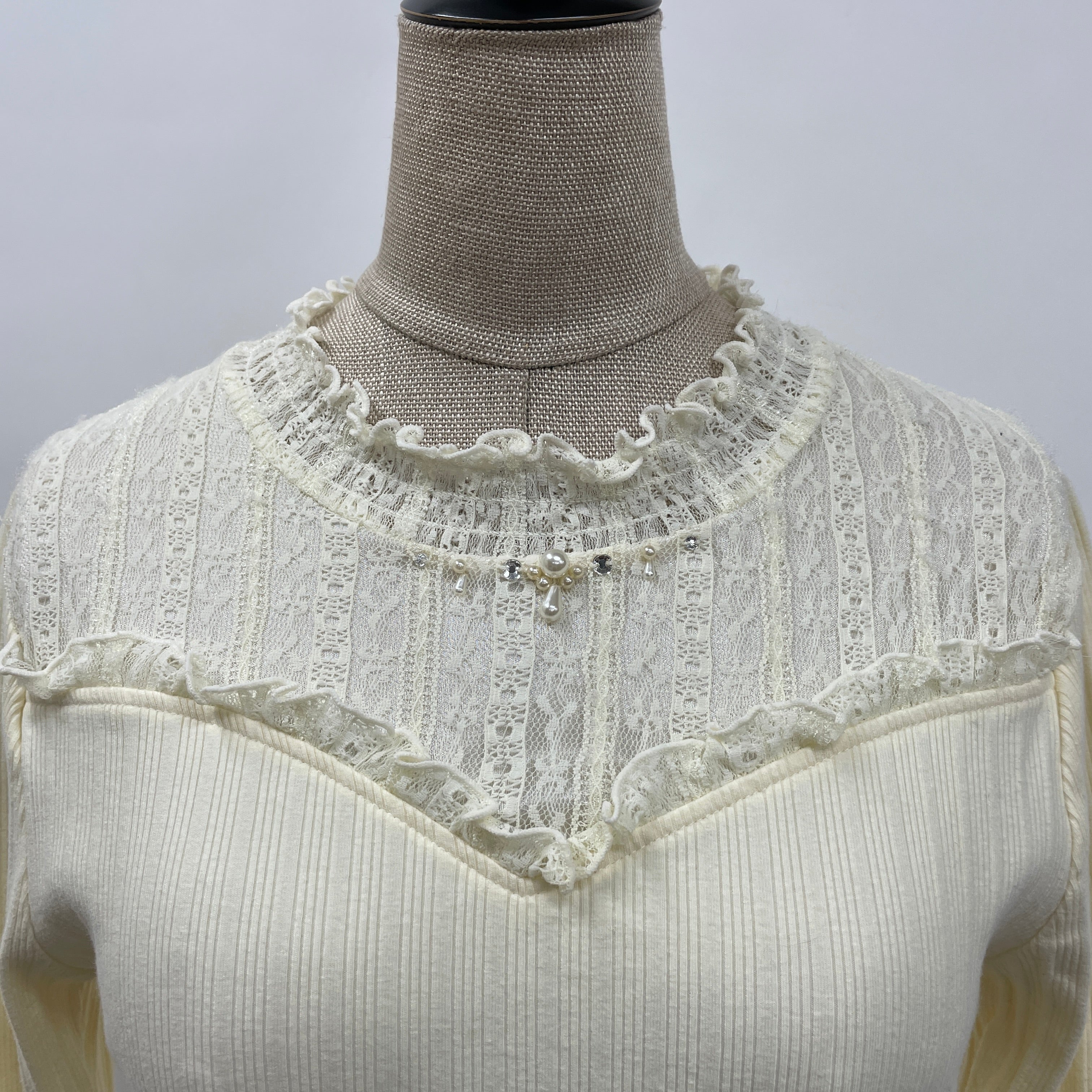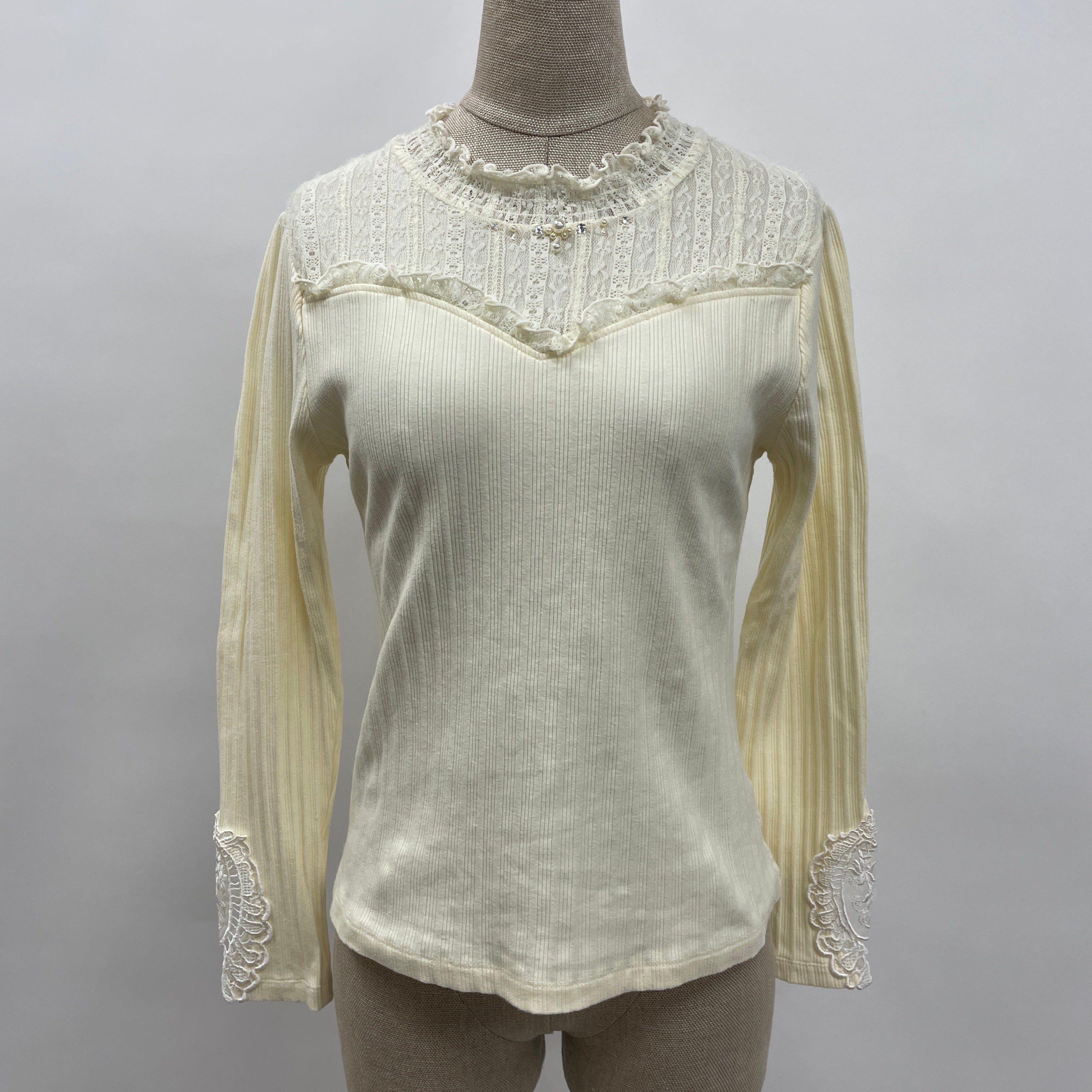袖のモチーフレースの華やかさがポイントのプルオーバー。1枚でも着られますが、襟元からレースを出して、ニットやカーデとの合わせもできる万能アイテム。