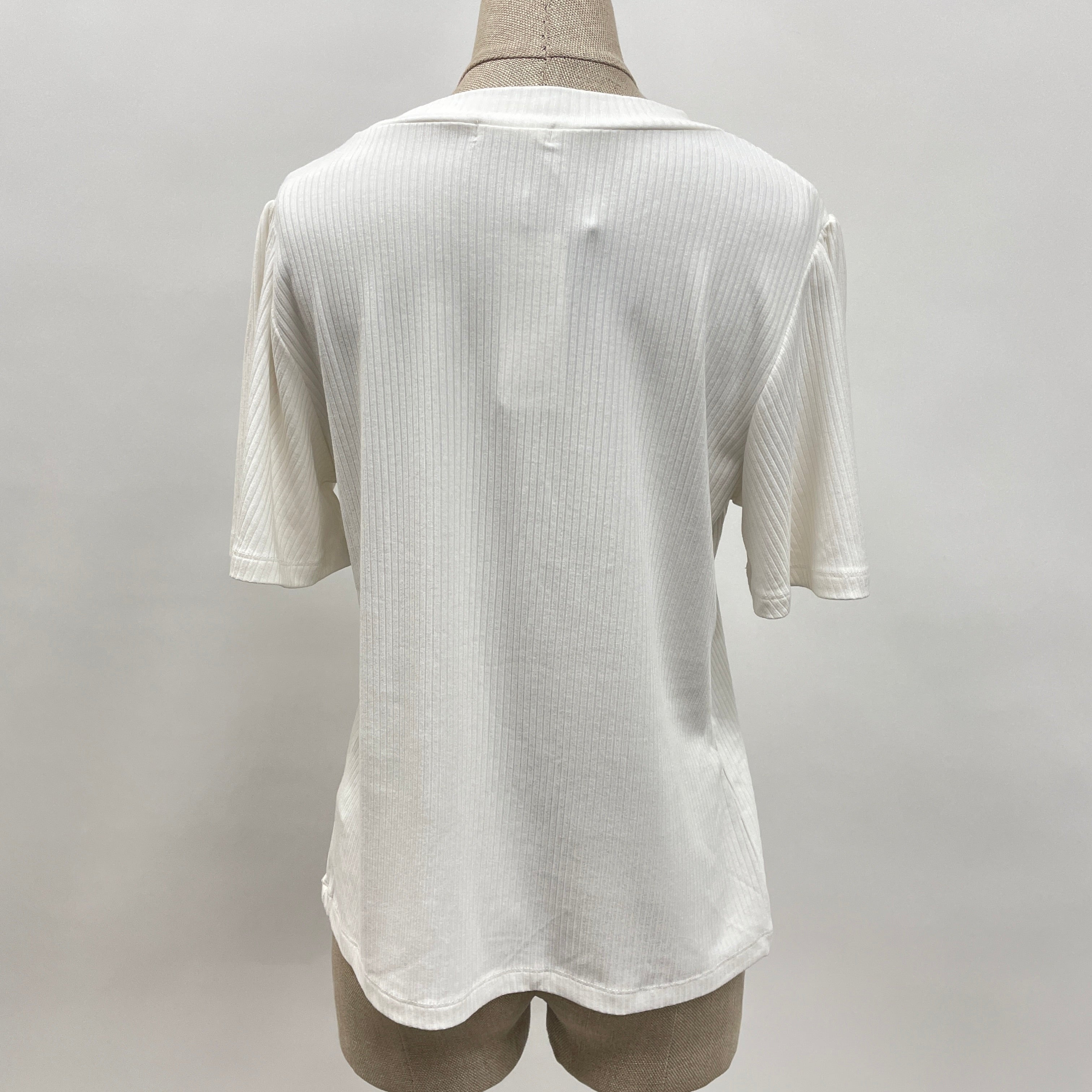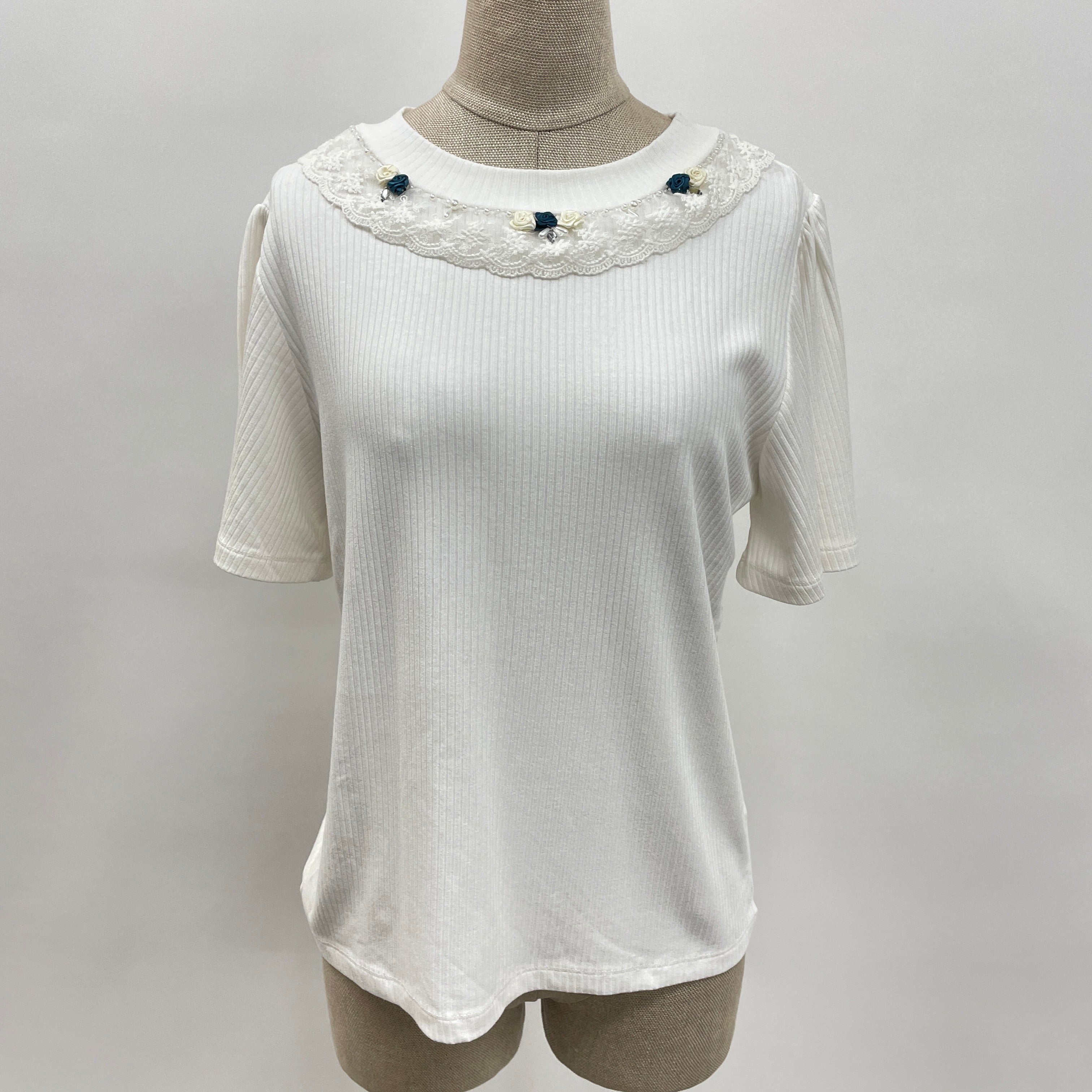 サテンリボンで作られた巻きバラが胸元を上品に彩る半袖トップスです。