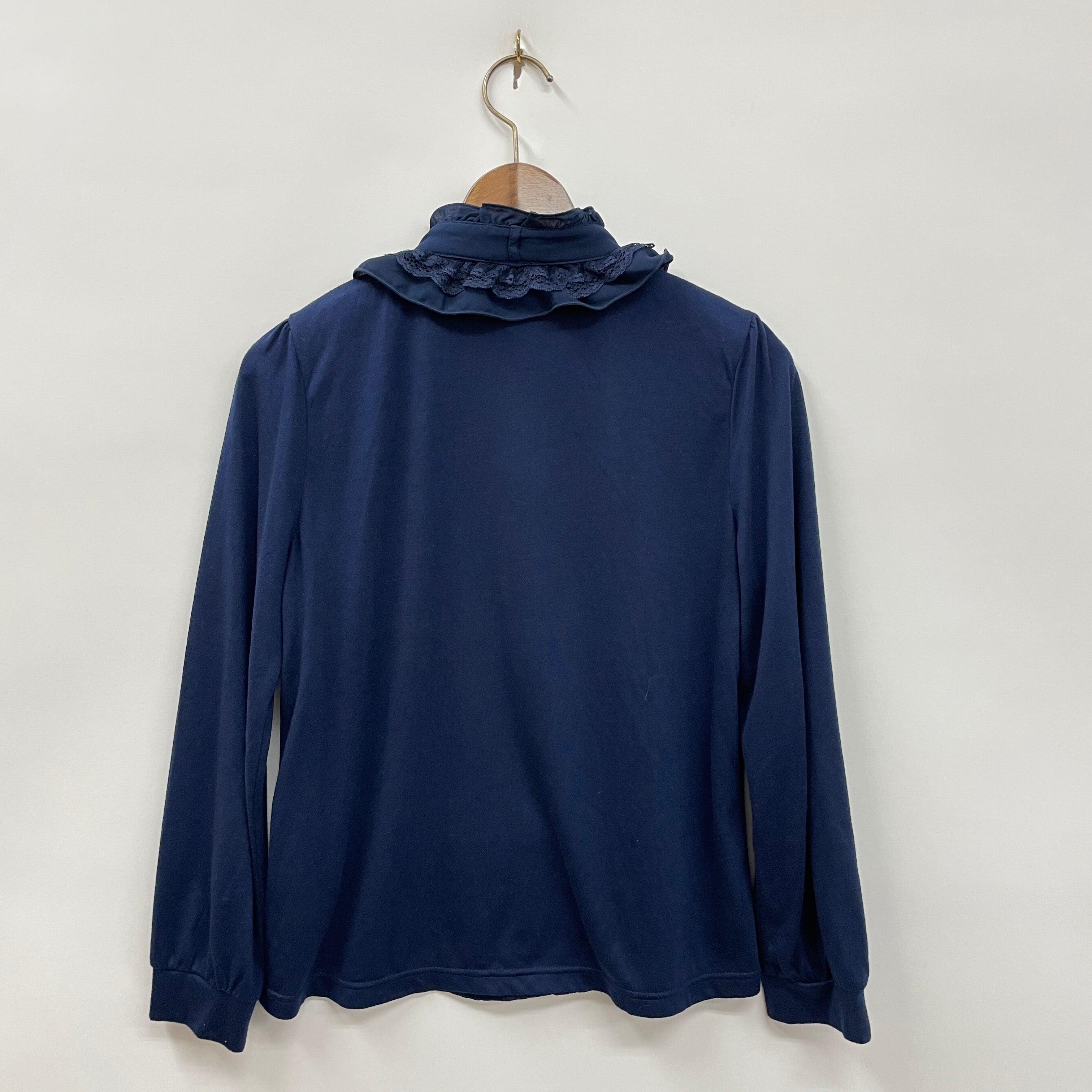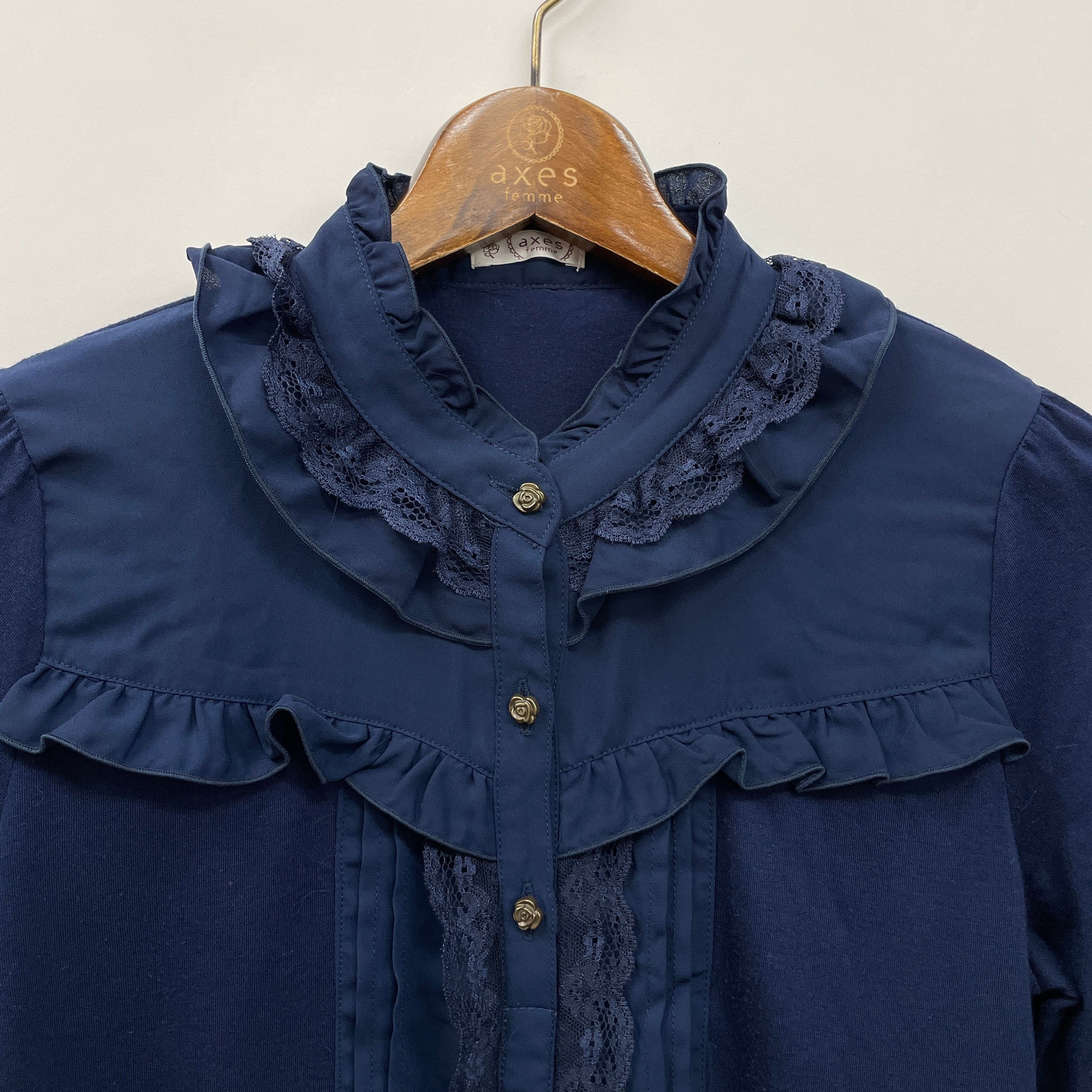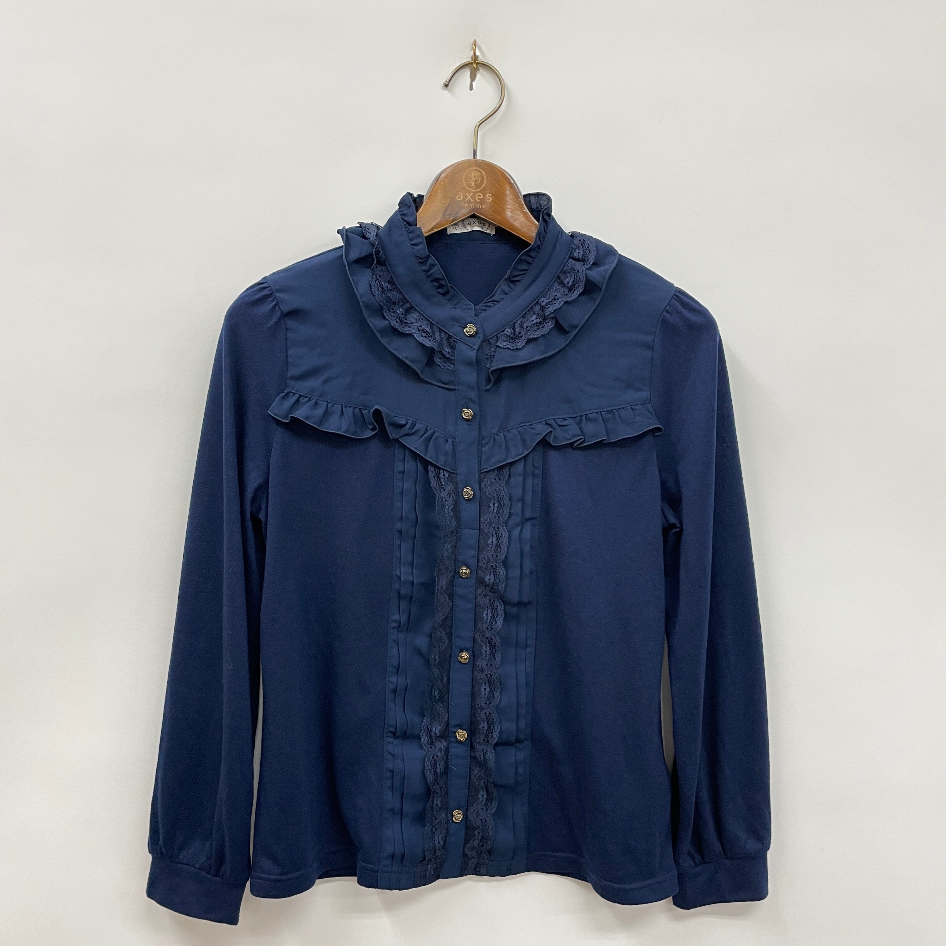 ストレッチのきいたカットソー素材と布帛を合わせたブラウス風プルオーバーです。フリルデザインがかわいらしいアイテム。セットのリボンは取り外し可能です。