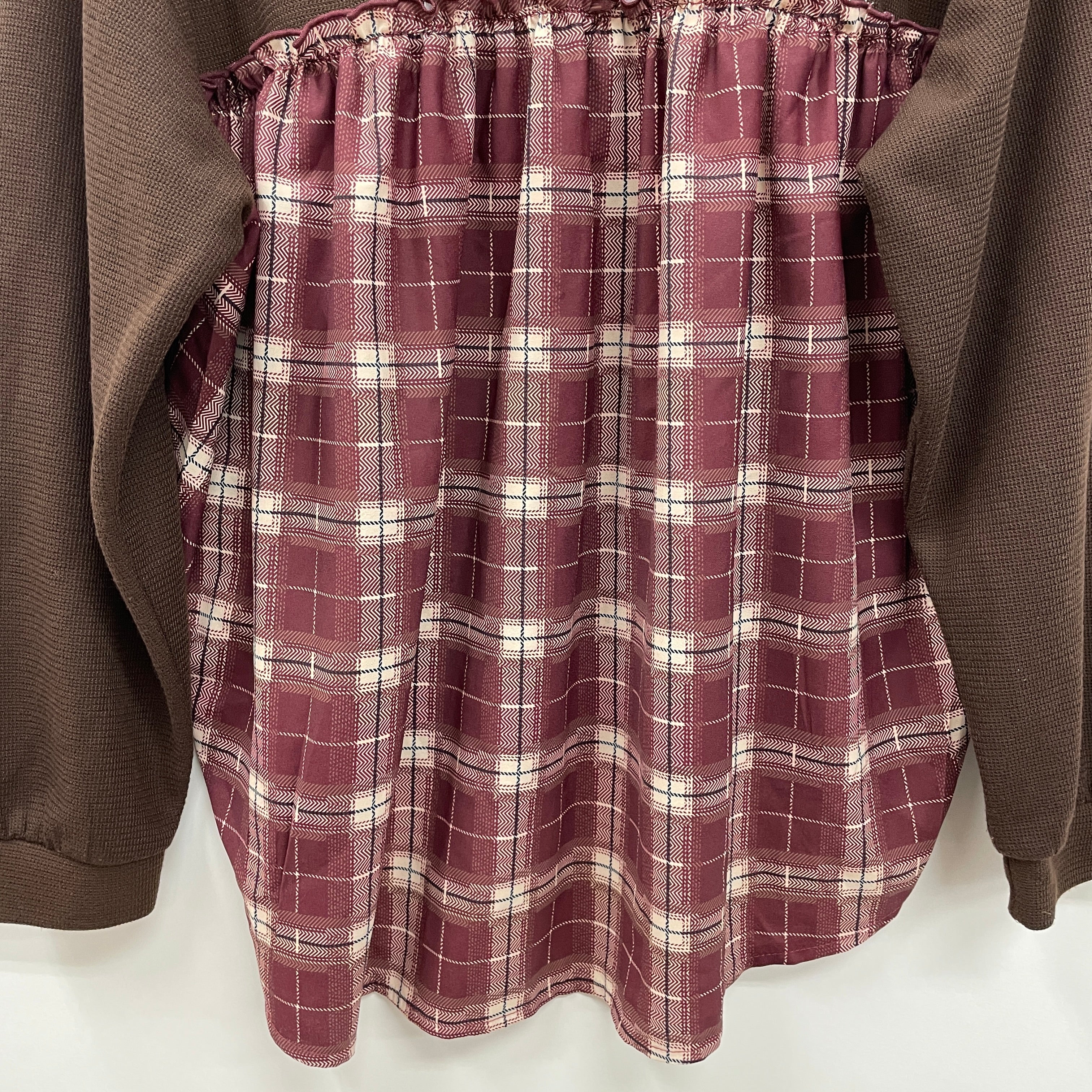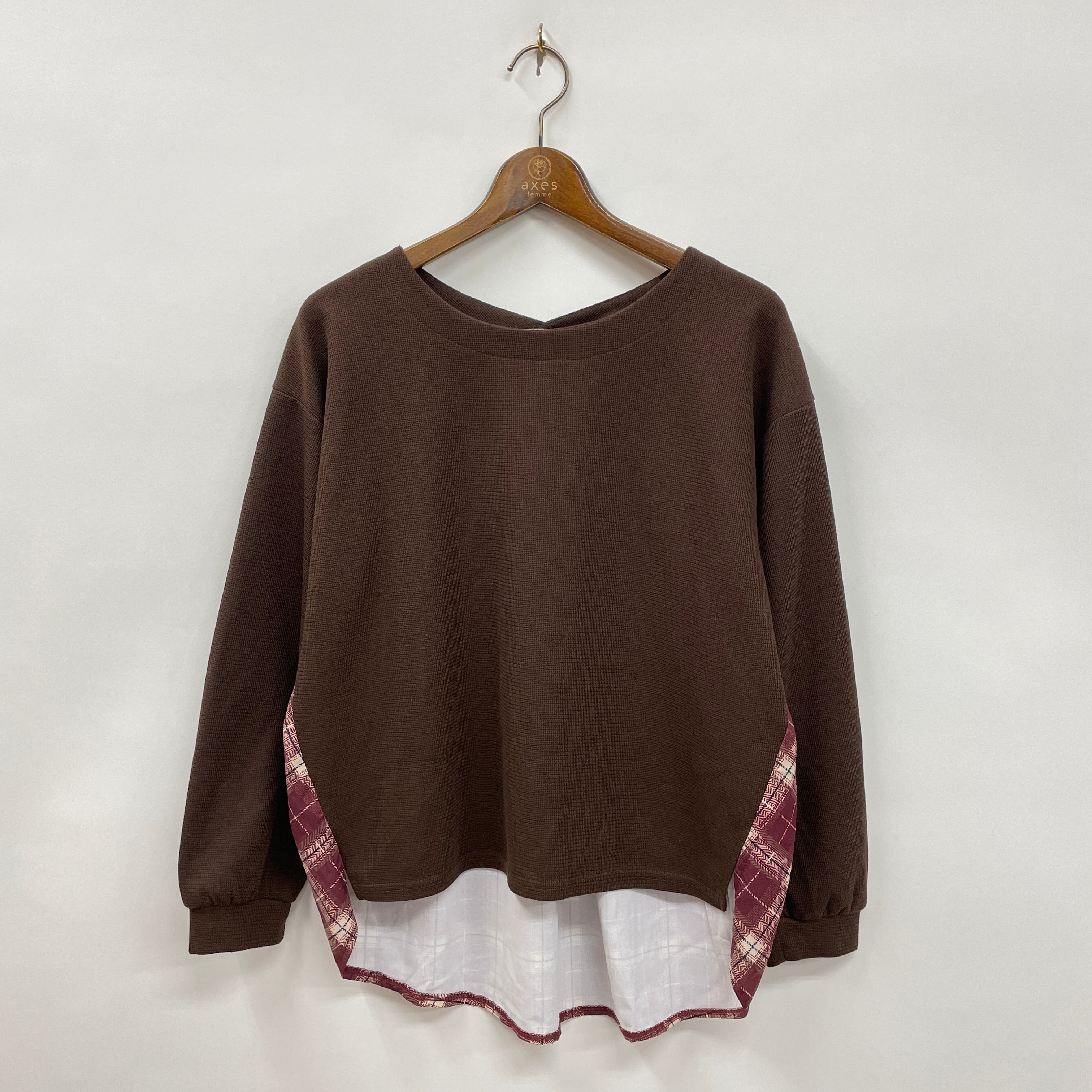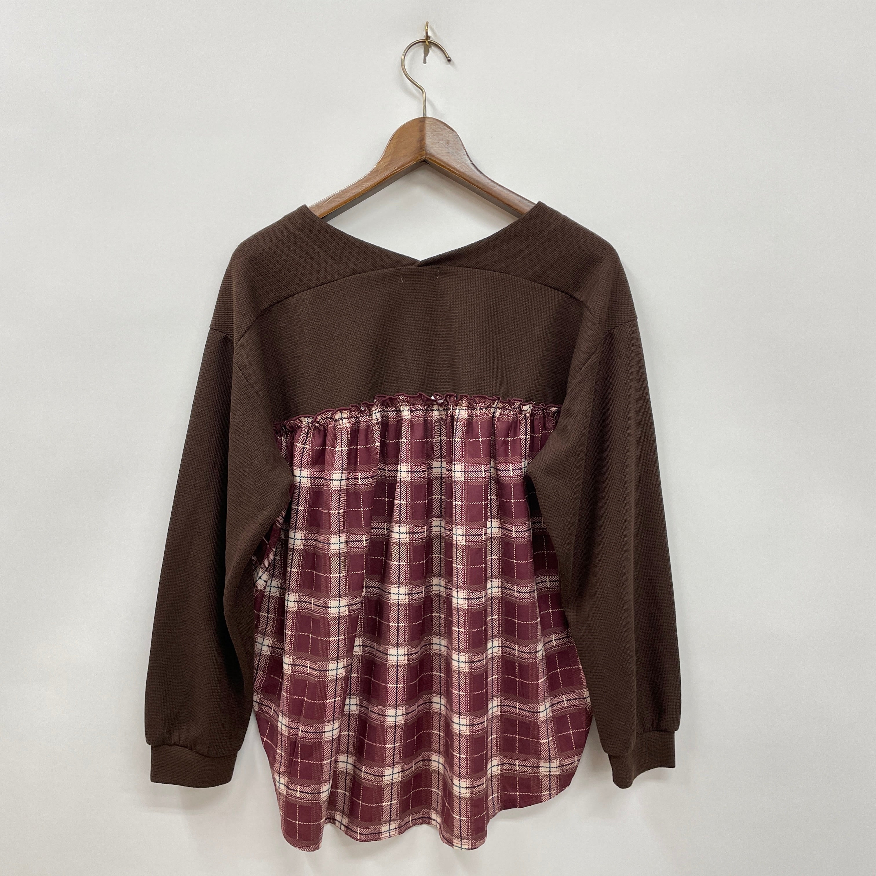 チェック生地との切替になったバックシャンデザインのトップスです。