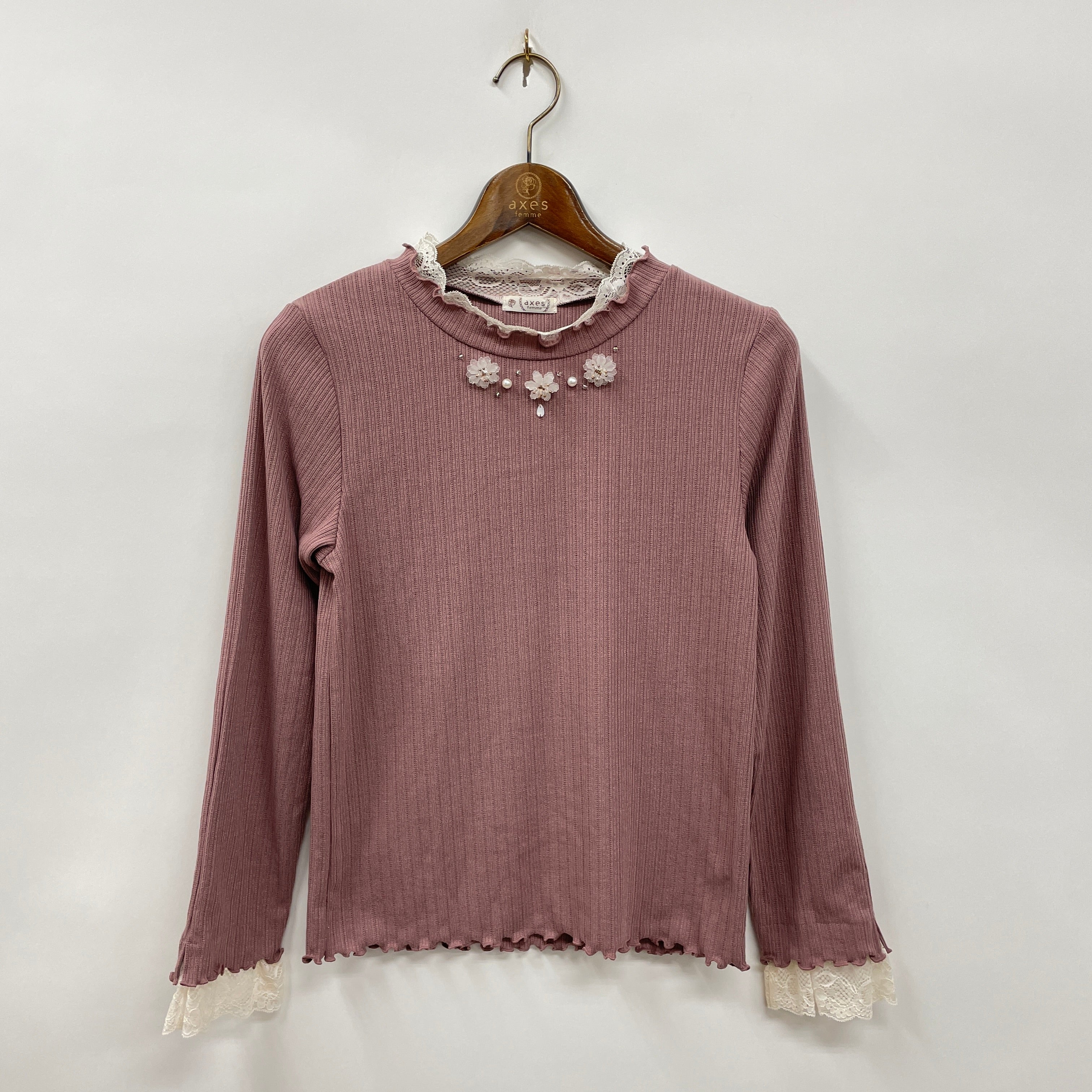 立体のお花モチーフをやビジューを胸元に施したトップスです。