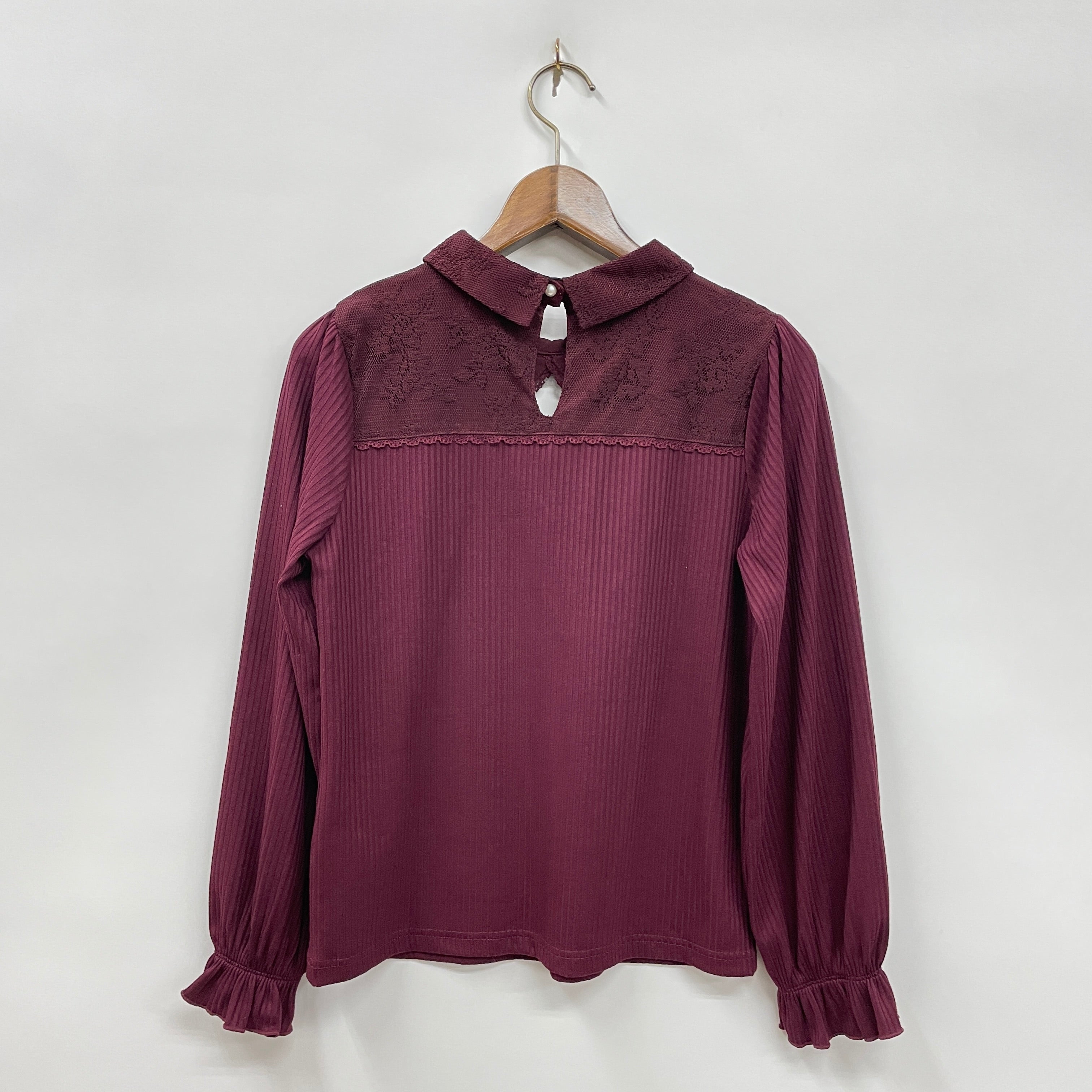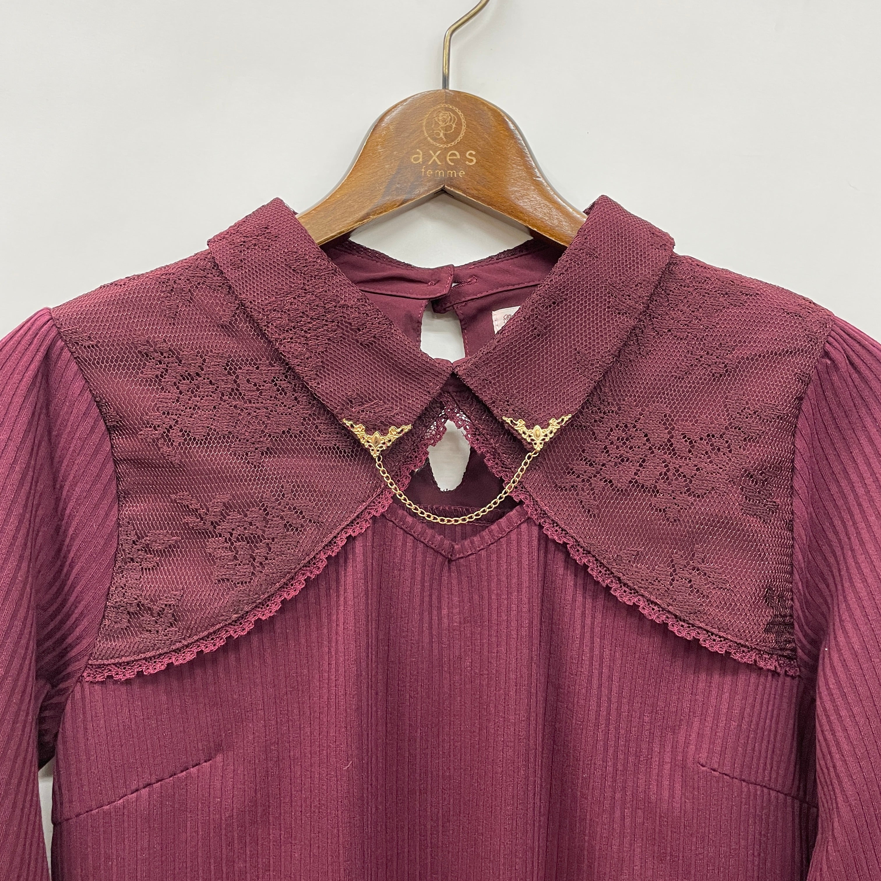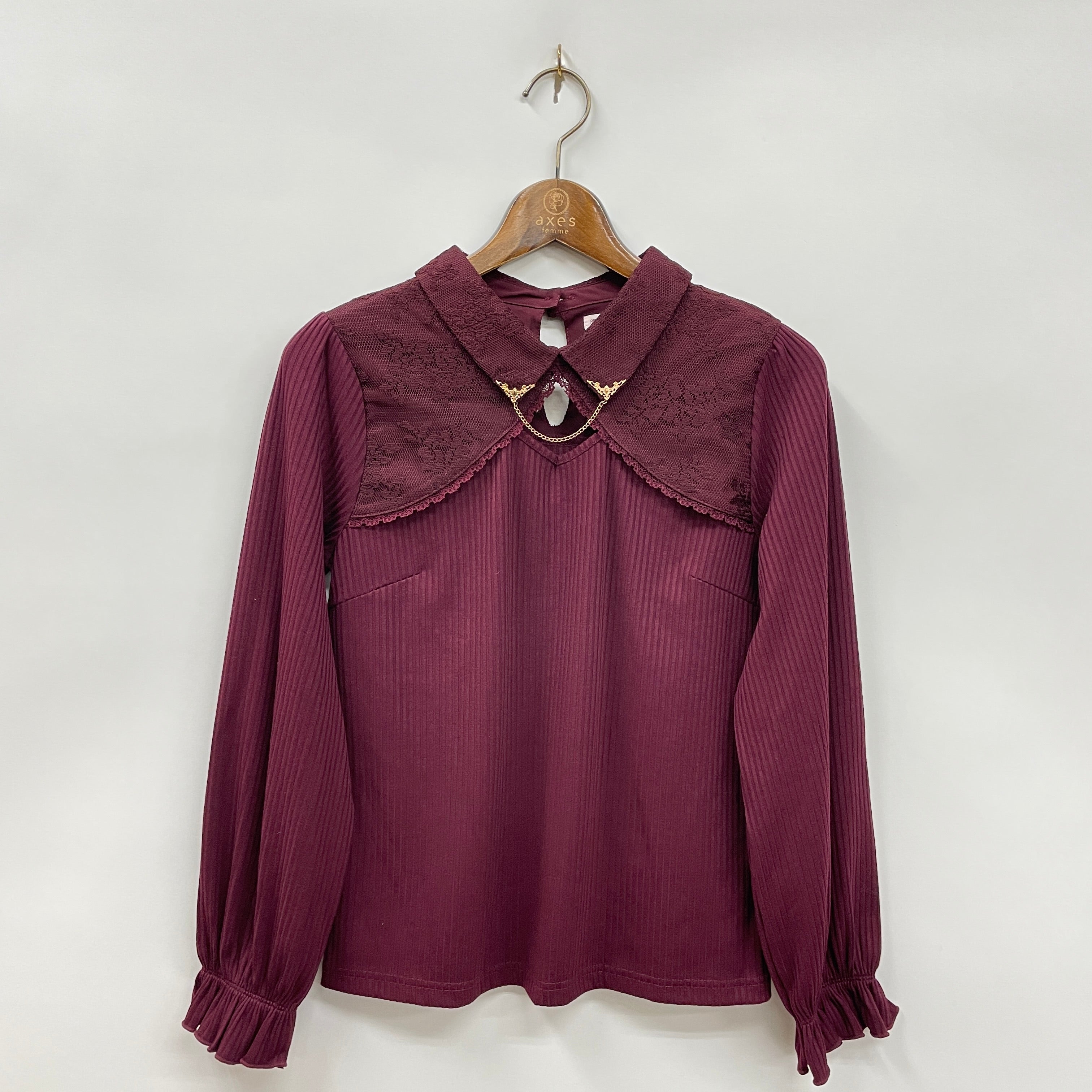 レースや金具使いでクラシカルなテイストをプラス、ボディ部分は伸縮性のあるリブ素材ですっきりと着ていただけます。