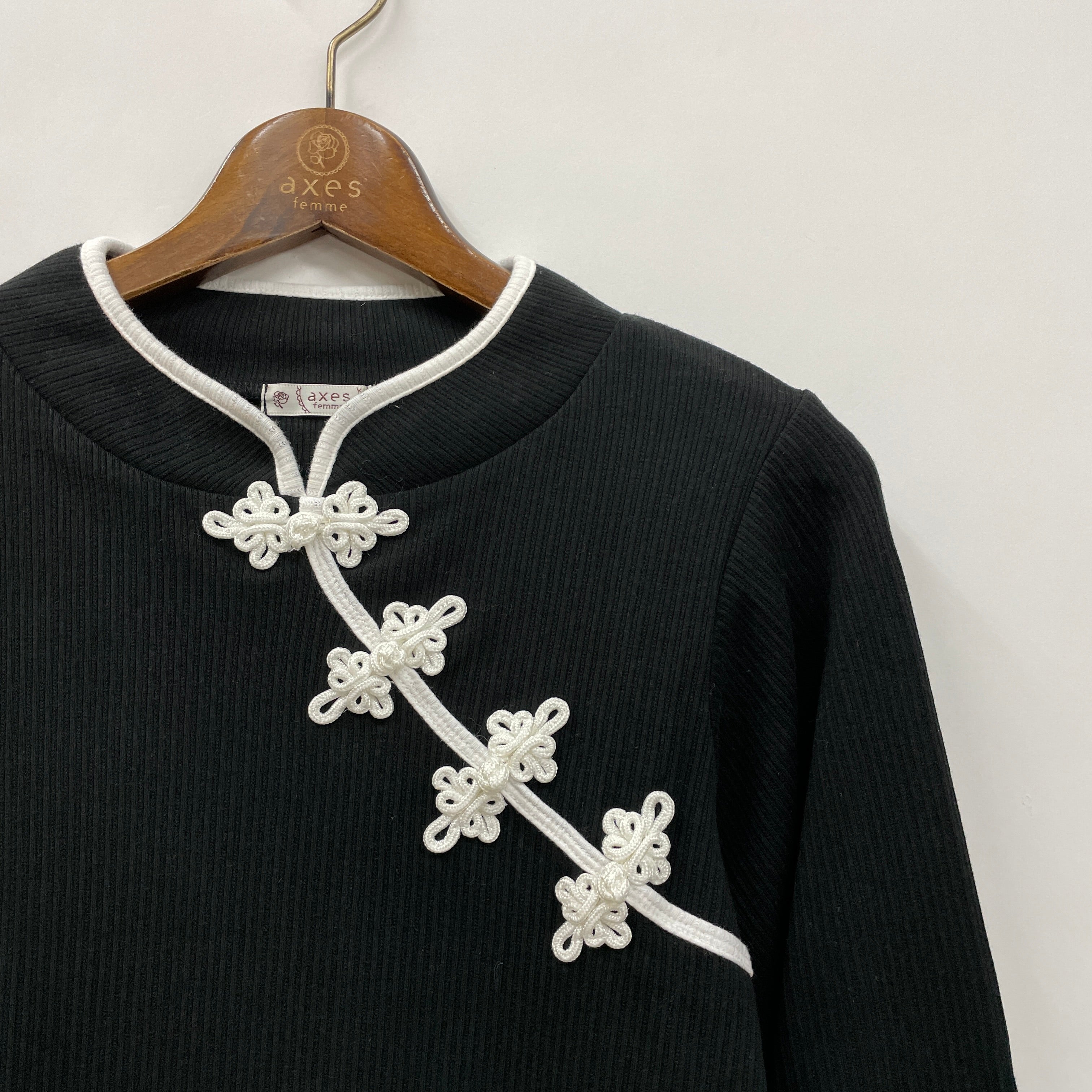 身頃と袖にあしらわれたチャイナボタンが引き立つ、バイカラーの配色がこだわりのプルオーバーです。