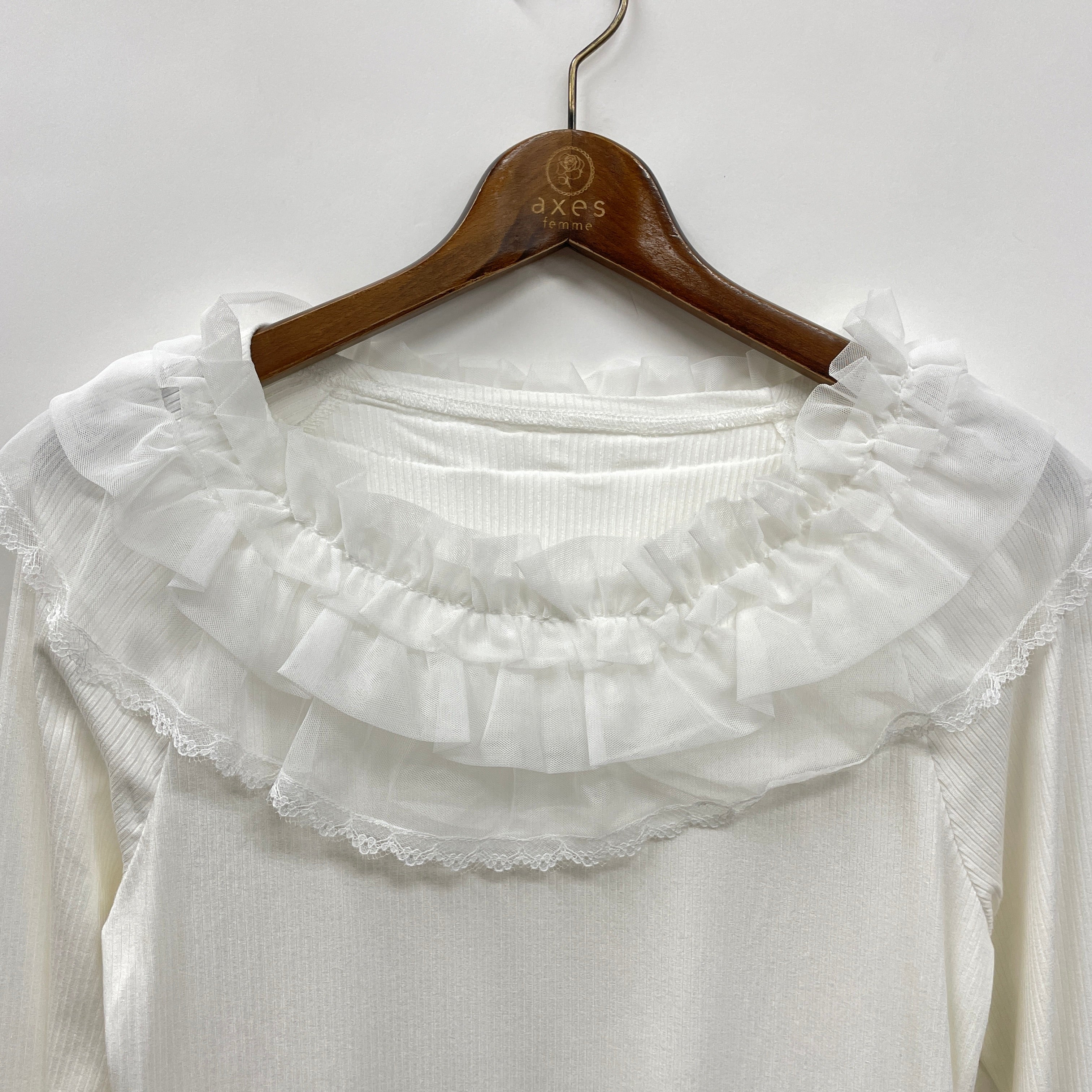 襟のチュールフリルはフラシ仕様のため、ベストやジャンスカなどの重ね着がオススメ。