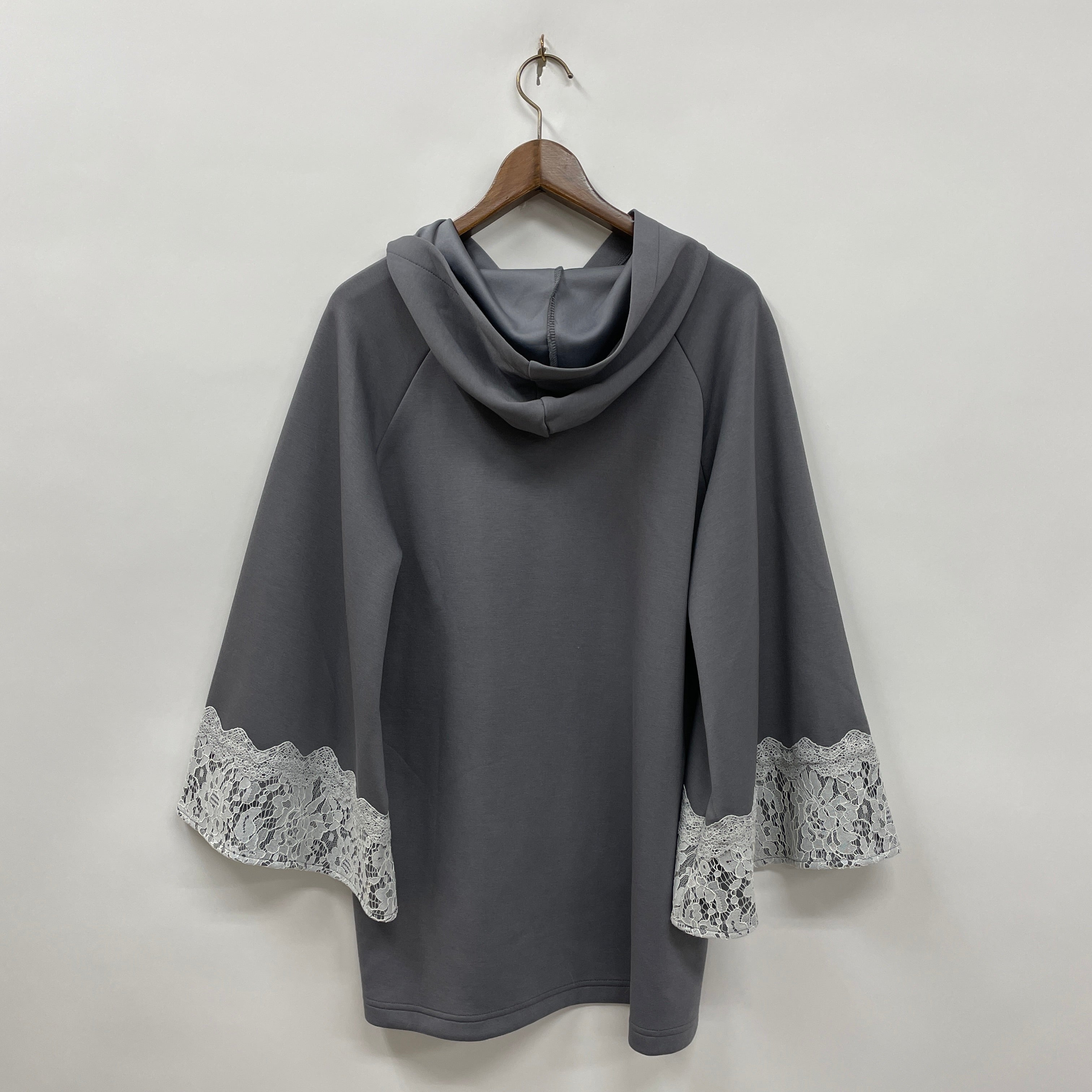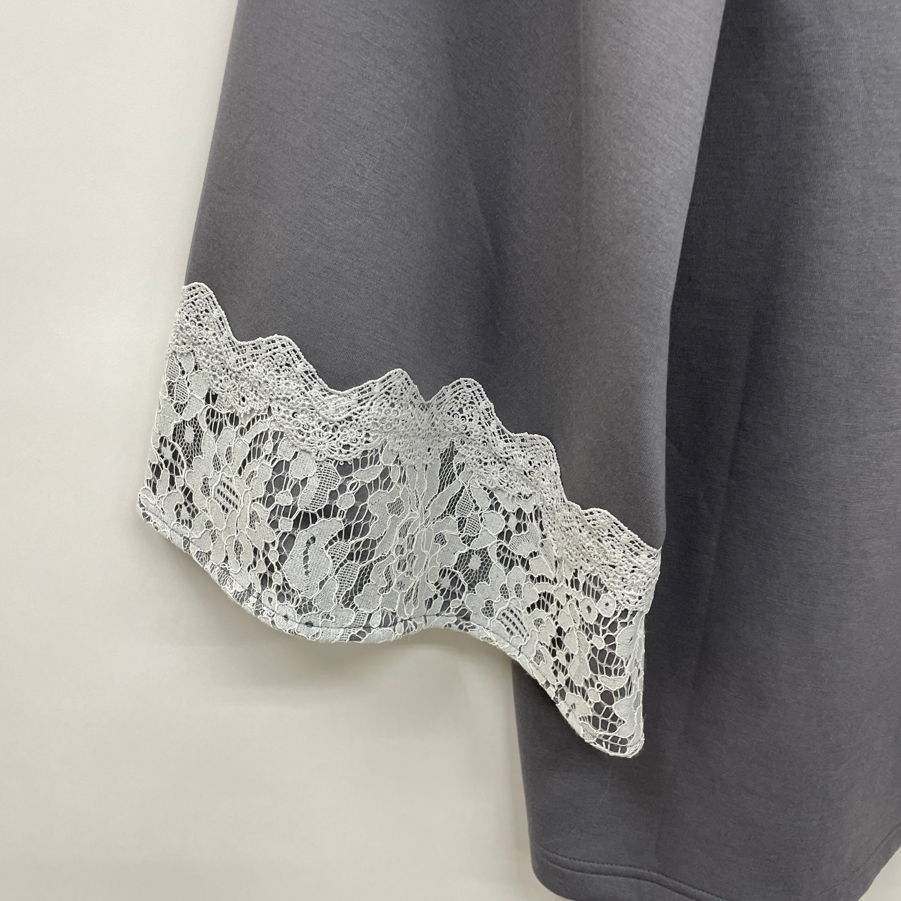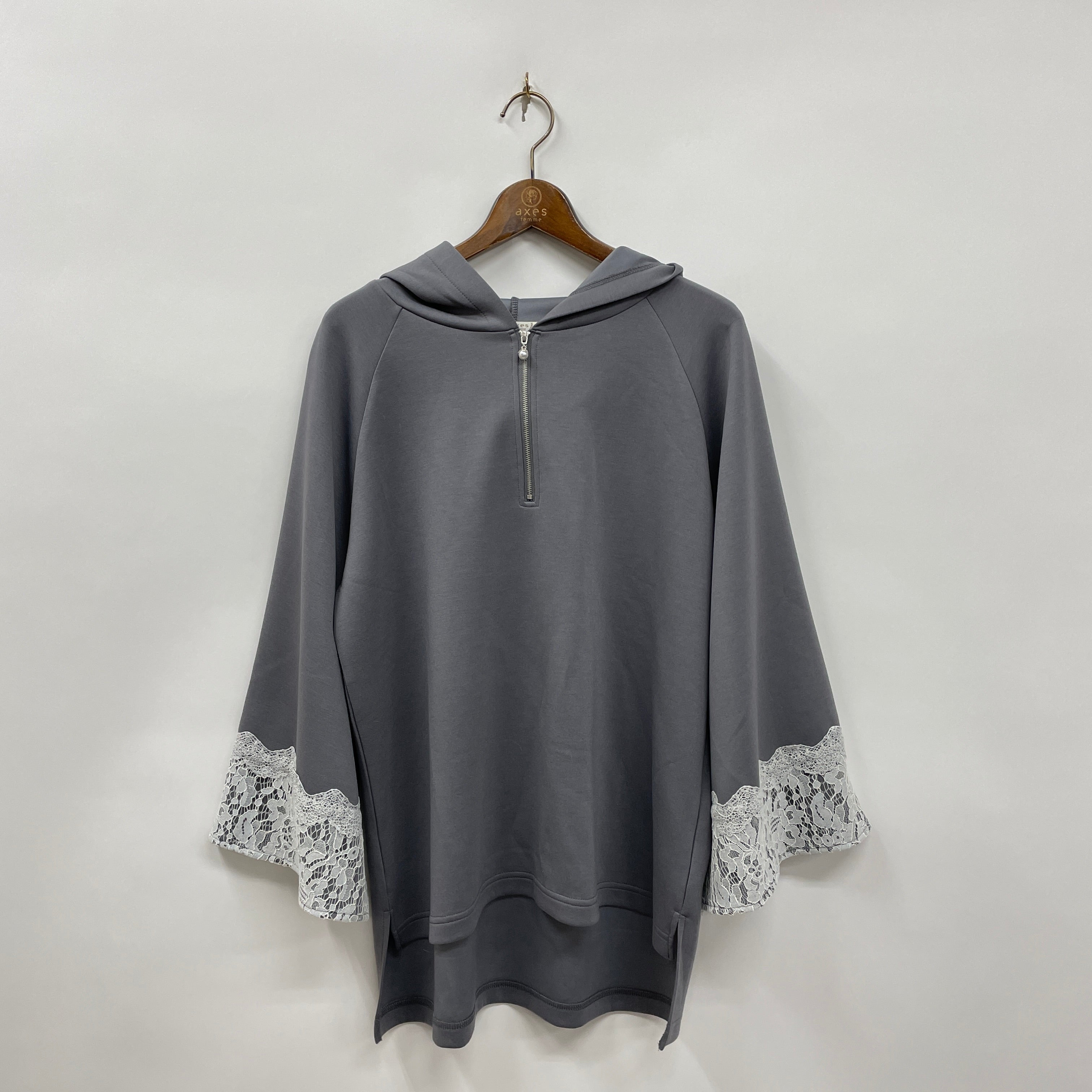 袖口のレース重ねデザインや、ファスナー飾りのパールなど、フェミニン感をプラス。