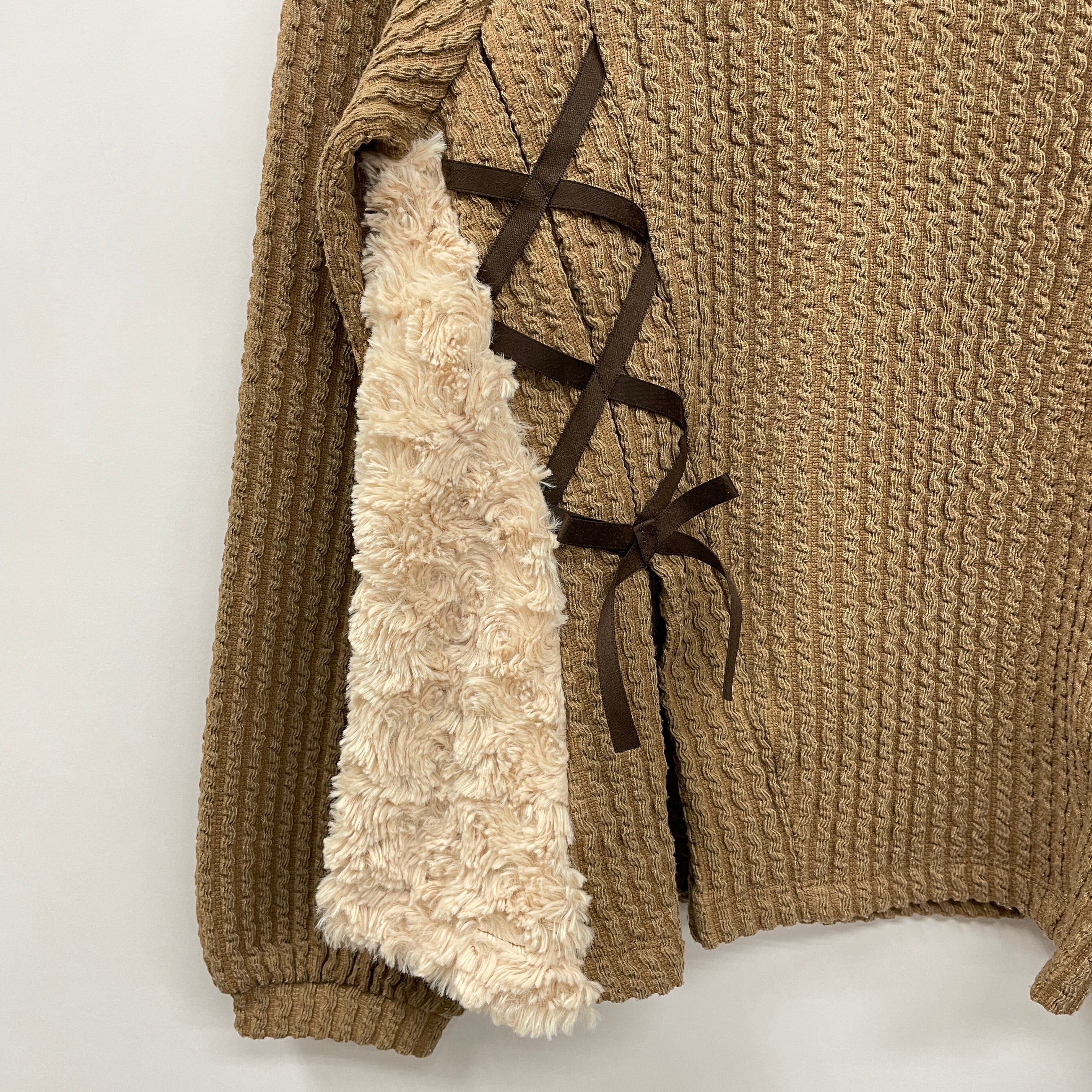 独特な凹凸のある生地感が特徴のカットプルオーバーです。脇のレースアップだけでなく、ファー生地もプラスされて温かみのあるアイテム。パンツにもスカートにも合わせやすいコーディネートを選ばず、丈も長めでお尻を隠してくれるのも◎
