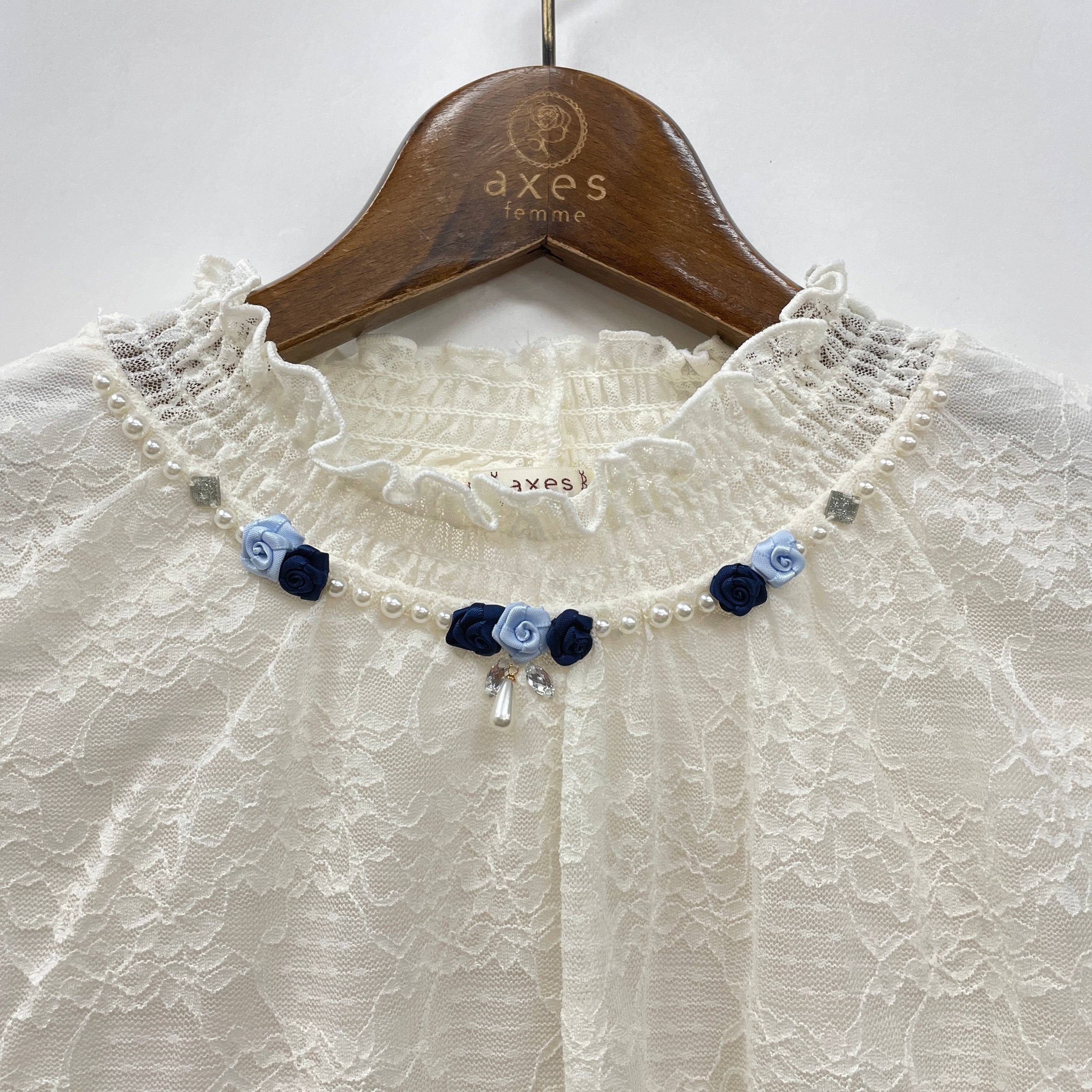 ネックレス風に胸元を彩るサテンリボンの巻きバラとキラキラのパール・ビジューがポイントです。
