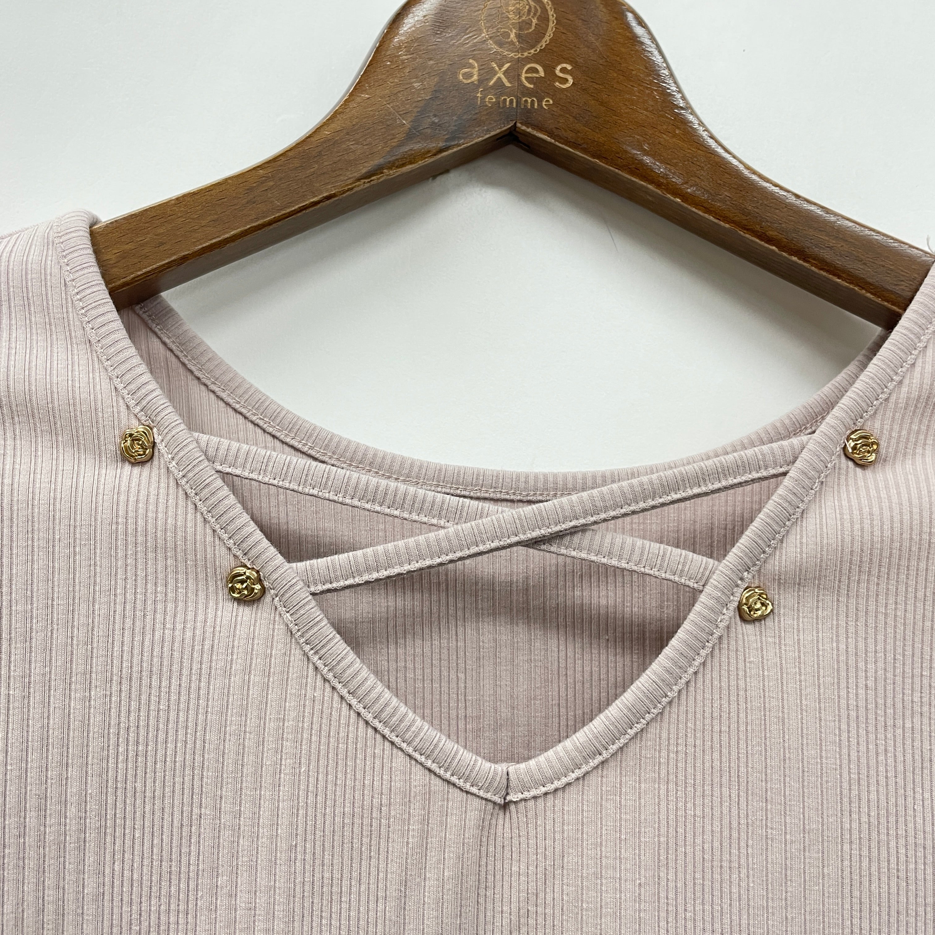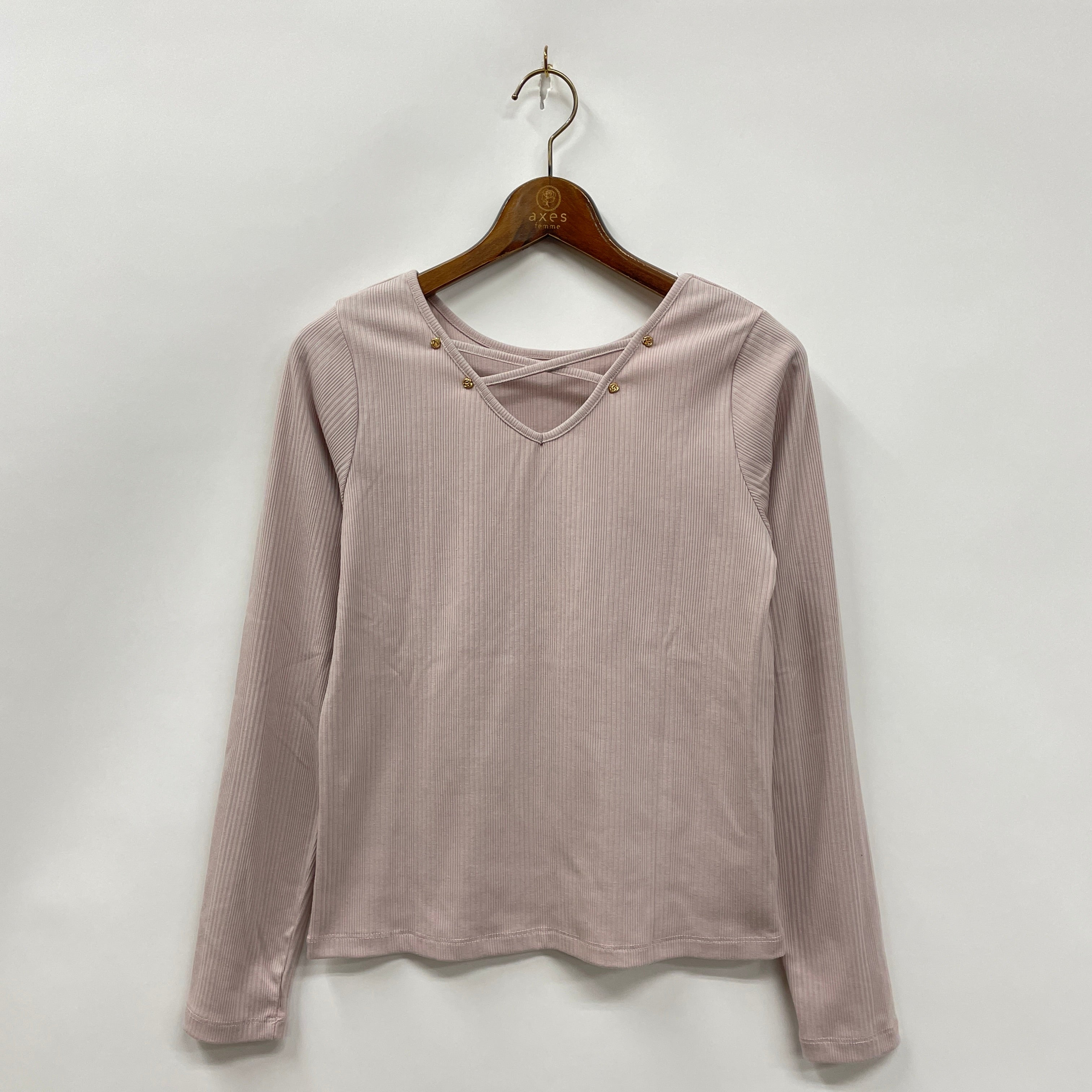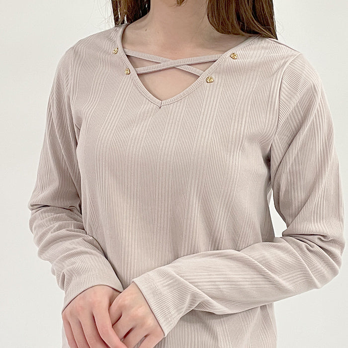 さりげないバラのパーツ使いと、クロスデザインがポイントのリブプルオーバーです。