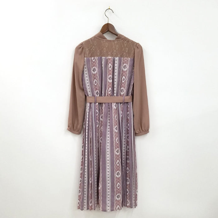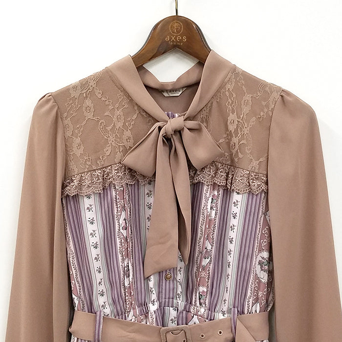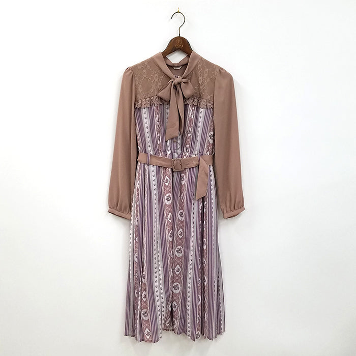 ヘリテージシリーズのワンピース。大きめのボウタイやレース使いでレトロでクラシカルの雰囲気を表現しています。後ろはウエストゴム、ヨーク部分にギャザーをいれ着やすさも。