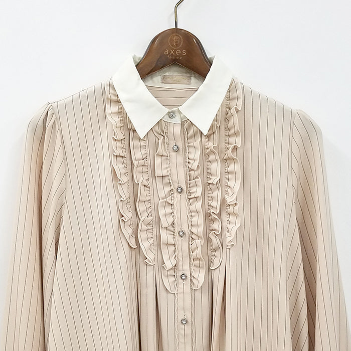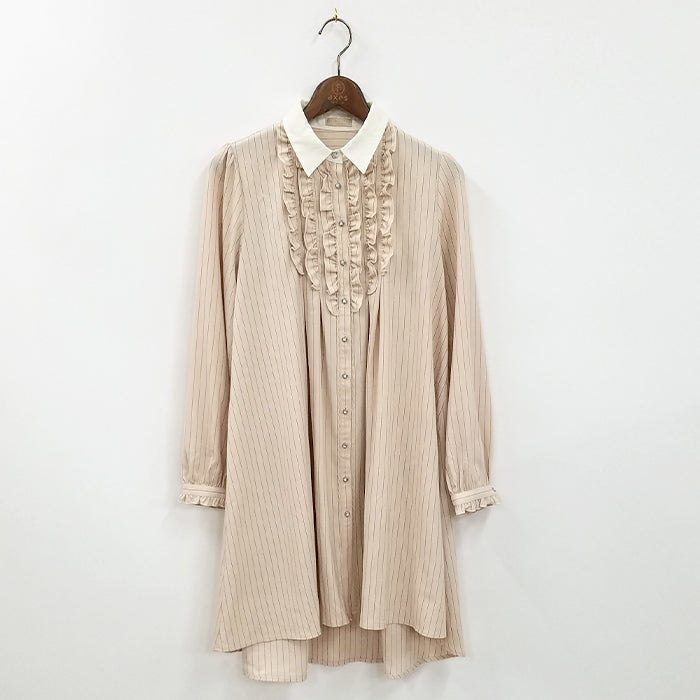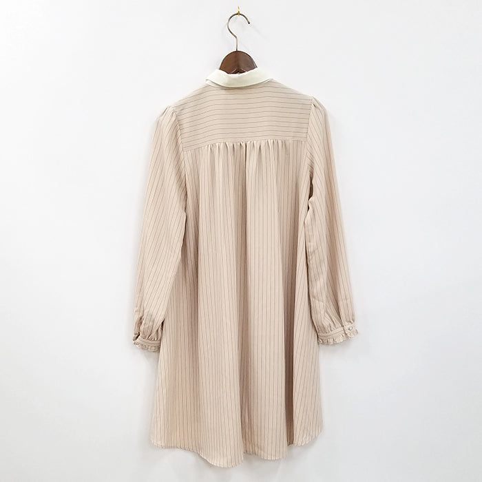 落ち感のあるピンストライプの生地を使用したシャツ風のワンピースです。丈に前後差をつけたフィッシュテールデザインになっています。メッセージプリントの入ったリボンがポイントです!