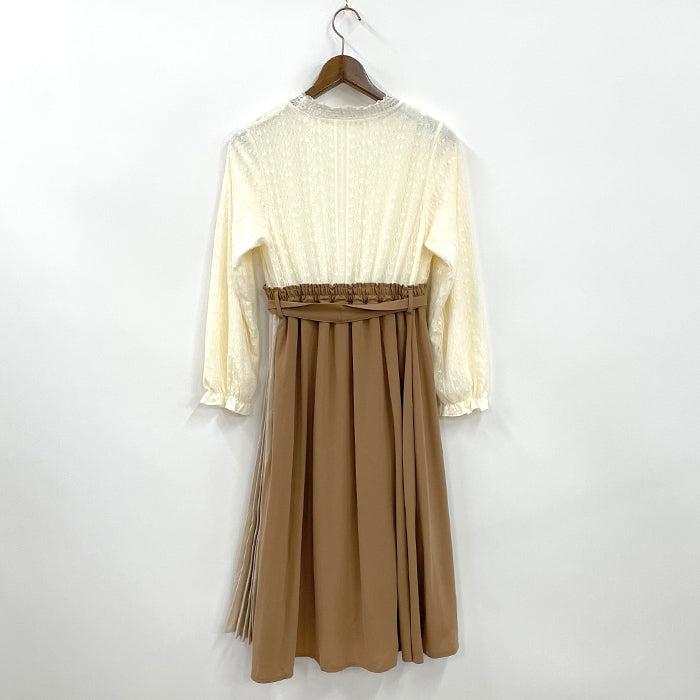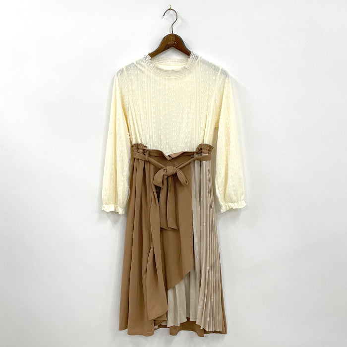 ラッフルフリル×プリーツの切替がポイントのドッキングワンピース。1枚でコーデが決まる万能アイテム。トレンチコート等長めの丈感の羽織と合わせるのがオススメです。