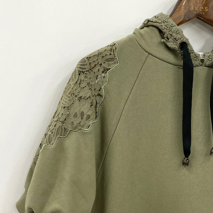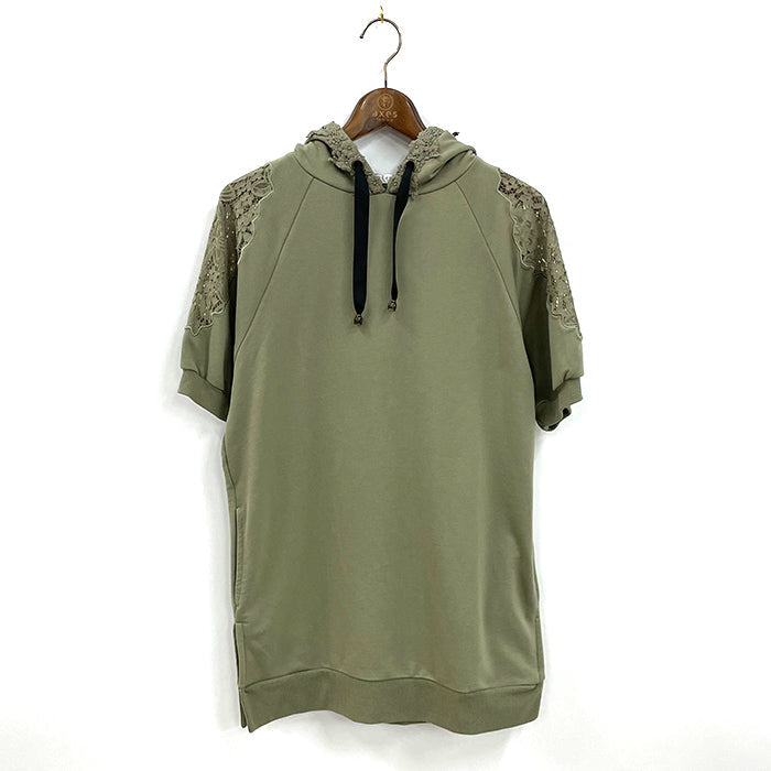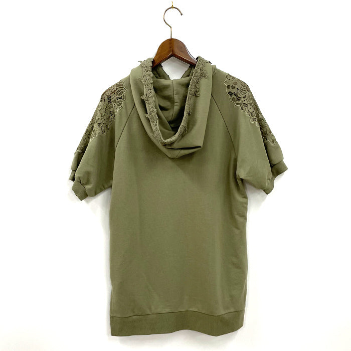 肩部分やフードまわりのレース使いがフェミニンなパーカー。チュニック丈で小柄な方、高身長な方も合わせるアイテム次第でさまざまな着こなしができます。ミニ裏毛素材は透けにくく手触りもよいため着やすい点が◎。おうちコーデ、ちょっとしたおでかけにも使えるカジュアルアイテム。