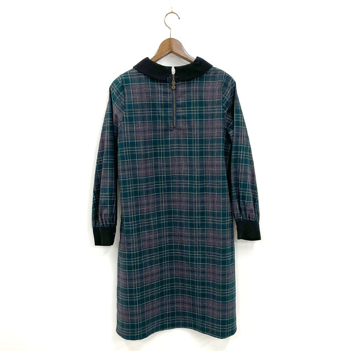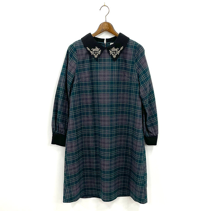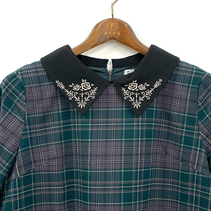 THE SCOTTISH REGISTER OF TARTANS に登録されたaxes femme オリジナルタータンチェックを使用したワンピースです。クレリック風の襟デザインが配色になっておりクラシカルな装いに。オーナメント×バラモチーフの刺繍が施されています。太めのジップを使用した後ろデザインのため着脱しやすくなっています。さりげないチャームもバラデザインを落とし込み細部までこだわったアイテム。お好みでペチスカートや細めのベルトを合わせたコーディネートがおすすめ。