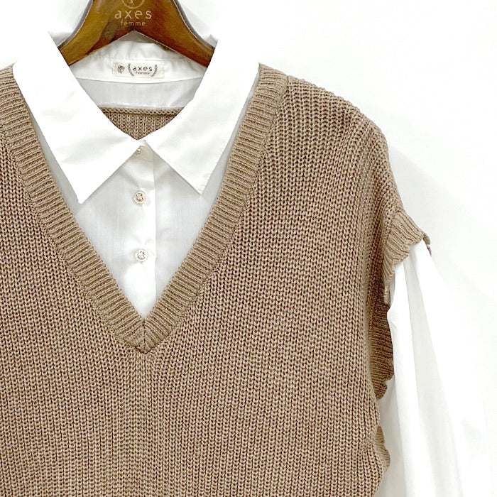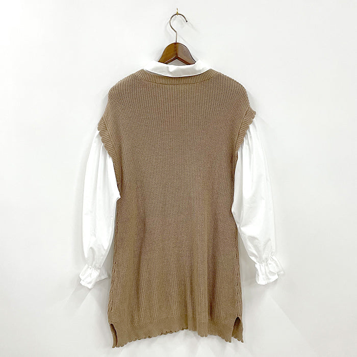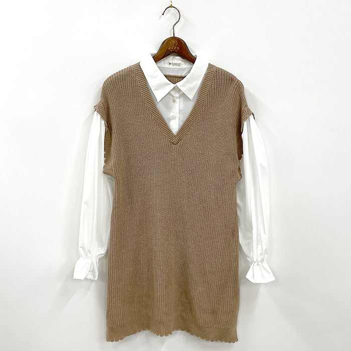 シャツにニットベストを合わせた、レイヤード風デザインのミニ丈ワンピースです。