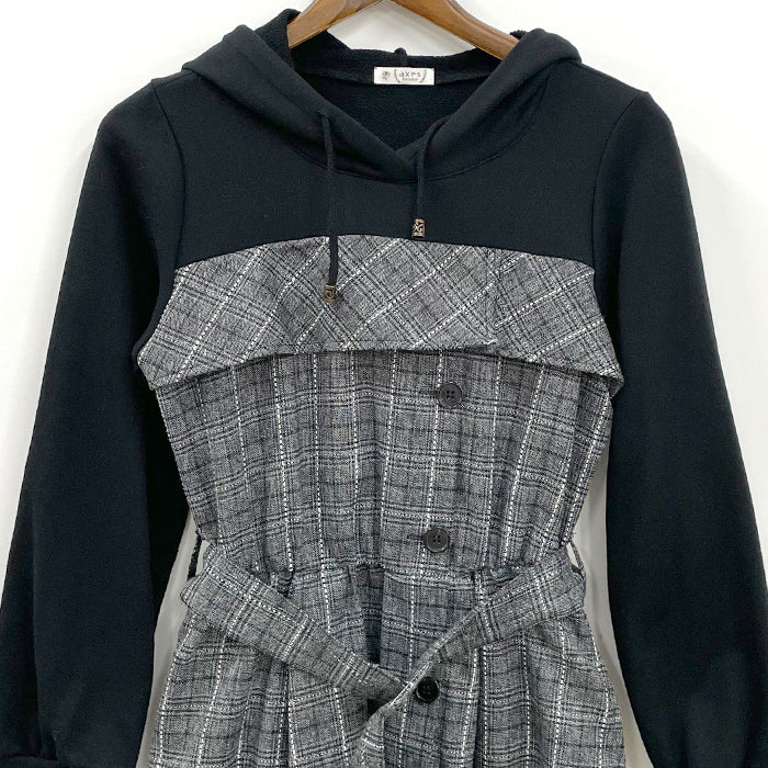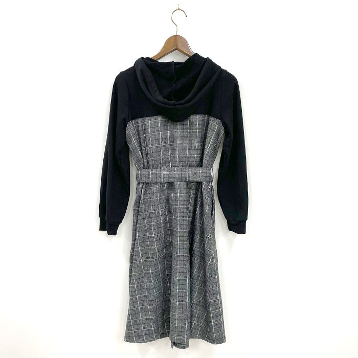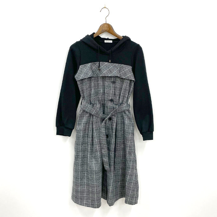 フード付パーカーとビスチェワンピースがドッキングしたデザインのワンピース。上身はカットソー素材で着やすくリラックスして着用できます。