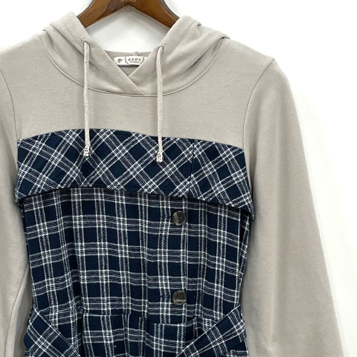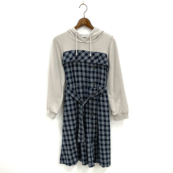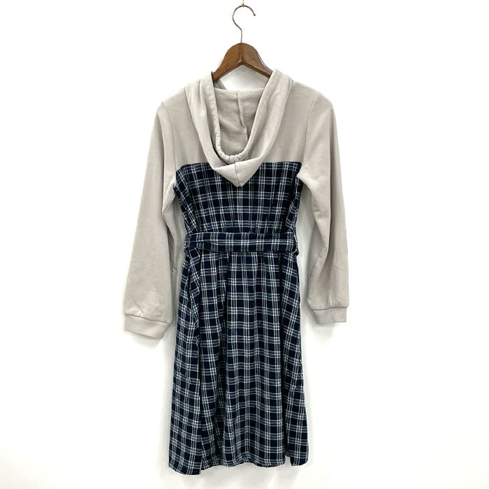 フード付パーカーとビスチェワンピースがドッキングしたデザインのワンピース。上身はカットソー素材で着やすくリラックスして着用できます。