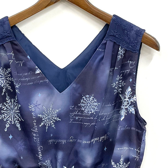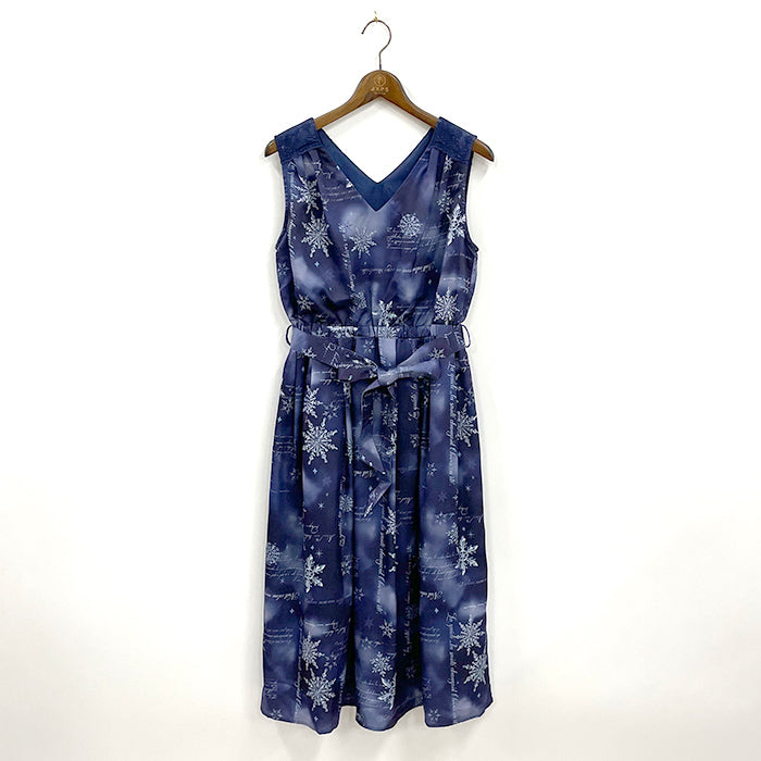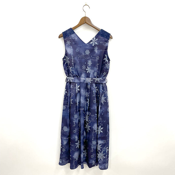 やわらかな色合いの中に様々な形の雪の結晶が輝く、広がりが美しいワンピースです。