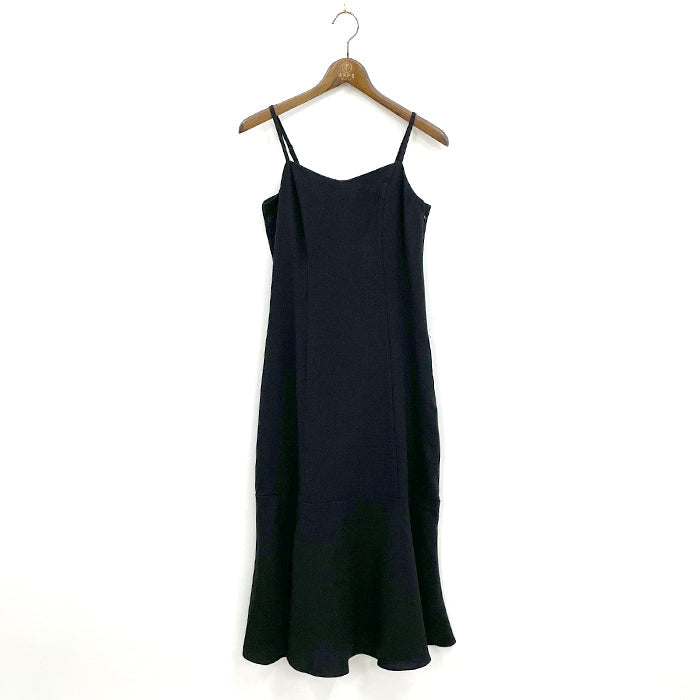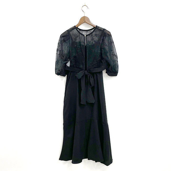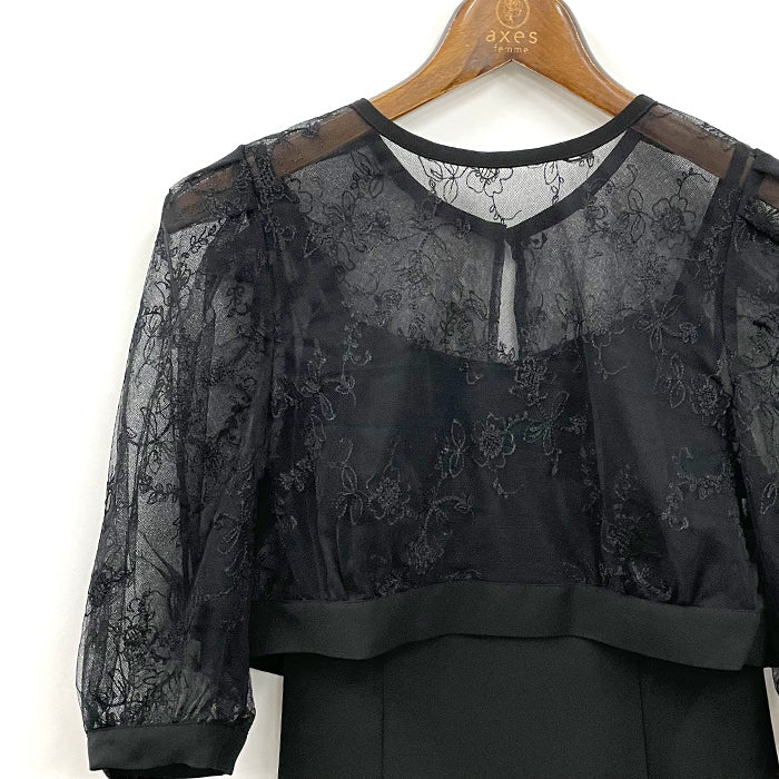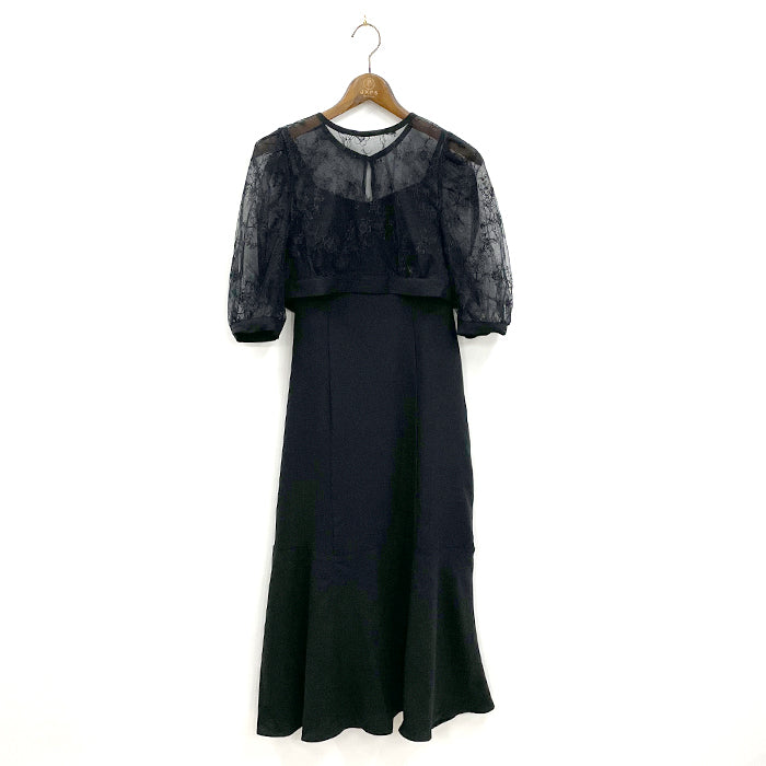 繊細なチュールレースのトップスとシンプルなキャミワンピースがセットになったアイテム。裾の切り替えが広がりすぎないエレガントなシルエットに。