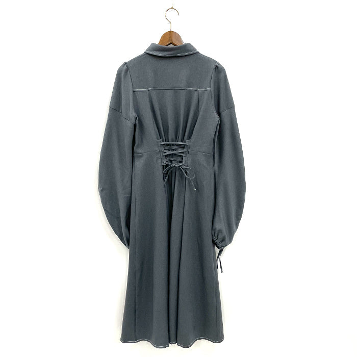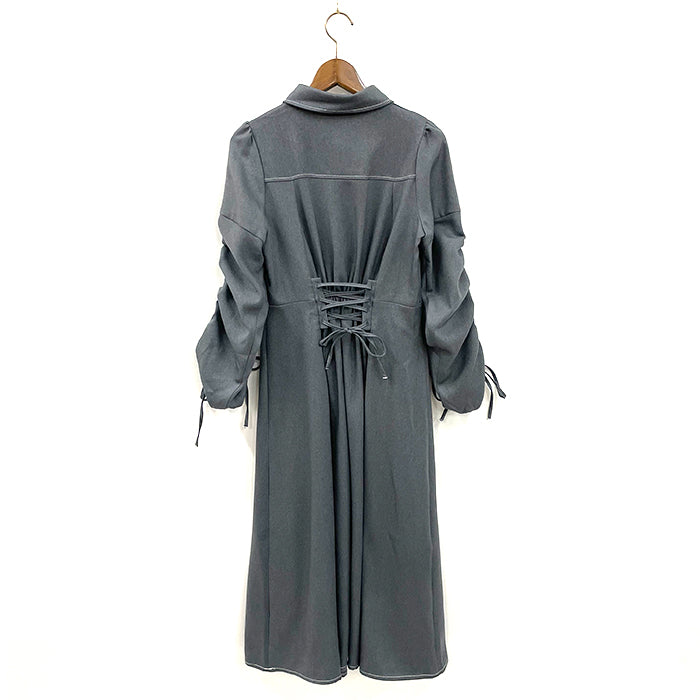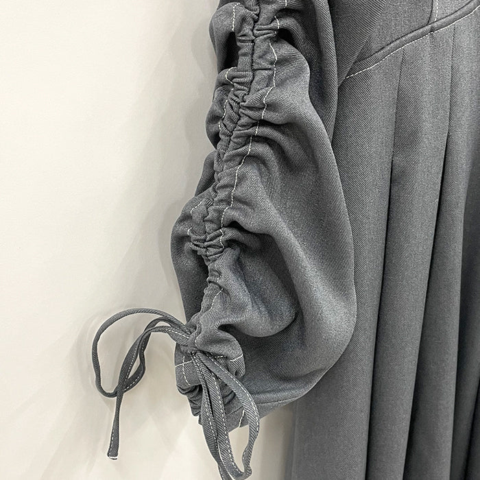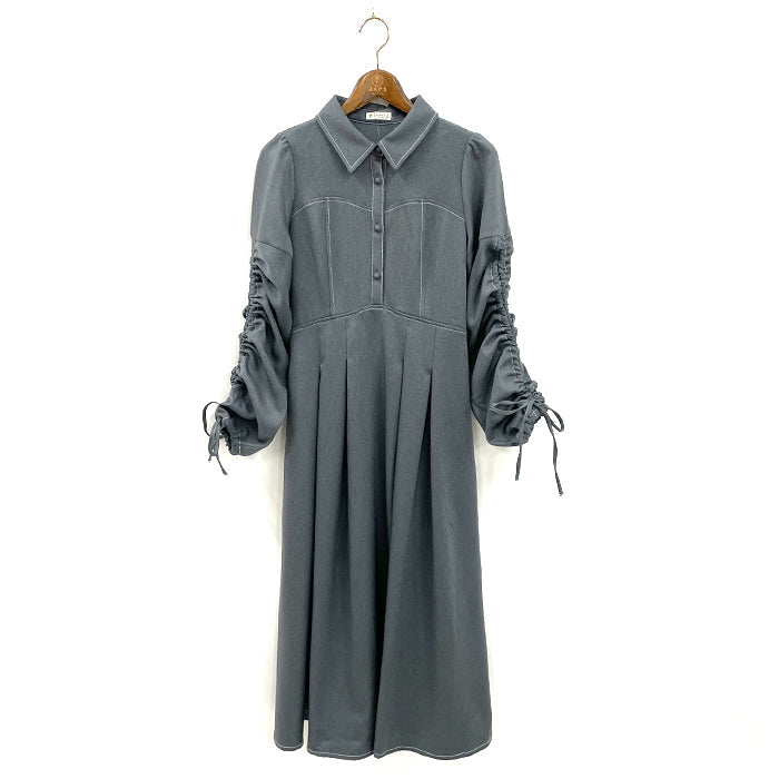 袖にはドロストデザインを取り入れアクセントに。襟付きでかっちりとした印象もあり、1枚で様になるワンピースです。