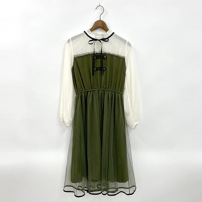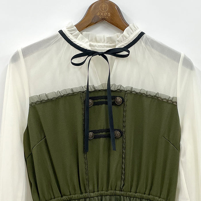 ナポレオンデザイン風にボタンとコードをあしらったワンピースです。