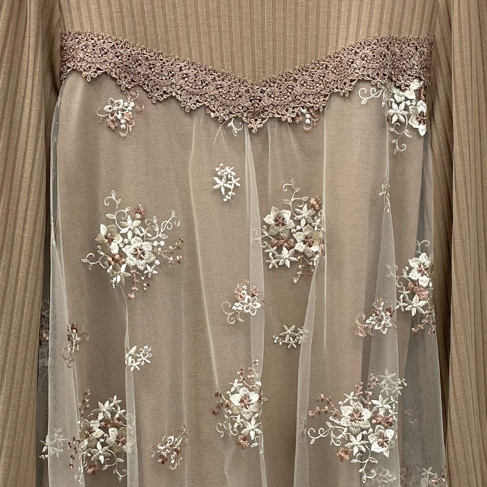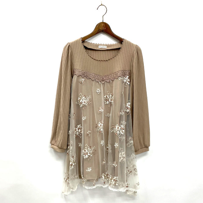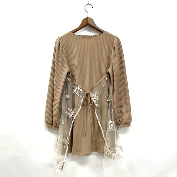チュール×刺繍の春らしい華やかな印象のチュニックです。カットソーとの重ねになっているため伸縮性も良く、前はビスチェ切り替え、後ろは結ぶデザインになっています。刺繍カラーはカットソー部分の色によって異なるため、色によって印象が変わります。デニムパンツなどすっきりしたボトムスと合わせても、フェミニンな雰囲気になるaxes femmeらしい1枚です。