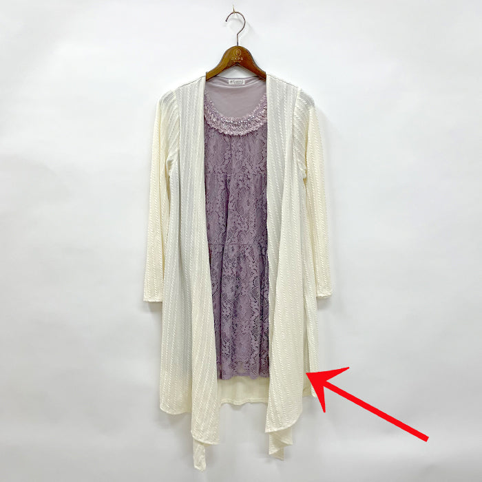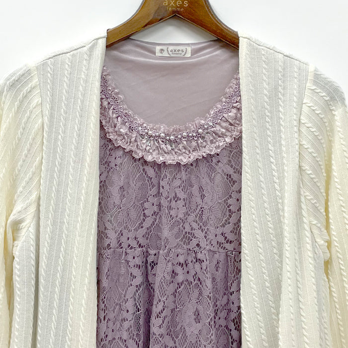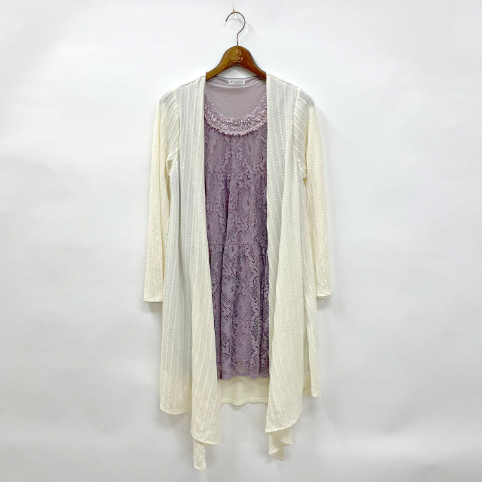 レースチュニックにカーディガンを羽織ったような、フェミニンなレイヤード風デザインのチュニックです。
