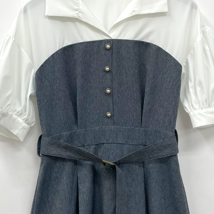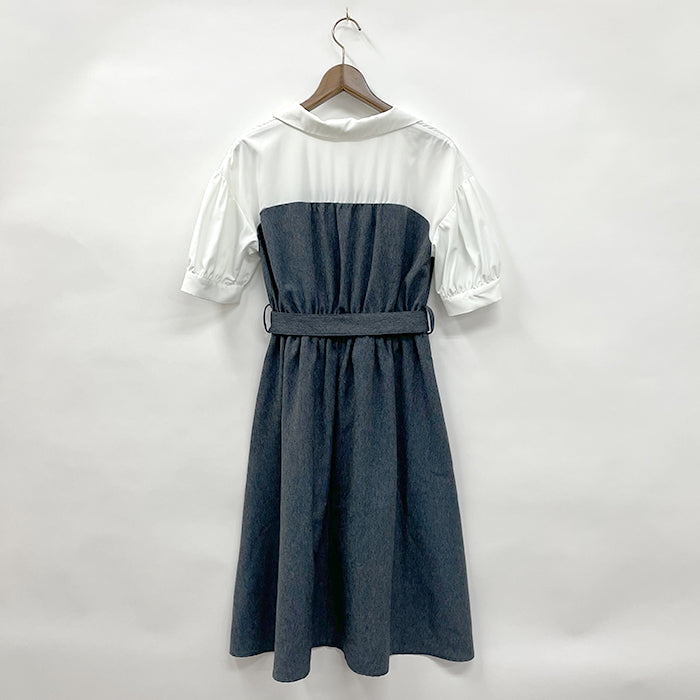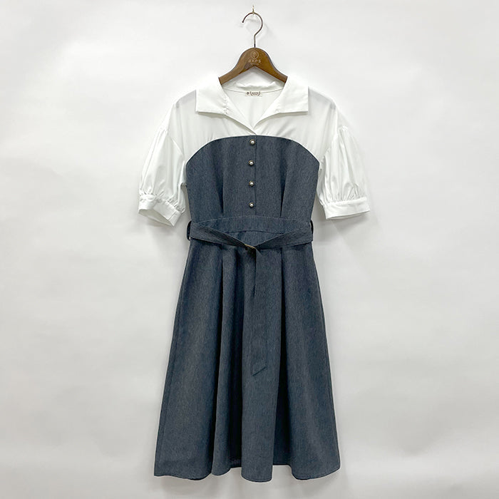 すっきりとしたシャツ襟にビスチェ切替のドッキングデザインワンピースです。