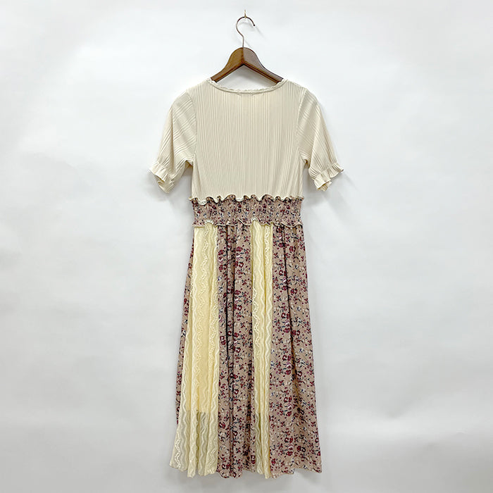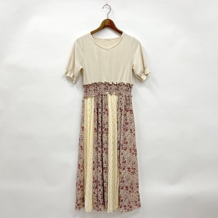 レース×花柄のスカート部分がポイントのドッキングワンピースです。レースは微起毛タイプのものを使用しており、初秋まで長く着られます。花柄は派手になりすぎないよう、柄のサイズと色にこだわっています。リブ素材のトップス部分は伸縮性良く着られるので着やすさ◎1枚でコーデが決まる便利なアイテムです。