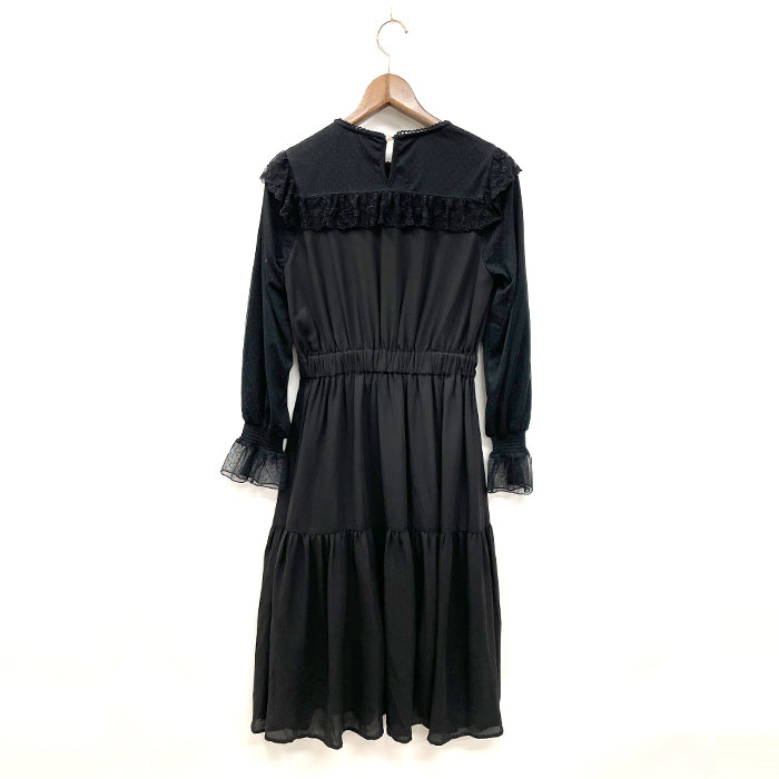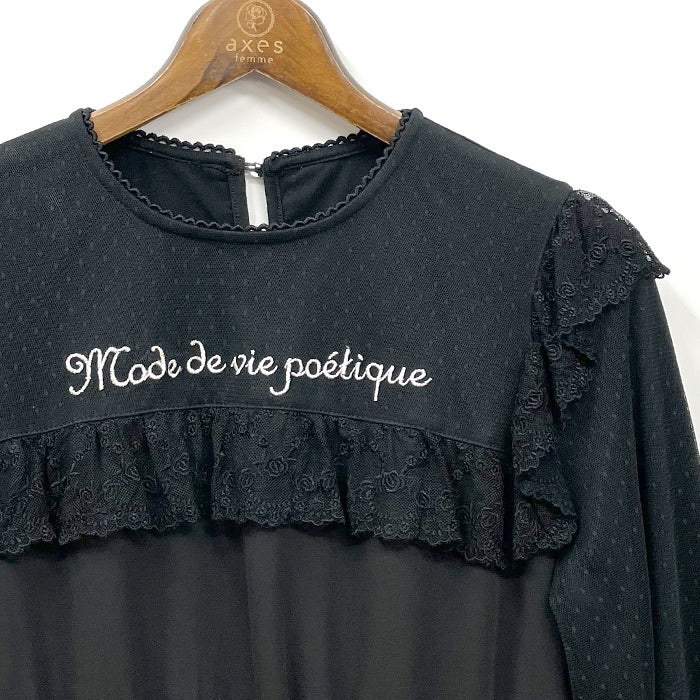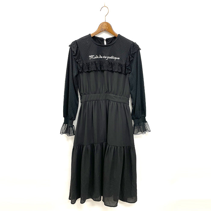 フランス語で施されたメッセージ刺繍が印象的なワンピース。繊細な柄のレースフリルがフェミニンな1枚です。無地のワンピースは合わせるアウターによって色々なスタイリングが楽しめます。