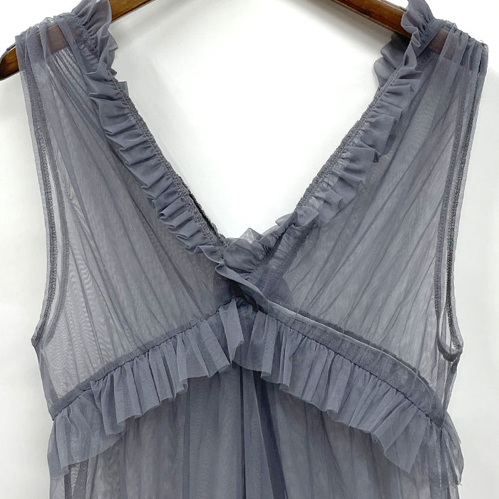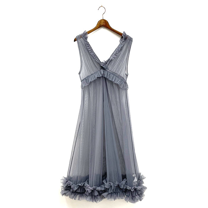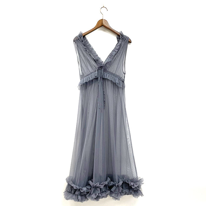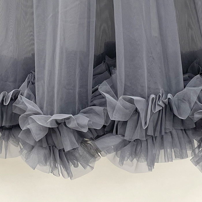 軽くて適度な透け感がチャーミングなチュール素材を使用し、フリルやリボンをあしらいました。前後どちらで着用しても問題ございません。