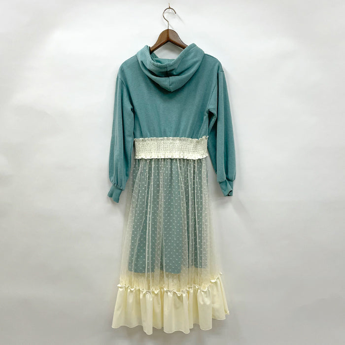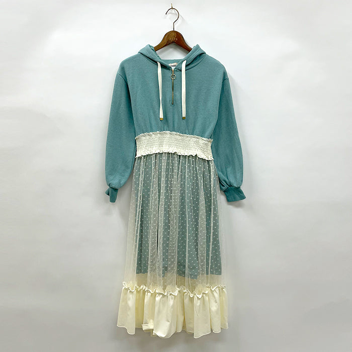 カジュアルなパーカーにドットチュールのスカートをドッキングしたデザインがガーリーミックスなアイテム!