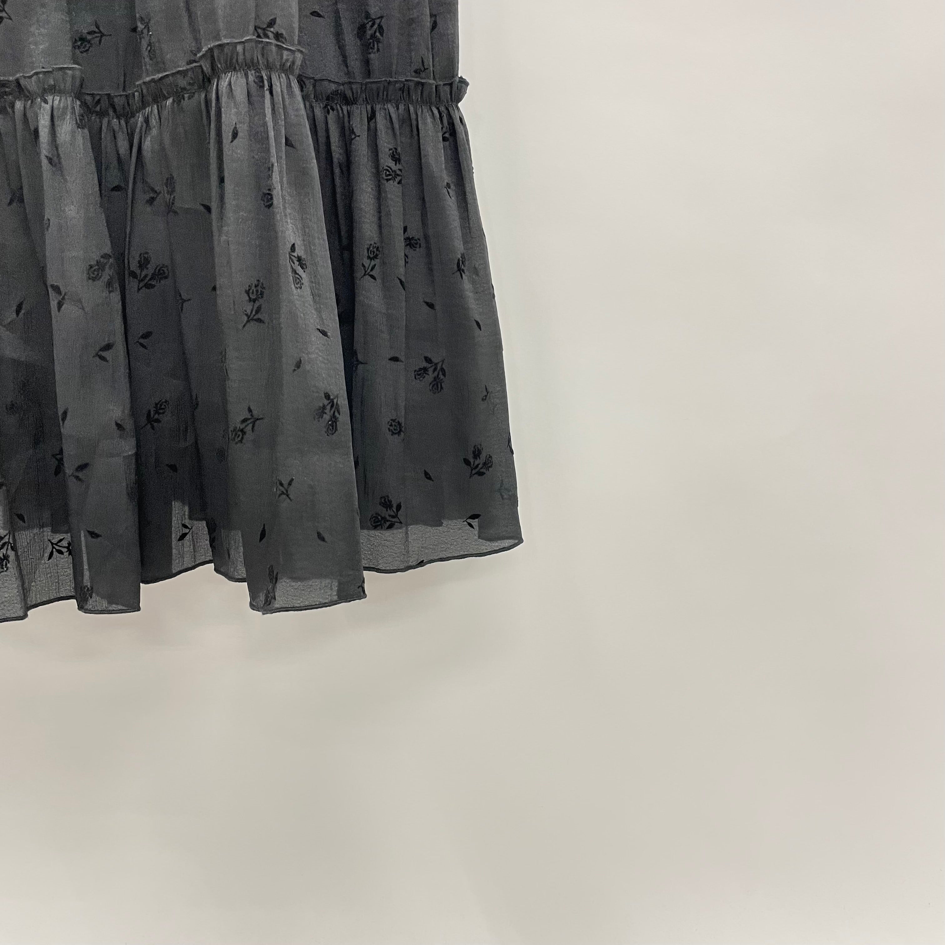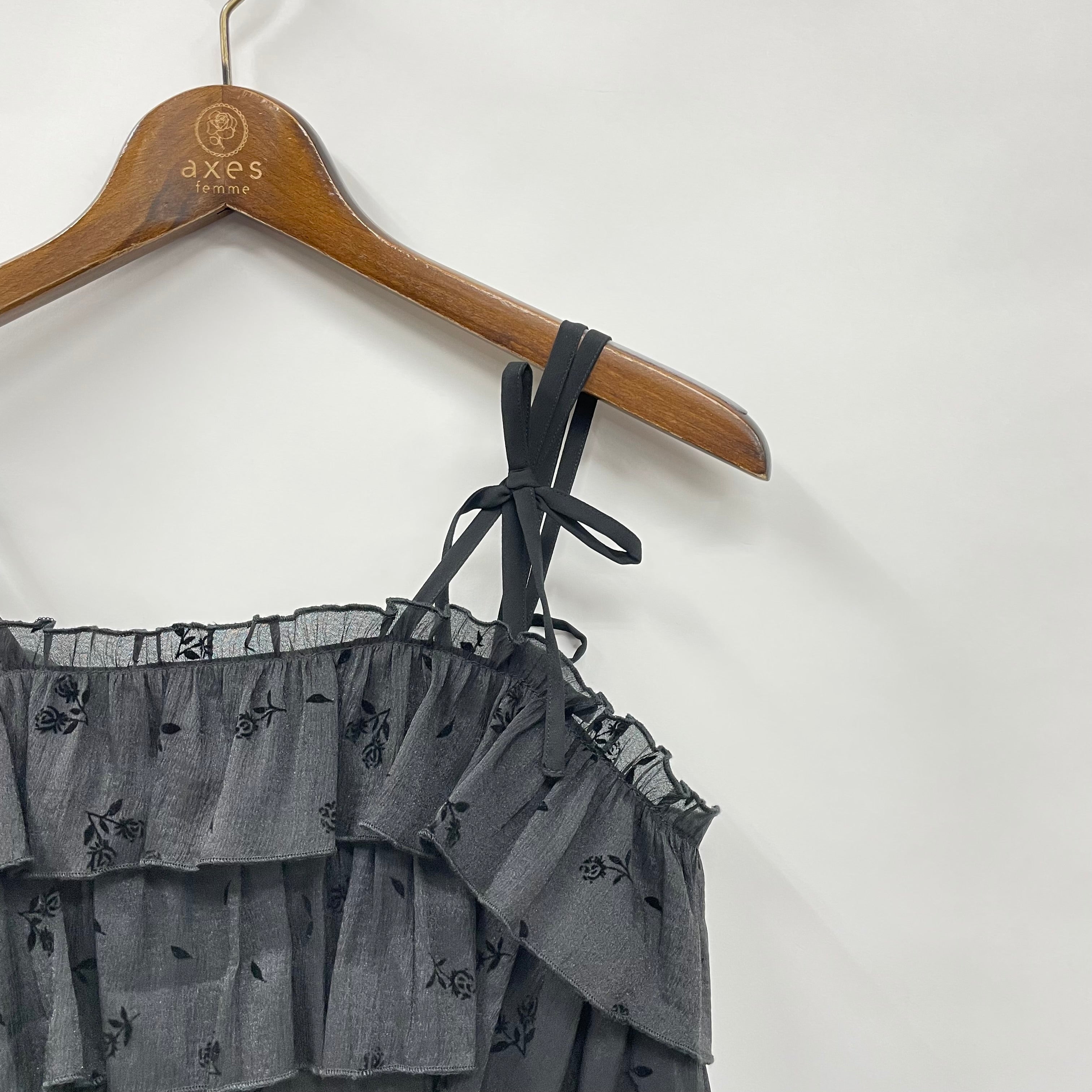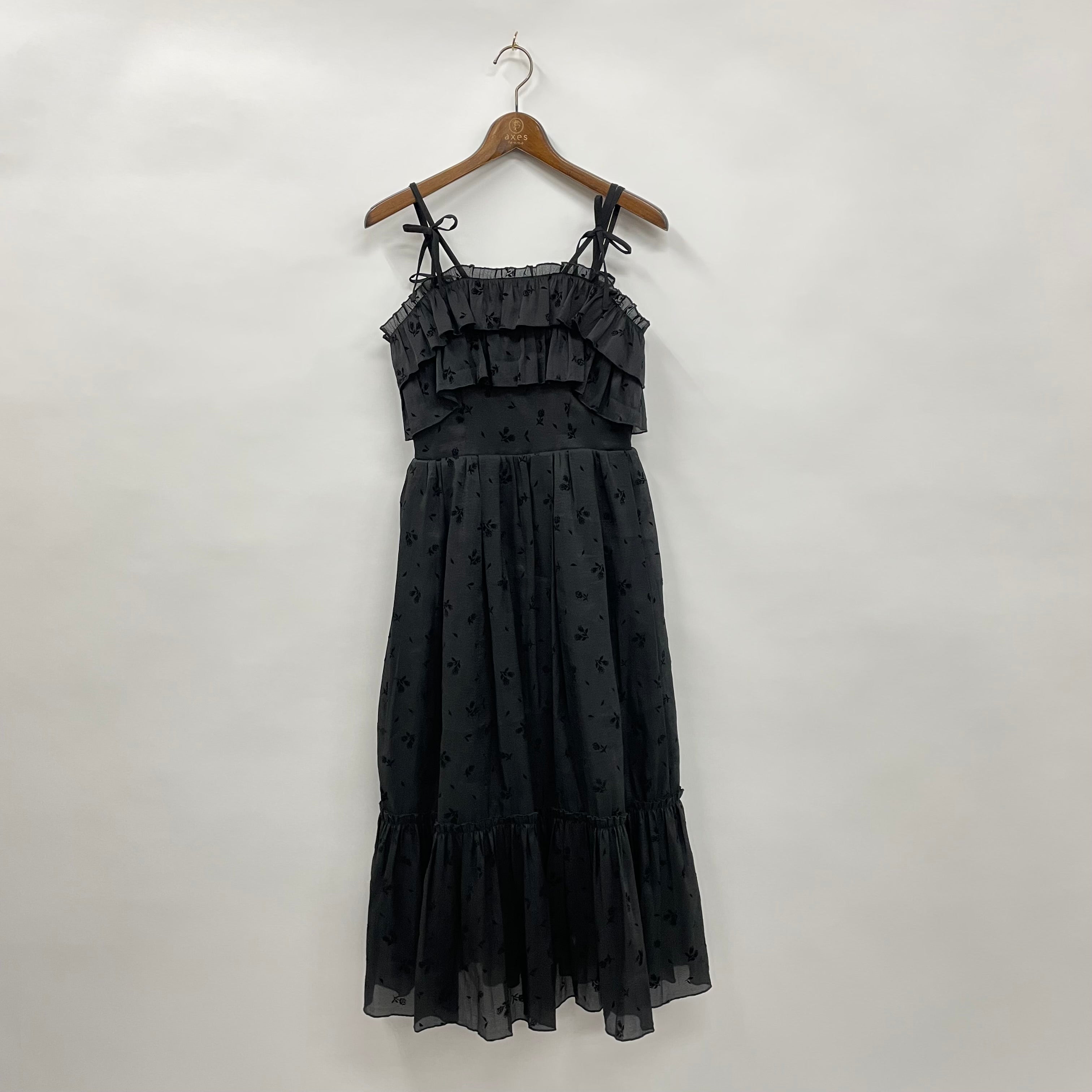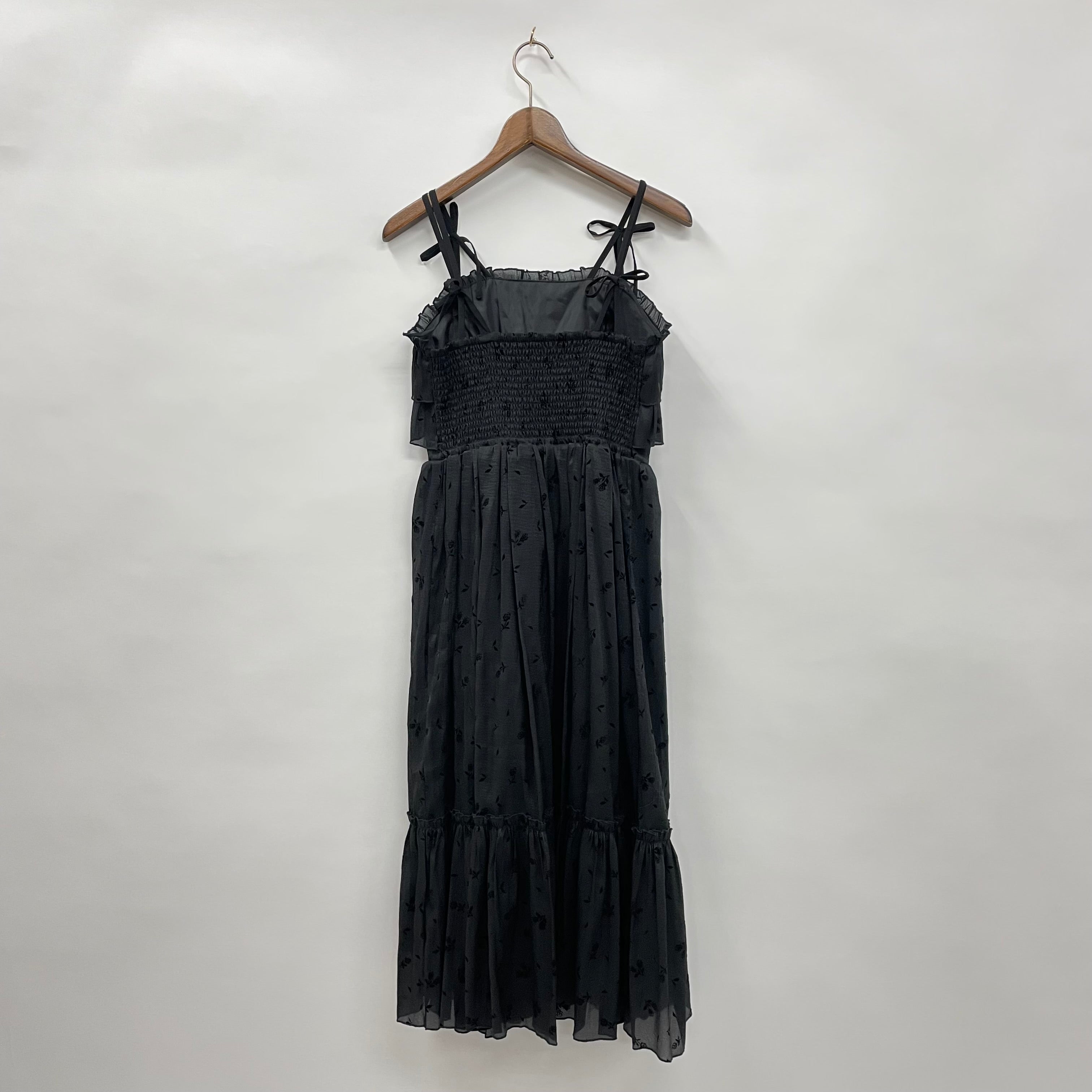 フロッキープリントのオーガンジーがふんわり広がるキャミワンピース。肩紐のブラックリボンがポイントです。黒の配色が甘すぎず、大人ガーリーに着こなせます。