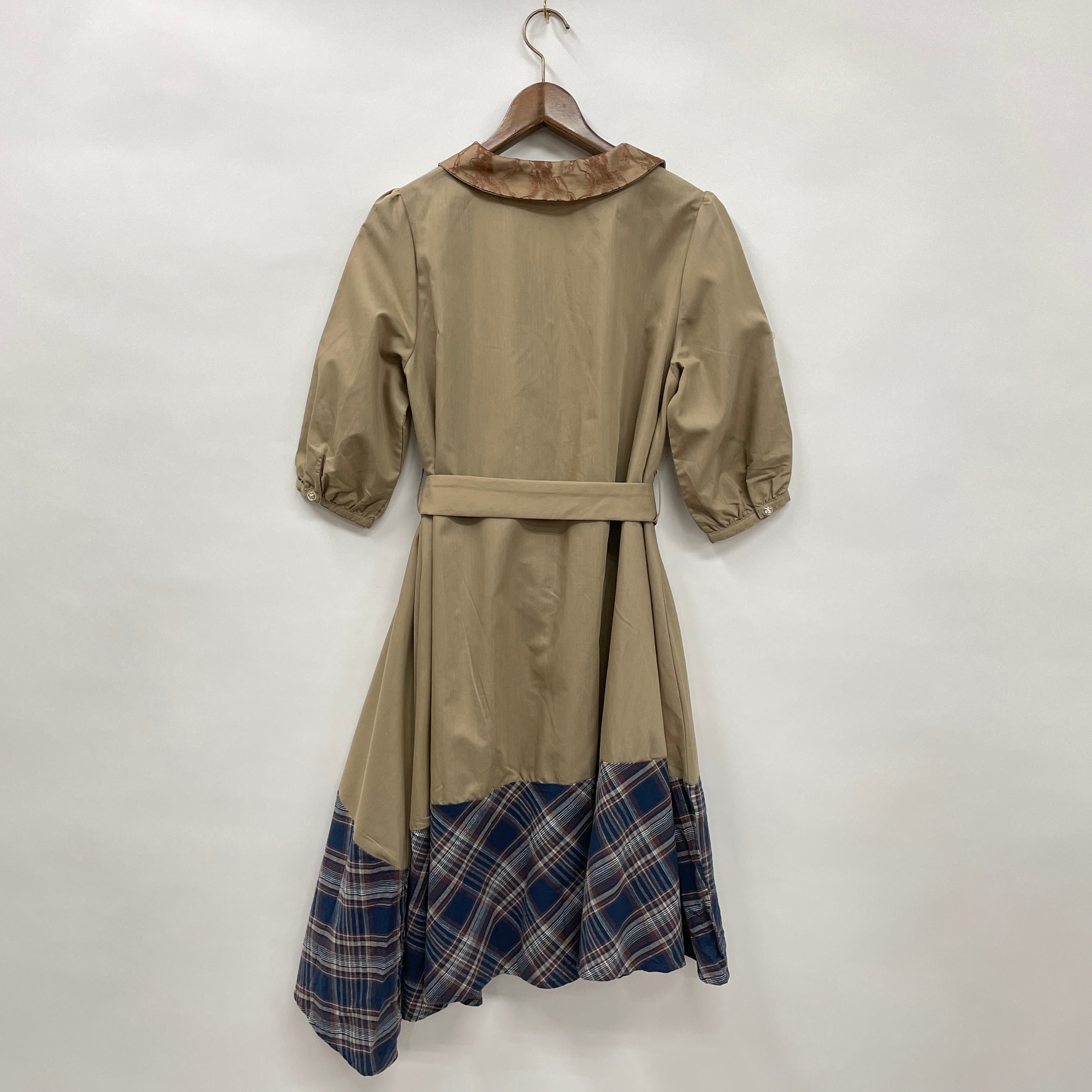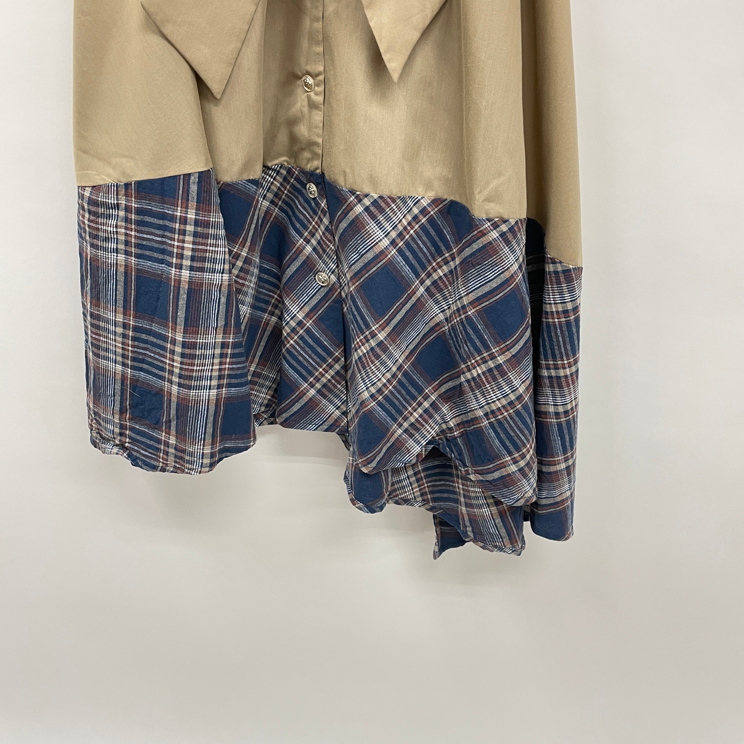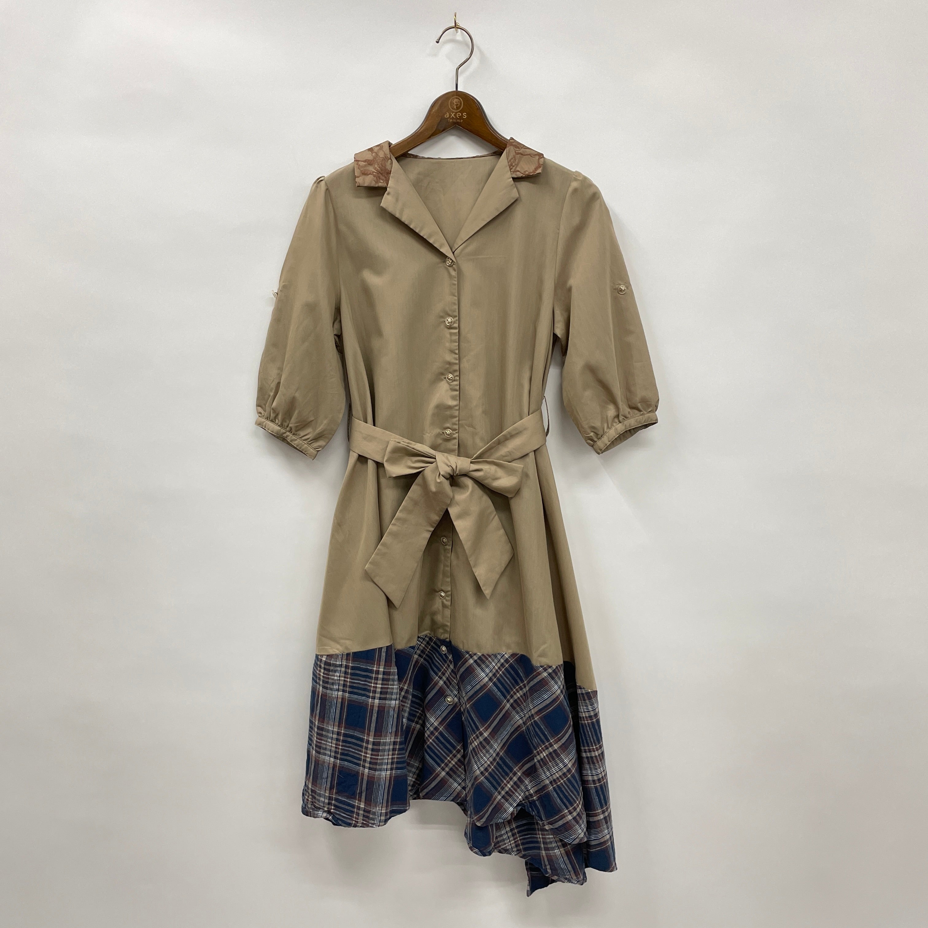 裾のイレギュラーヘムと切り替えがポイントのシャツワンピです。前を開ければ、羽織としても使える優れもの。ウエストのリボンは取り外し可能になっています。