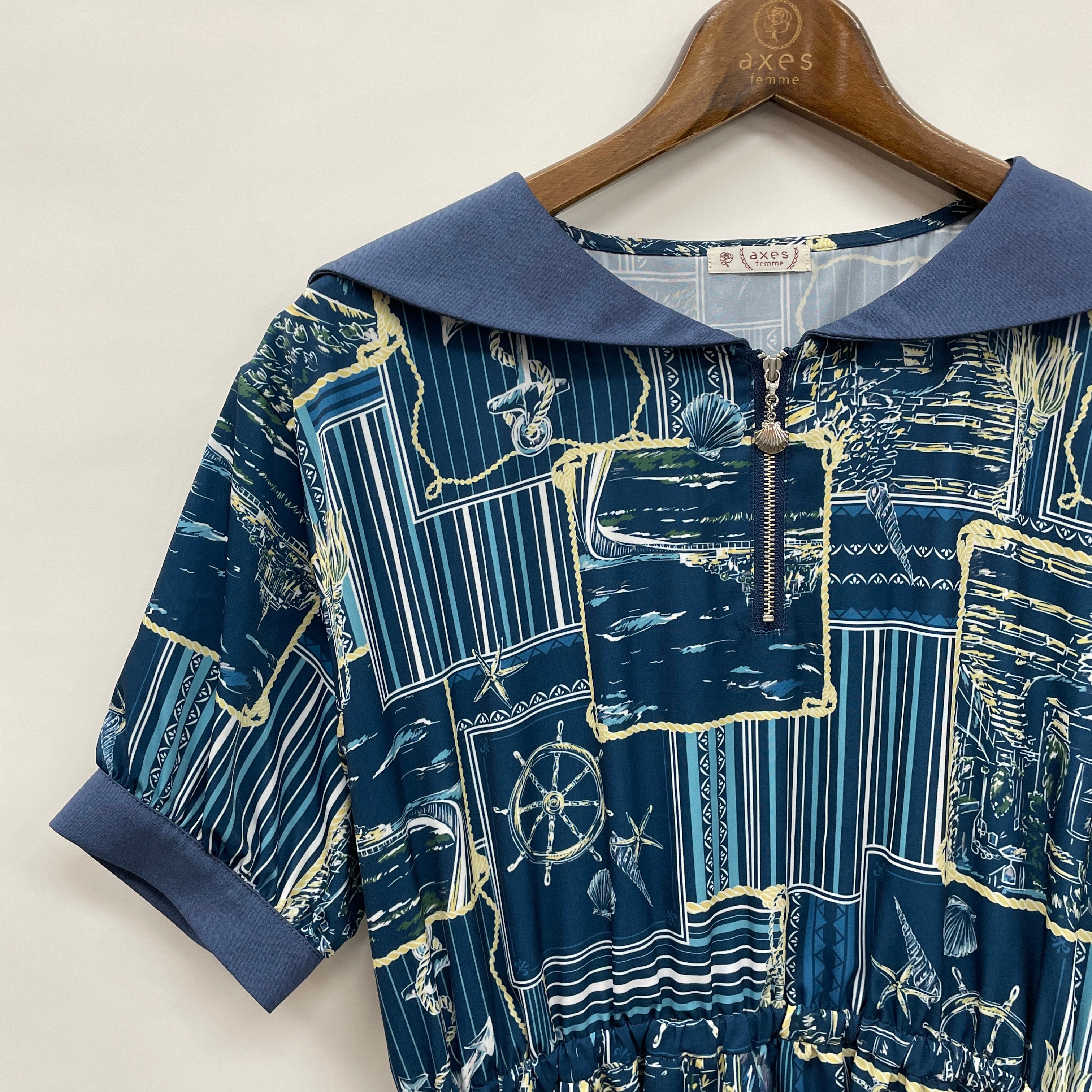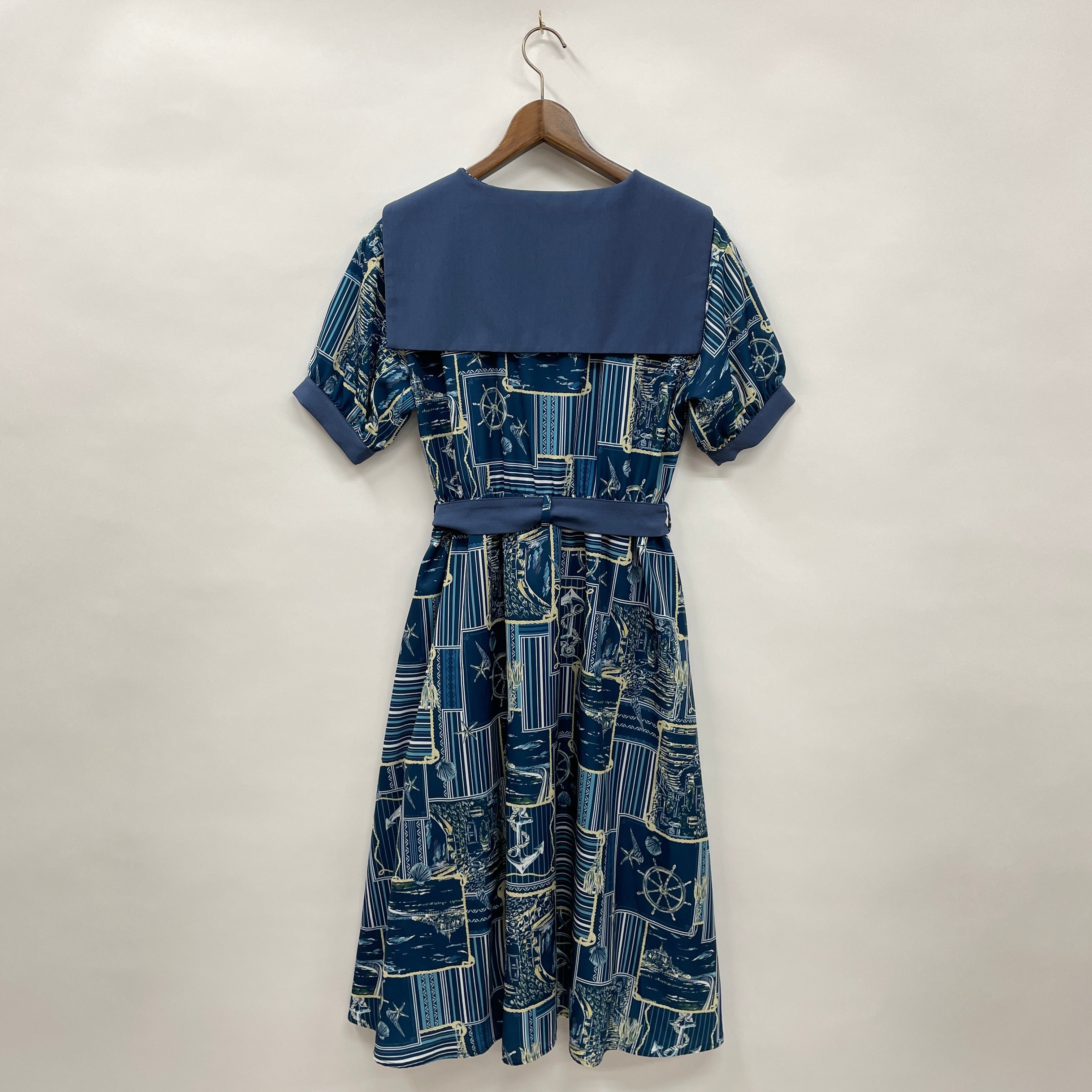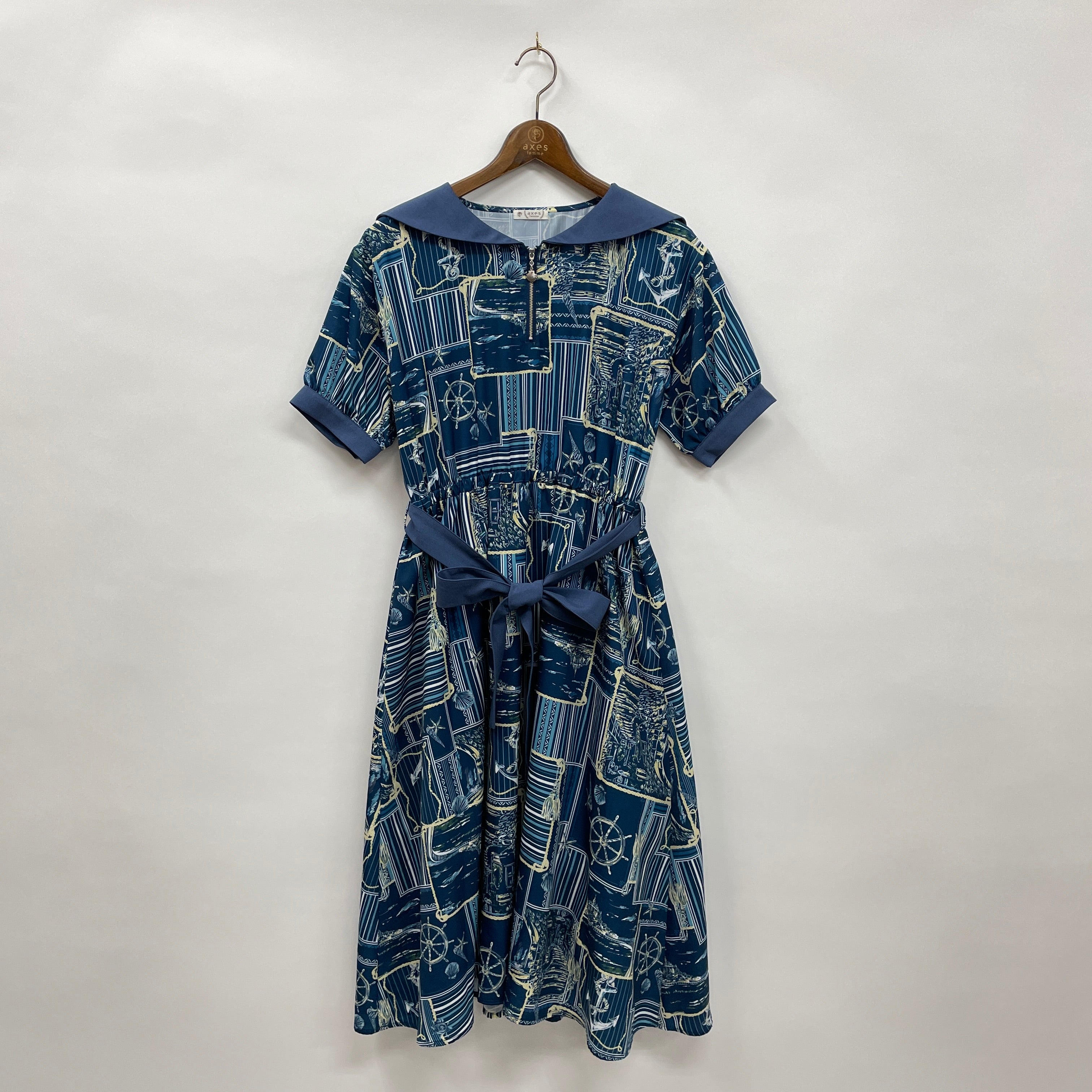 パリの小道やモンサンミッシェルなどのフレンチモチーフと貝殻、錨、ロープなど夏らしいマリンモチーフをミックスしたスカーフのようなオリジナルプリント柄が目をひくワンピースです。
