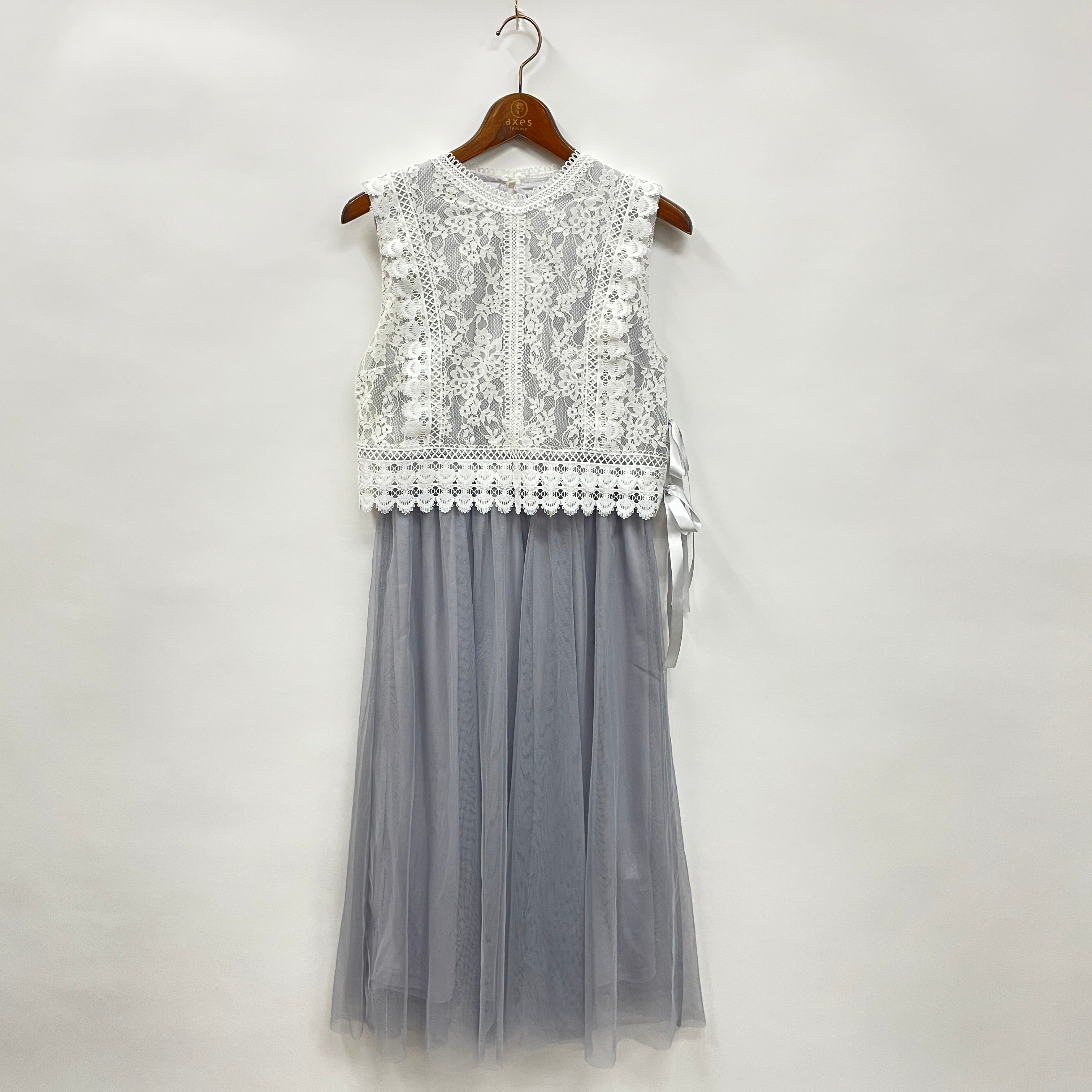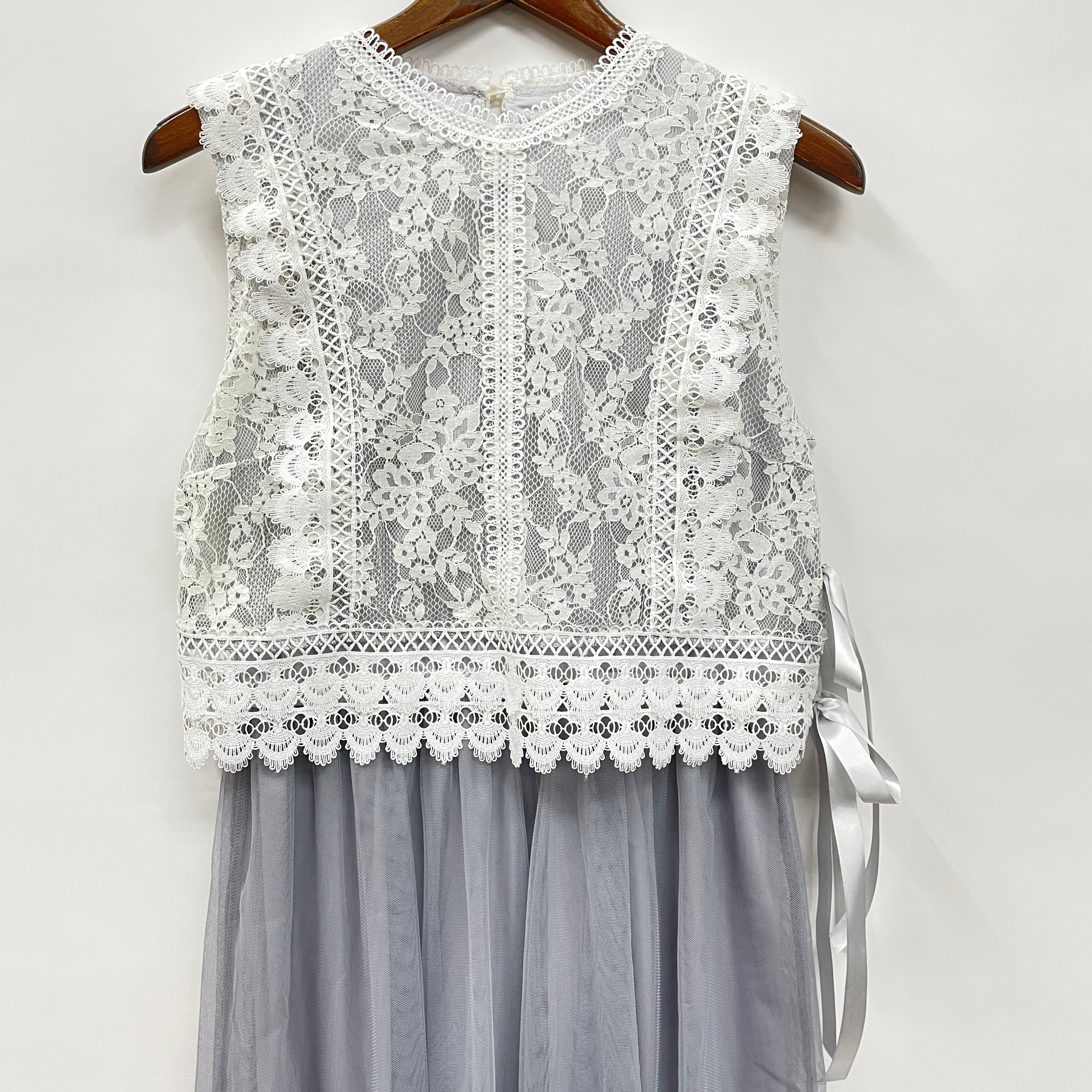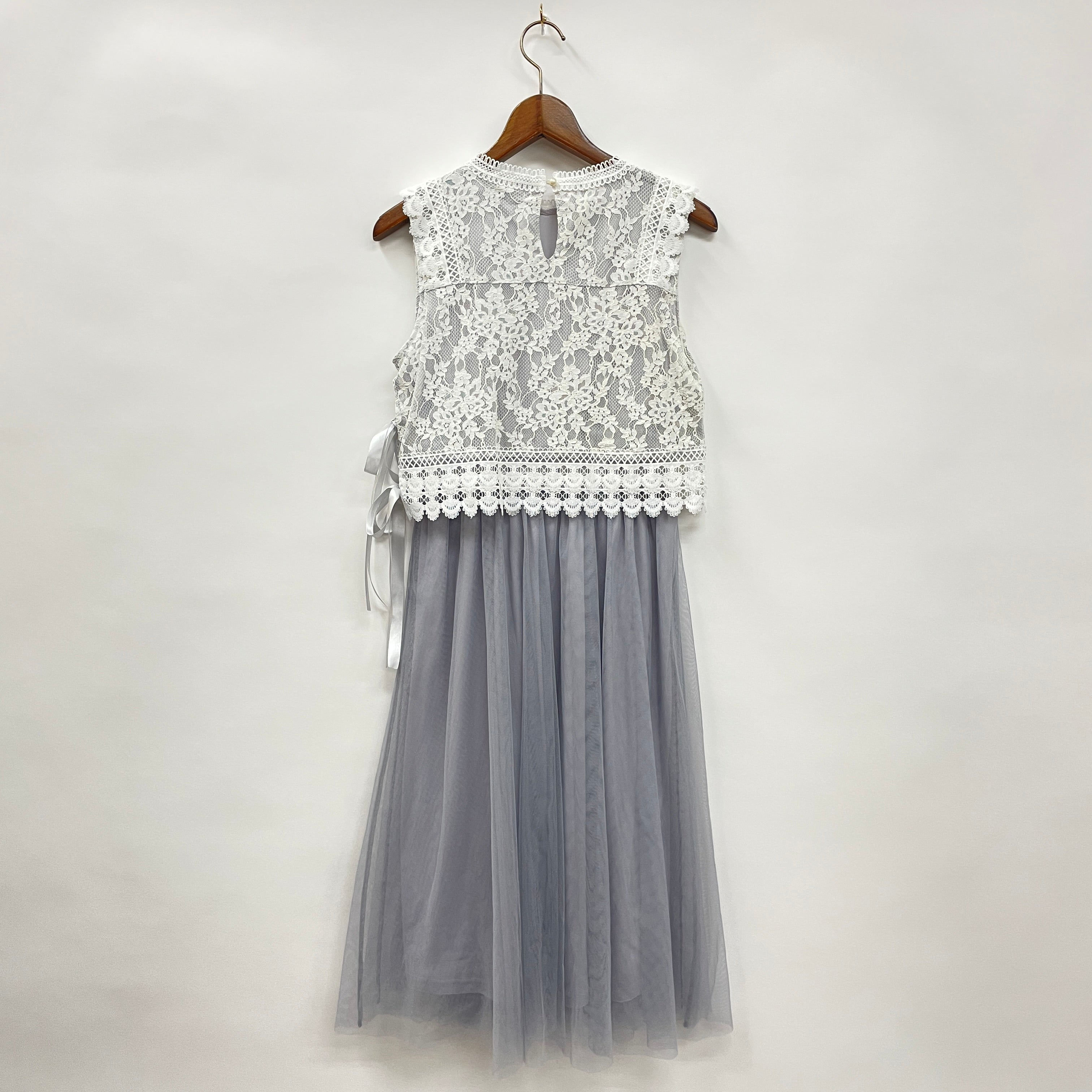 レーストップスとチュールスカートをドッキングしたデザインのワンピース。サイドリボンがポイントに。ちょっとしたお出かけ着からオケージョンシーンにもおすすめなアイテム。