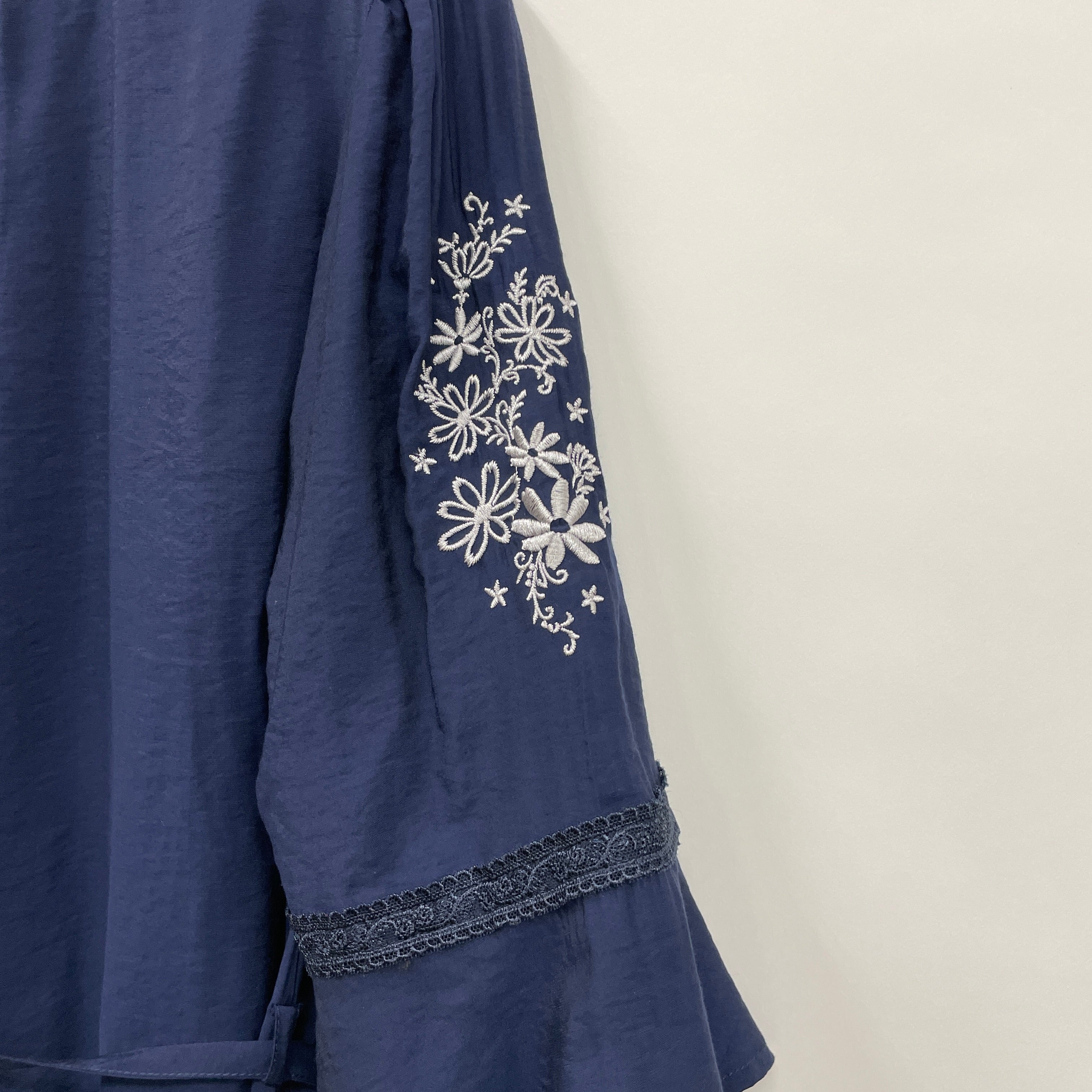 カジュアルなデザインの中に、フレアに広がる袖口やパールボタンなど、フェミニンなディティールをさりげなく取り入れています。