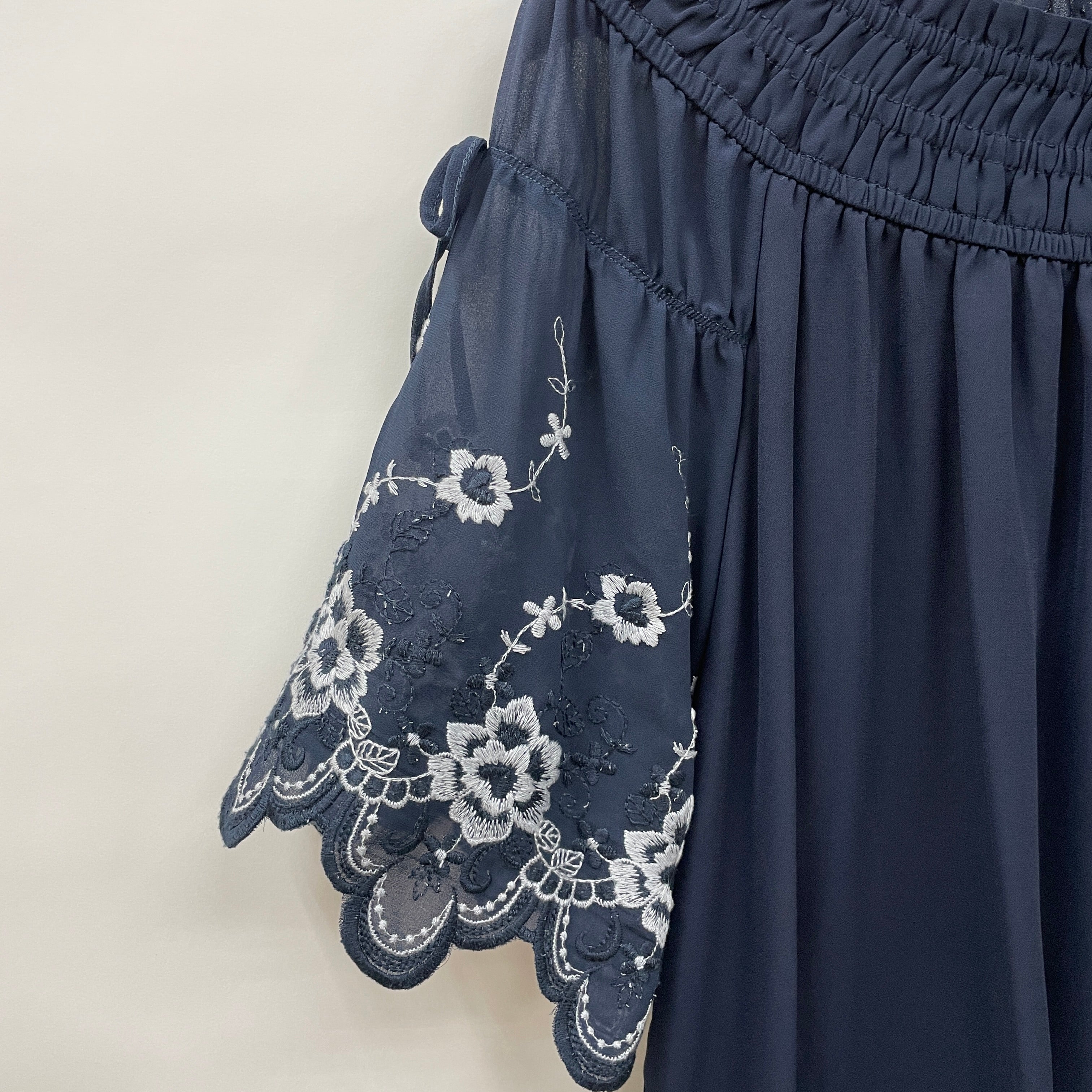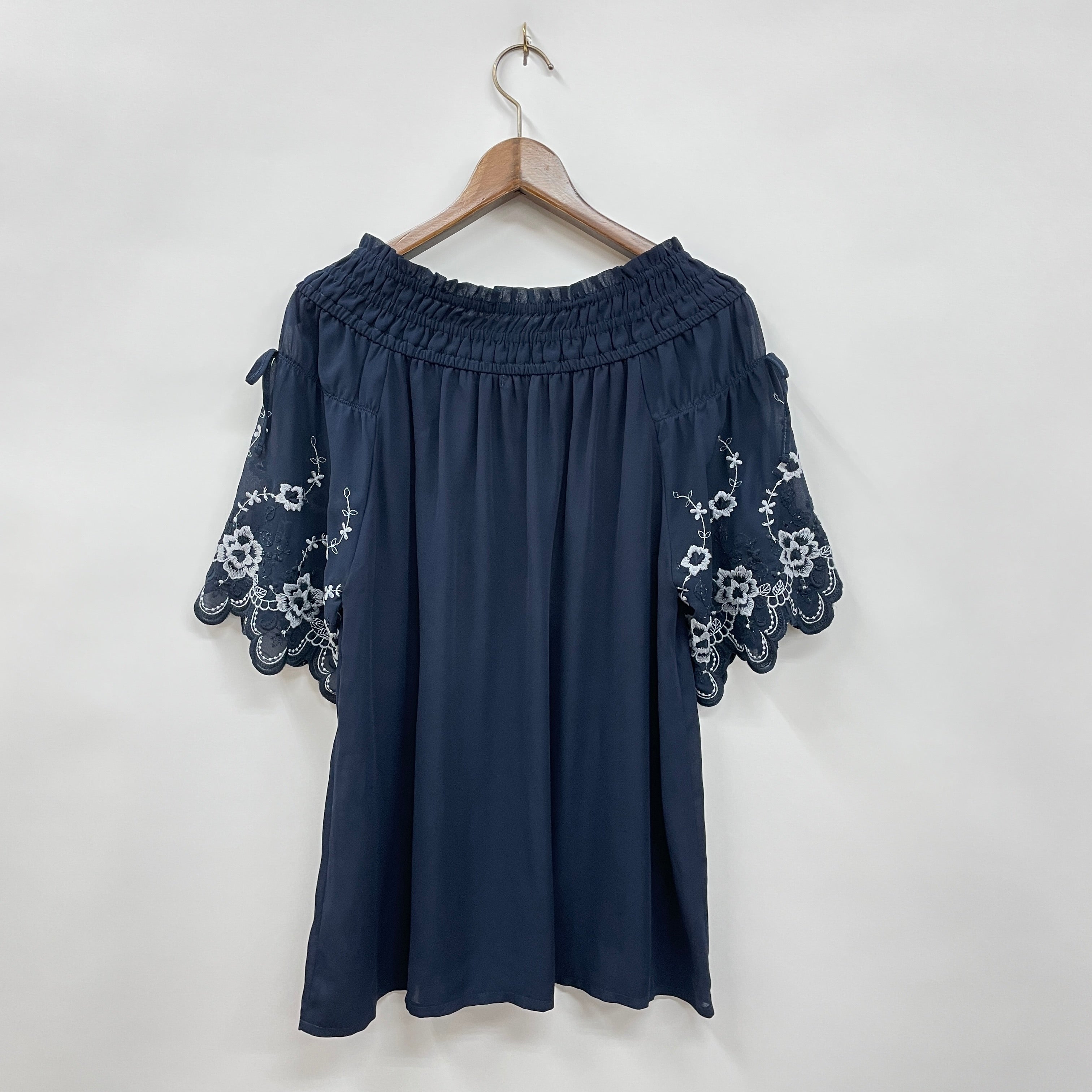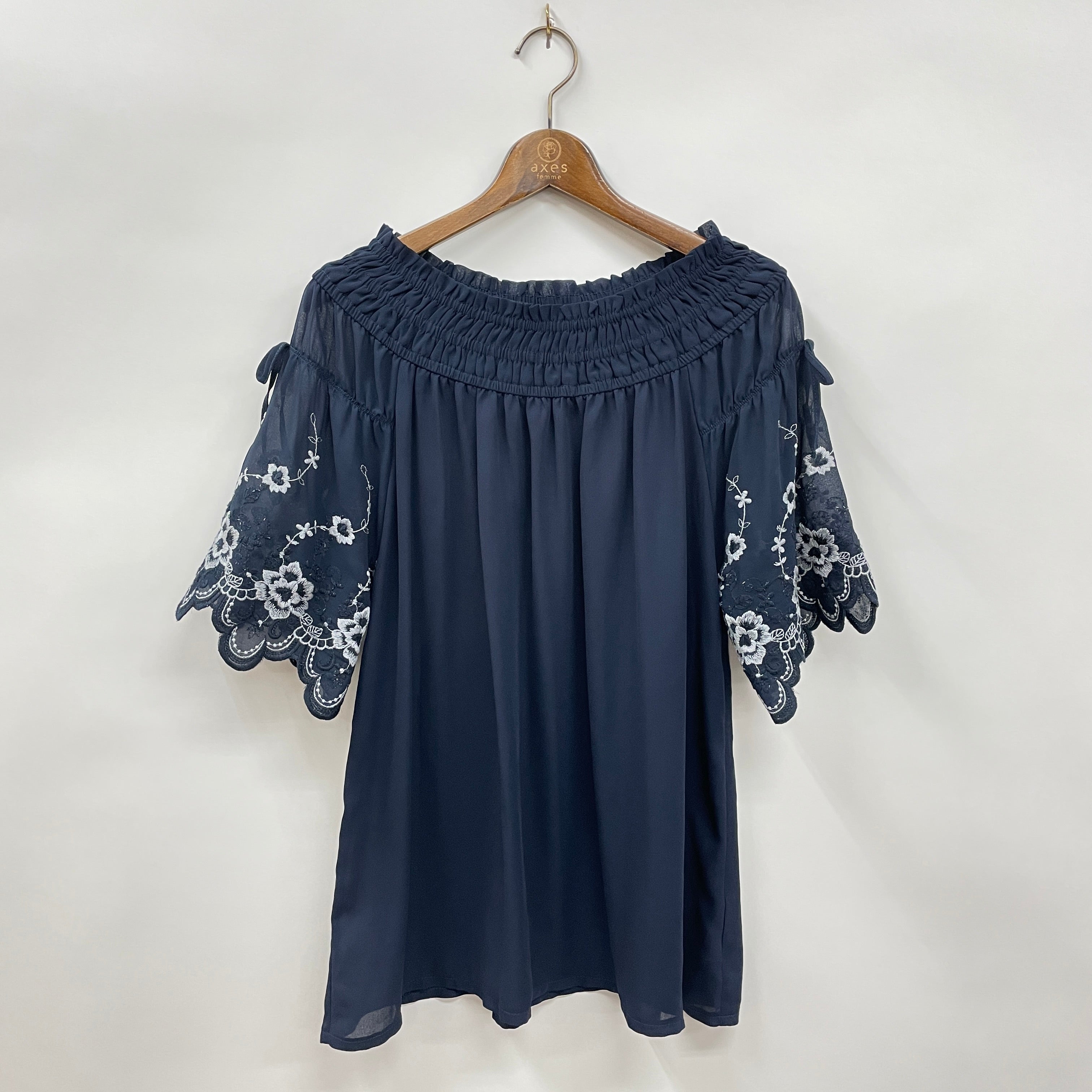 袖にぐるりと花モチーフの刺繍をほどこしたブラウスです。