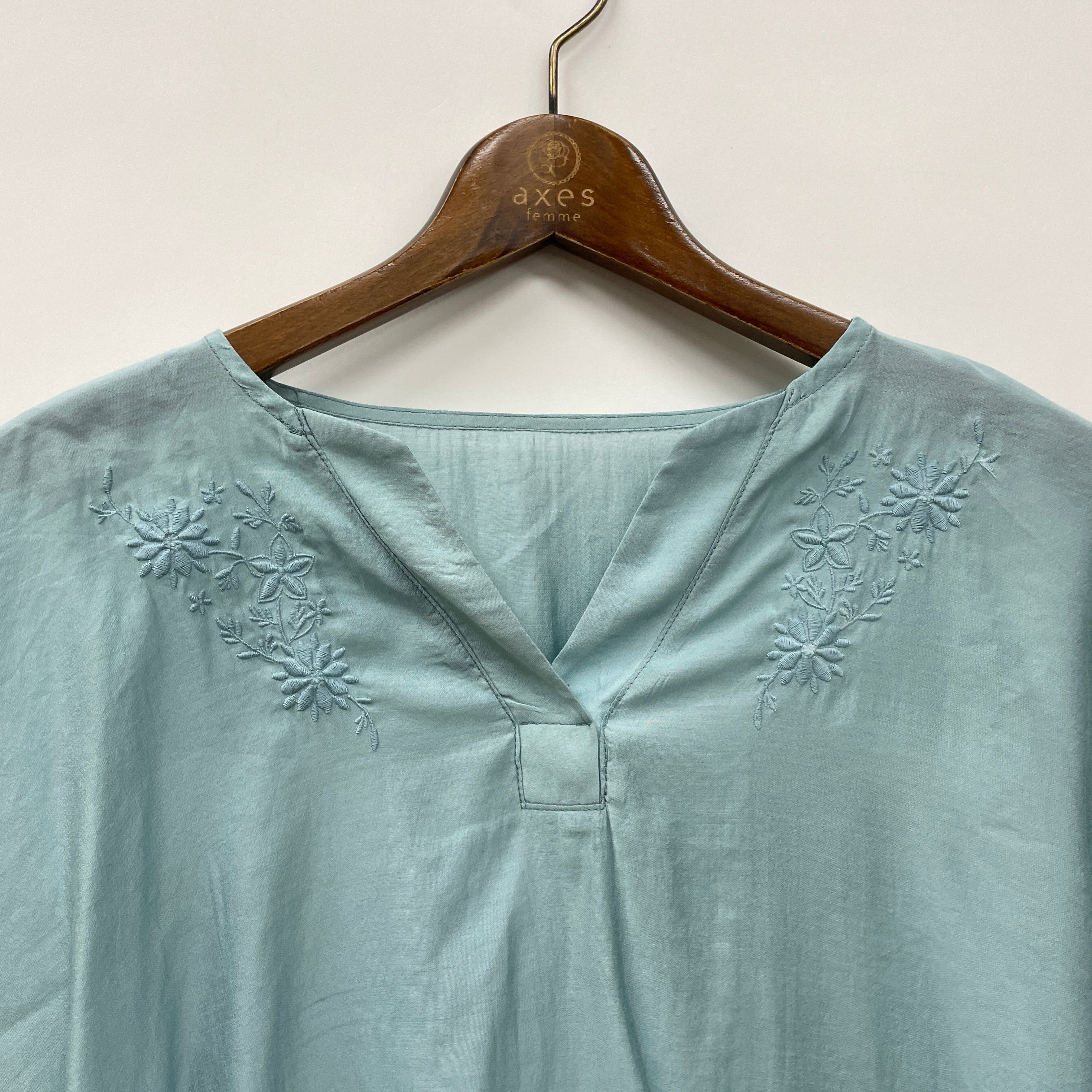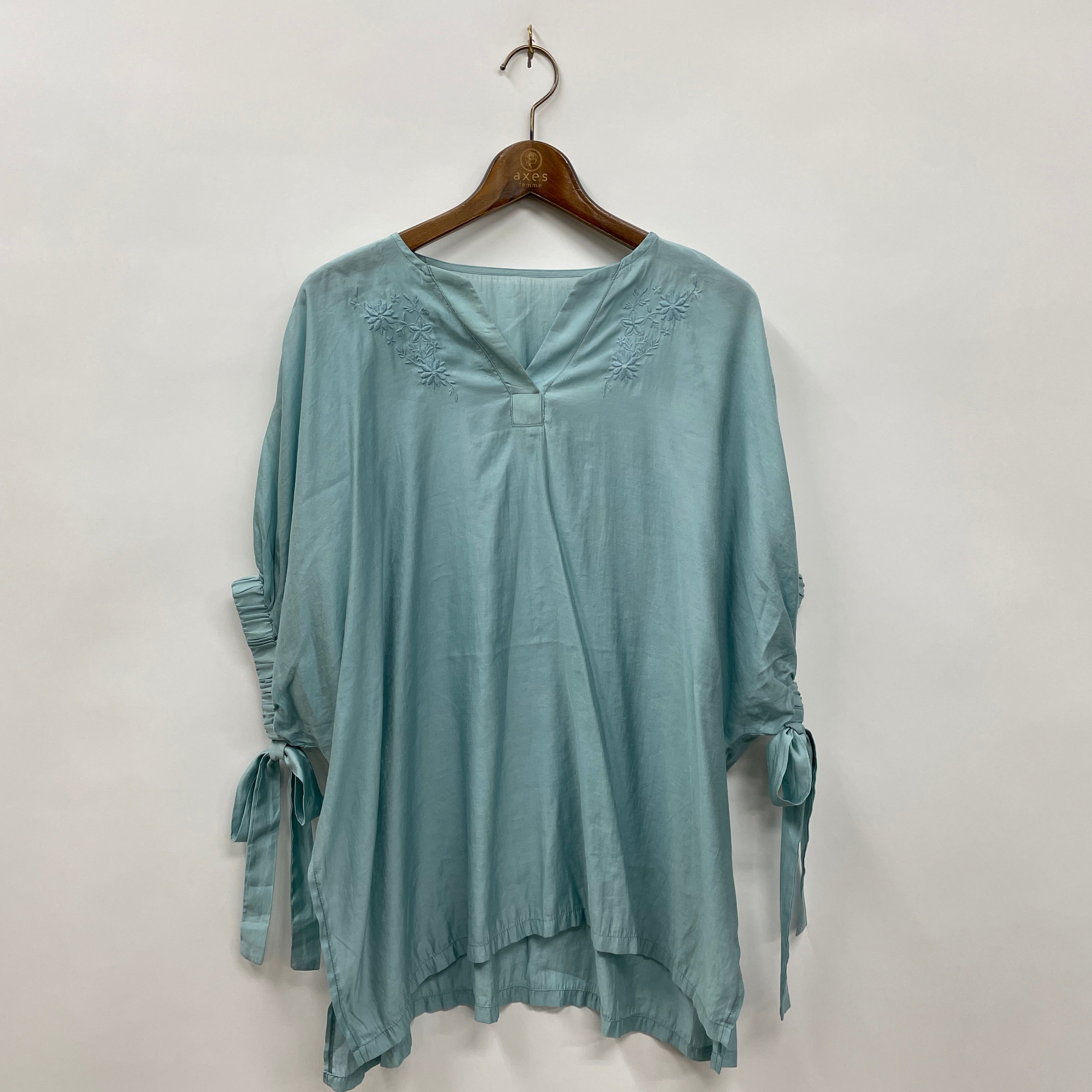 花モチーフの刺繍が胸元を飾る、シャツデザインのチュニックです。